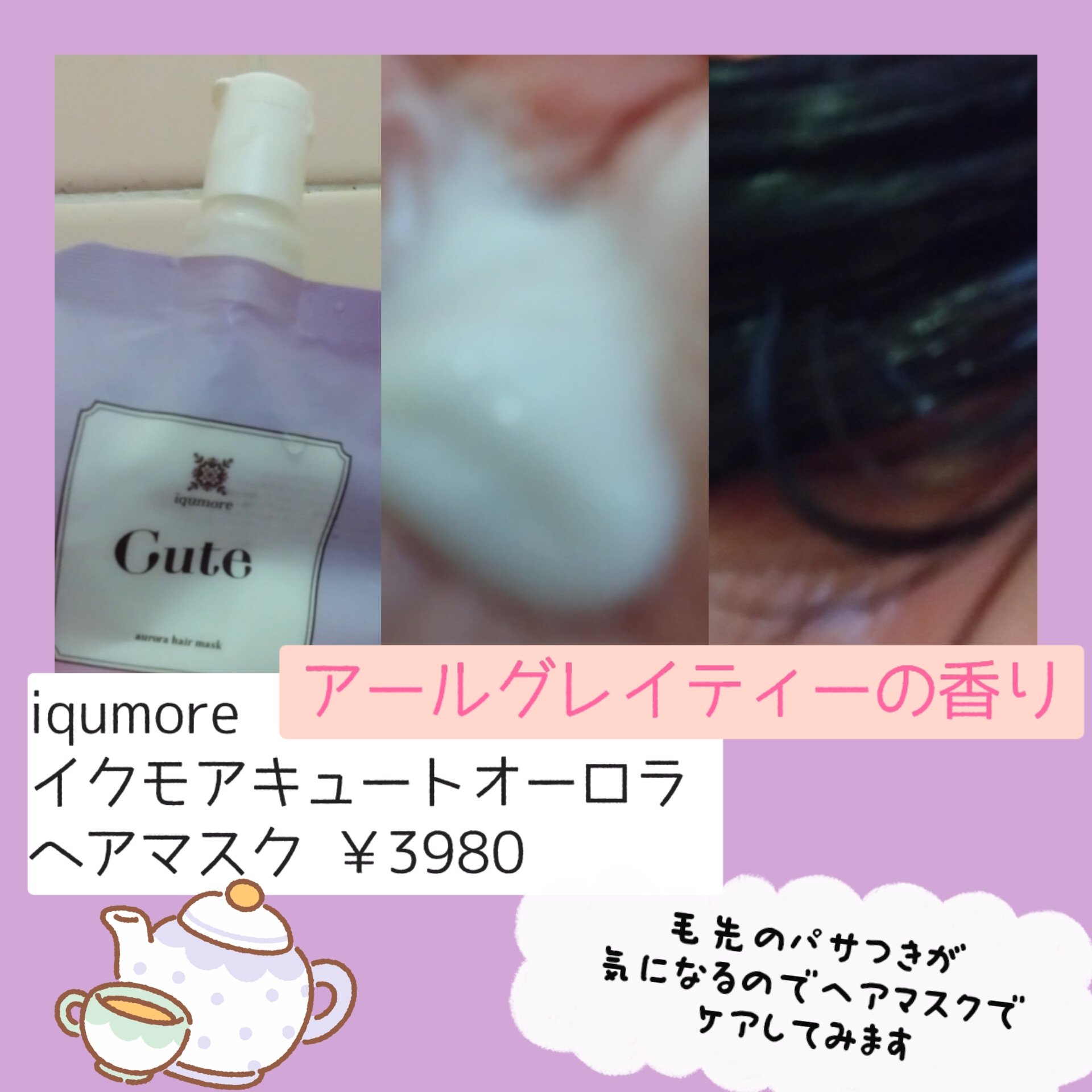 アールグレイティーのさわやかな香り。ダメージ、パサつき気になる髪のダメージケアしたくて、アットコスメTOKYOに行ってきました。Qoo10でも人気のヘアマスク「イクモアキュートオーロラヘアマスク」が目に留まり早速使ってみました。 シルキーカラーコーティングでヘアカラーのカラーキープ処方、ダメージケア成分、うねり抑制に着目したトリートメント。 香りがよくて翌朝の髪が気分良く決まりそうです。おすすめ❤