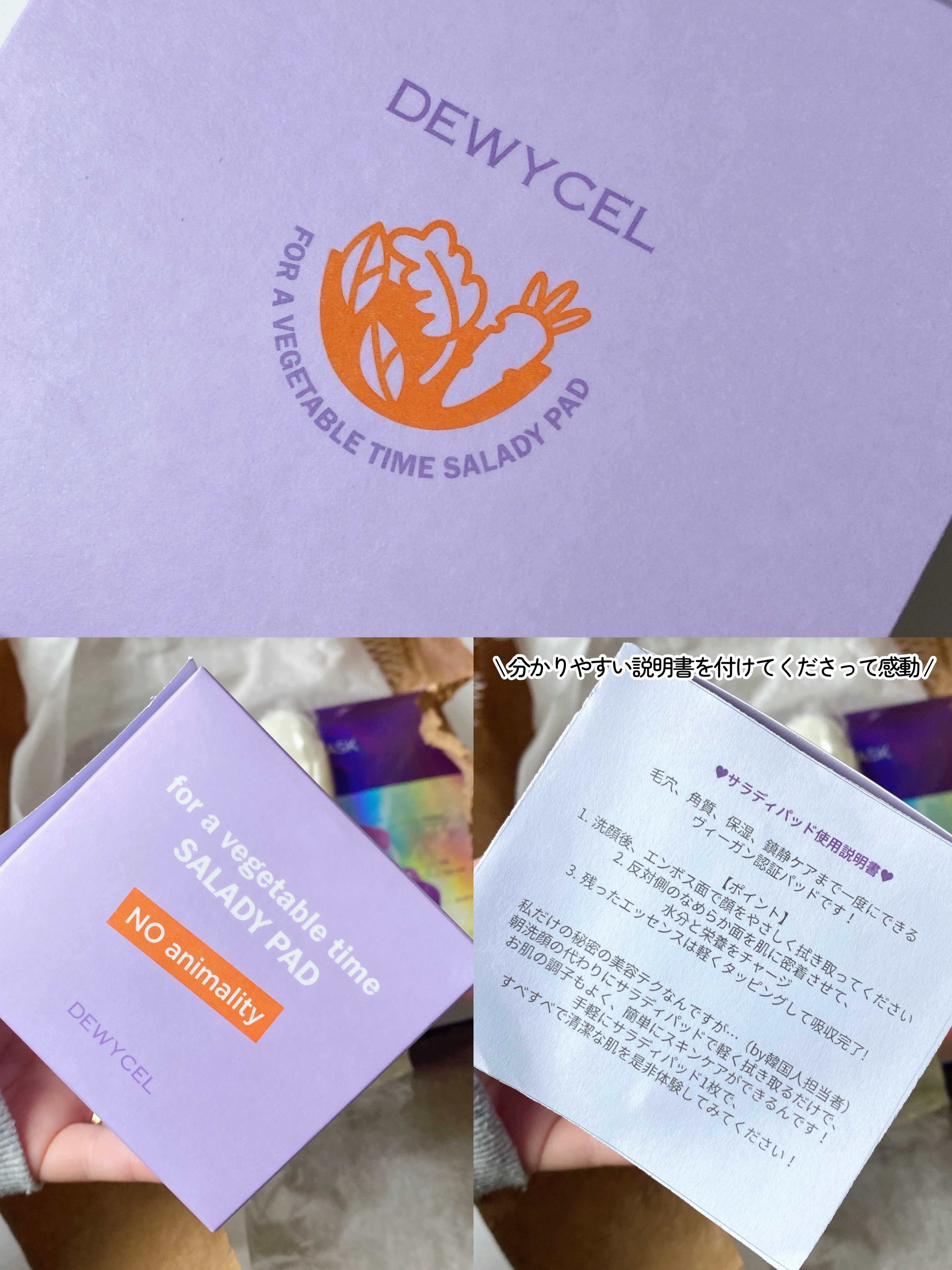 韓国のプレミアムスキンケアビューティーブランド「DEWYCEL(デュイセル)」のスキンケア2点使ったよ♡ サラディパッドは、毛穴・角質ケア、保湿もできるデイリーパッド♪ 洗顔後、凸凹のエンボス加工面でふきとるよ。 マスクは、7つのポイントで顔全体を引っ張る新感覚のリフティングケアができるんだって‼︎