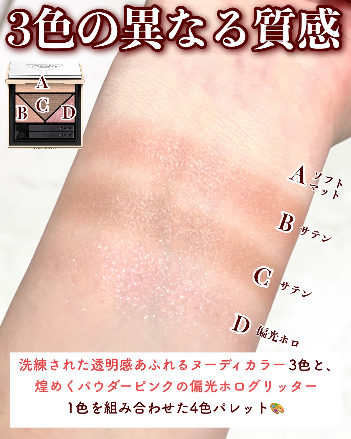 4月16日に発売した新色パレット✨✔️PRADABEAUTYダイメンションズマルチエフェクトアイシャドウ08パンジーしっとりまぶたに密着するクリーミーパウダ洗練された透明感あふれるヌーディカラー3色と、煌めく偏光ホログリッター1色を組み合わせ...