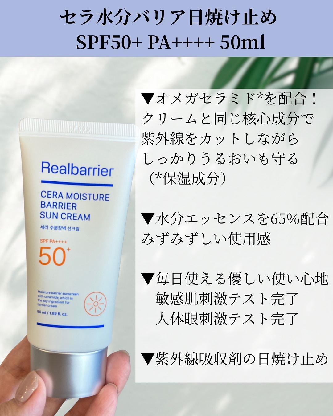 リアルバリア独自開発MLE®技術に独自成分オメガセラミドを適用。▶︎肌バリア機能強化。 日焼け止めのキシキシ感がない。 ✅水分たっぷり乳液みたいな付け心地。 白浮き、トーンアップなし。 ✅目にしみない。刺激少ない。