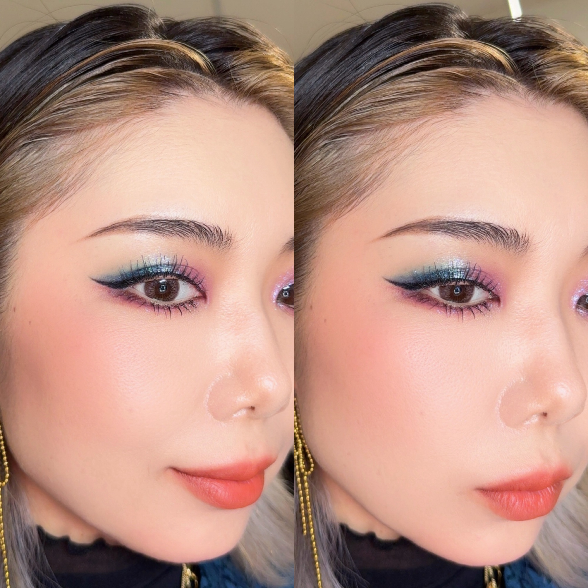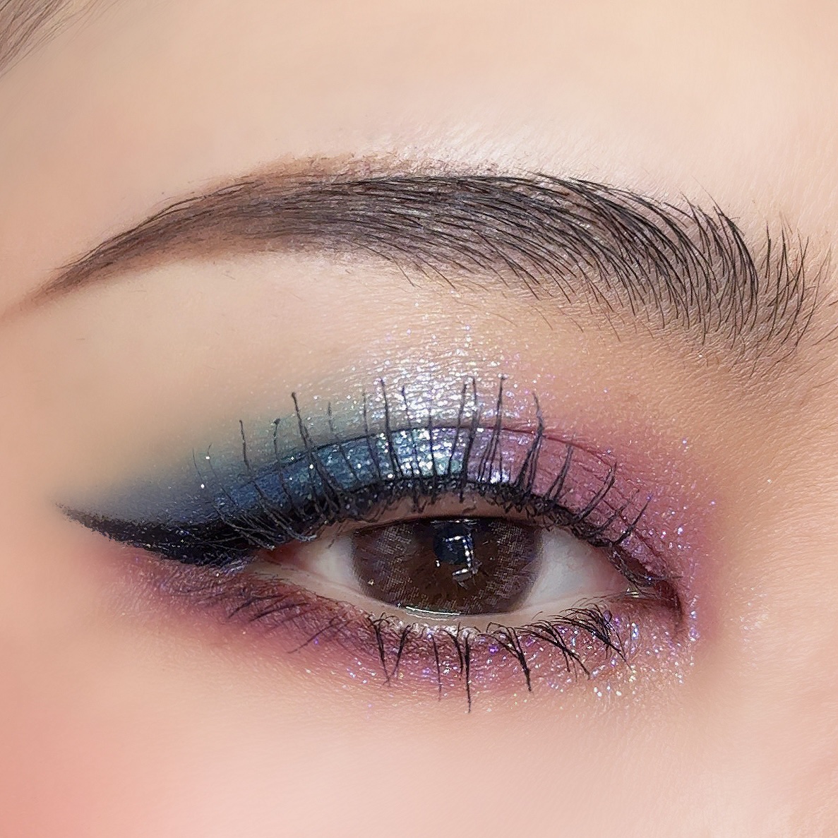 アイシーなピンクと水色のヘイローにしてみたよ🩷🩵やっぱりラメが可愛いパレット🥹✨✨ マットでベースを作ってから、同系色のラメを乗せたヘイローで、下まぶたは馴染みの良いようにベージュとピンクラメにシンプルに❣️ 雪の季節にやりたいメイクが出来たかな🤭☃❄