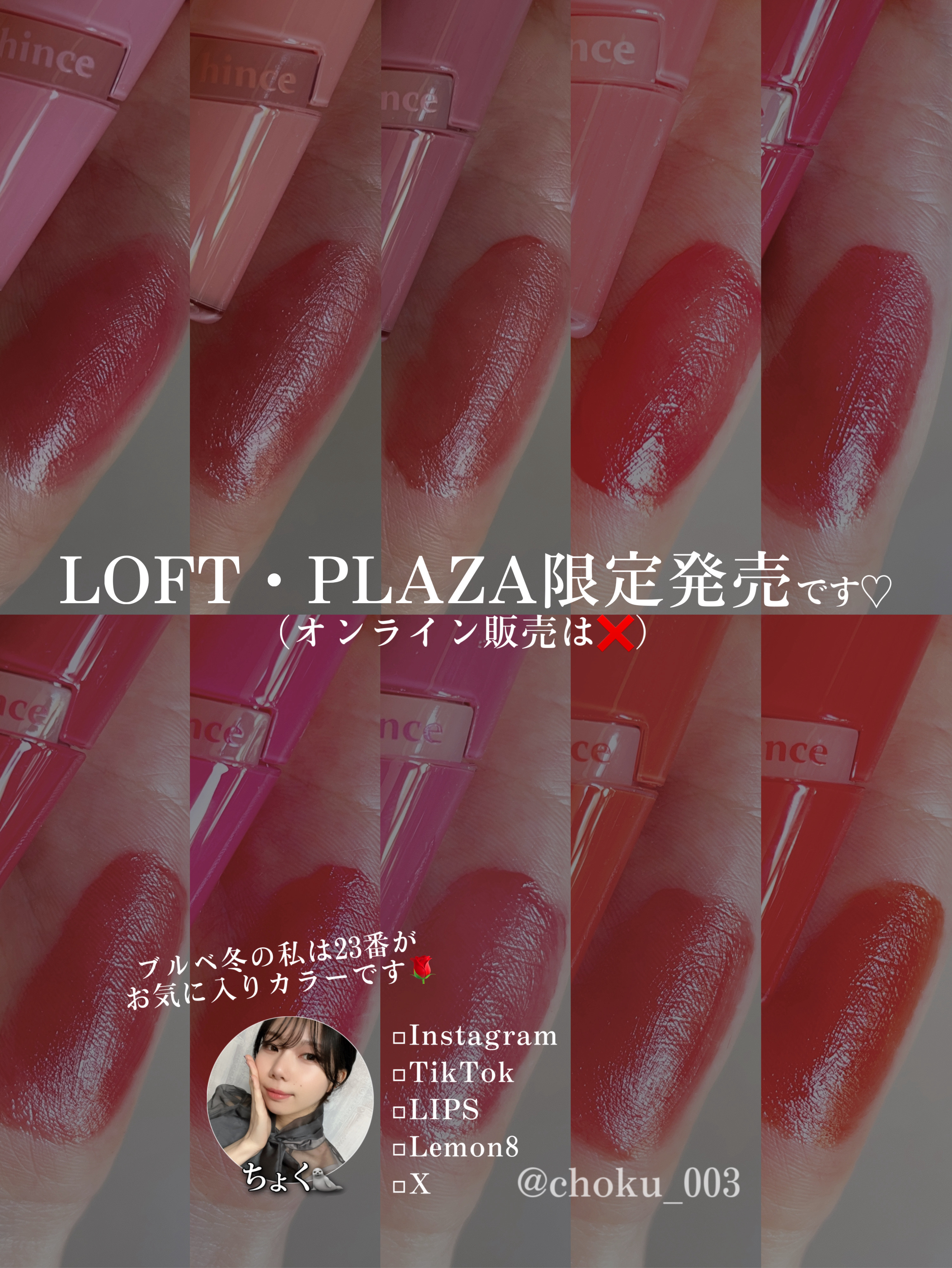- <R001 ベア> 水、ジフェニルジメチコン、オクチルドデカノール、ビスジグリセリルポリアシルアジペート-2、リンゴ酸ジイソステアリル、トリメチルシロキシフェニルジメチコン、水添ポリイソブテン、ジグリセリン、ポリソルベート60、BG、セチルPEG/PPG-10/1ジメチコン、1,2-ヘキサンジオール、ペンチレングリコール、(アクリル酸ヒドロキシエチル/アクリロイルジメチルタウリンNa)コポリマー、セテアレス-20、スクワラン、フェノキシエタノール、酸化チタン、香料、エチルヘキシルグリセリン、黄5、赤227、イソステアリン酸ソルビタン、水酸化Al、ポリアクリル酸アンモニウム、酢酸トコフェロール、黄4、青1、ヒアルロン酸Na、(アルギニン/リシン)ポリペプチド、加水分解ヒアルロン酸、トコフェロール、アセチルヒアルロン酸Na、ソルビン酸 <R002 ロウローズ> 水、ジフェニルジメチコン、オクチルドデカノール、ビスジグリセリルポリアシルアジペート-2、リンゴ酸ジイソステアリル、トリメチルシロキシフェニルジメチコン、水添ポリイソブテン、ジグリセリン、ポリソルベート60、BG、セチルPEG/PPG-10/1ジメチコン、1,2-ヘキサンジオール、ペンチレングリコール、(アクリル酸ヒドロキシエチル/アクリロイルジメチルタウリンNa)コポリマー、セテアレス-20、スクワラン、フェノキシエタノール、酸化チタン、香料、エチルヘキシルグリセリン、黄5、赤227、イソステアリン酸ソルビタン、酢酸トコフェロール、水酸化Al、ポリアクリル酸アンモニウム、ヒアルロン酸Na、青1、加水分解ヒアルロン酸、(アルギニン/リシン)ポリペプチド、トコフェロール、アセチルヒアルロン酸Na、ソルビン酸 <R003 ロウプリコット> 水、ジフェニルジメチコン、オクチルドデカノール、ビスジグリセリルポリアシルアジペート-2、リンゴ酸ジイソステアリル、トリメチルシロキシフェニルジメチコン、水添ポリイソブテン、ジグリセリン、ポリソルベート60、BG、セチルPEG/PPG-10/1ジメチコン、1,2-ヘキサンジオール、ペンチレングリコール、(アクリル酸ヒドロキシエチル/アクリロイルジメチルタウリンNa)コポリマー、セテアレス-20、スクワラン、フェノキシエタノール、香料、エチルヘキシルグリセリン、酸化チタン、黄5、イソステアリン酸ソルビタン、赤227、酢酸トコフェロール、ヒアルロン酸Na、水酸化Al、ポリアクリル酸アンモニウム、加水分解ヒアルロン酸、青1、(アルギニン/リシン)ポリペプチド、トコフェロール、アセチルヒアルロン酸Na、ソルビン酸 <R004 フィーバー> 水、ジフェニルジメチコン、オクチルドデカノール、リンゴ酸ジイソステアリル、ビスジグリセリルポリアシルアジペート-2、トリメチルシロキシフェニルジメチコン、水添ポリイソブテン、ジグリセリン、ポリソルベート60、BG、セチルPEG/PPG-10/1ジメチコン、1,2-ヘキサンジオール、ペンチレングリコール、(アクリル酸ヒドロキシエチル/アクリロイルジメチルタウリンNa)コポリマー、セテアレス-20、スクワラン、フェノキシエタノール、香料、エチルヘキシルグリセリン、黄5、赤227、イソステアリン酸ソルビタン、酢酸トコフェロール、ヒアルロン酸Na、加水分解ヒアルロン酸、(アルギニン/リシン)ポリペプチド、トコフェロール、アセチルヒアルロン酸Na、ソルビン酸 <R005 ハイビスカス> 水、ジフェニルジメチコン、オクチルドデカノール、ビスジグリセリルポリアシルアジペート-2、リンゴ酸ジイソステアリル、トリメチルシロキシフェニルジメチコン、水添ポリイソブテン、ジグリセリン、ポリソルベート60、BG、セチルPEG/PPG-10/1ジメチコン、1,2-ヘキサンジオール、ペンチレングリコール、アクリル酸ヒドロキシエチル/アクリロイルジメチルタウリンNa)コポリマー、セテアレス-20、スクワラン、フェノキシエタノール、香料、エチルヘキシルグリセリン、赤227、黄5、イソステアリン酸ソルビタン、赤104(1)、酢酸トコフェロール、ヒアルロン酸Na、加水分解ヒアルロン酸、(アルギニン/リシン)ポリペプチド、トコフェロール、アセチルヒアルロン酸Na、ソルビン酸 <R006 ロウグレープ> 水、ジフェニルジメチコン、ビスジグリセリルポリアシルアジペート-2、リンゴ酸ジイソステアリル、オクチルドデカノール、トリメチルシロキシフェニルジメチコン、水添ポリイソブテン、ジグリセリン、ポリソルベート60、BG、セチルPEG/PPG-10/1ジメチコン、1,2-ヘキサンジオール、ペンチレングリコール、(アクリル酸ヒドロキシエチル/アクリロイルジメチルタウリンNa)コポリマー、セテアレス-20、スクワラン、酸化チタン、フェノキシエタノール、香料、エチルヘキシルグリセリン、黄5、赤227、イソステアリン酸ソルビタン、水酸化Al、ポリアクリル酸アンモニウム、酢酸トコフェロール、ヒアルロン酸Na、青1、加水分解ヒアルロン酸、(アルギニン/リシン)ポリペプチド、トコフェロール、アセチルヒアルロン酸Na、ソルビン酸 <R007 チル> 水、ジフェニルジメチコン、オクチルドデカノール、ビスジ