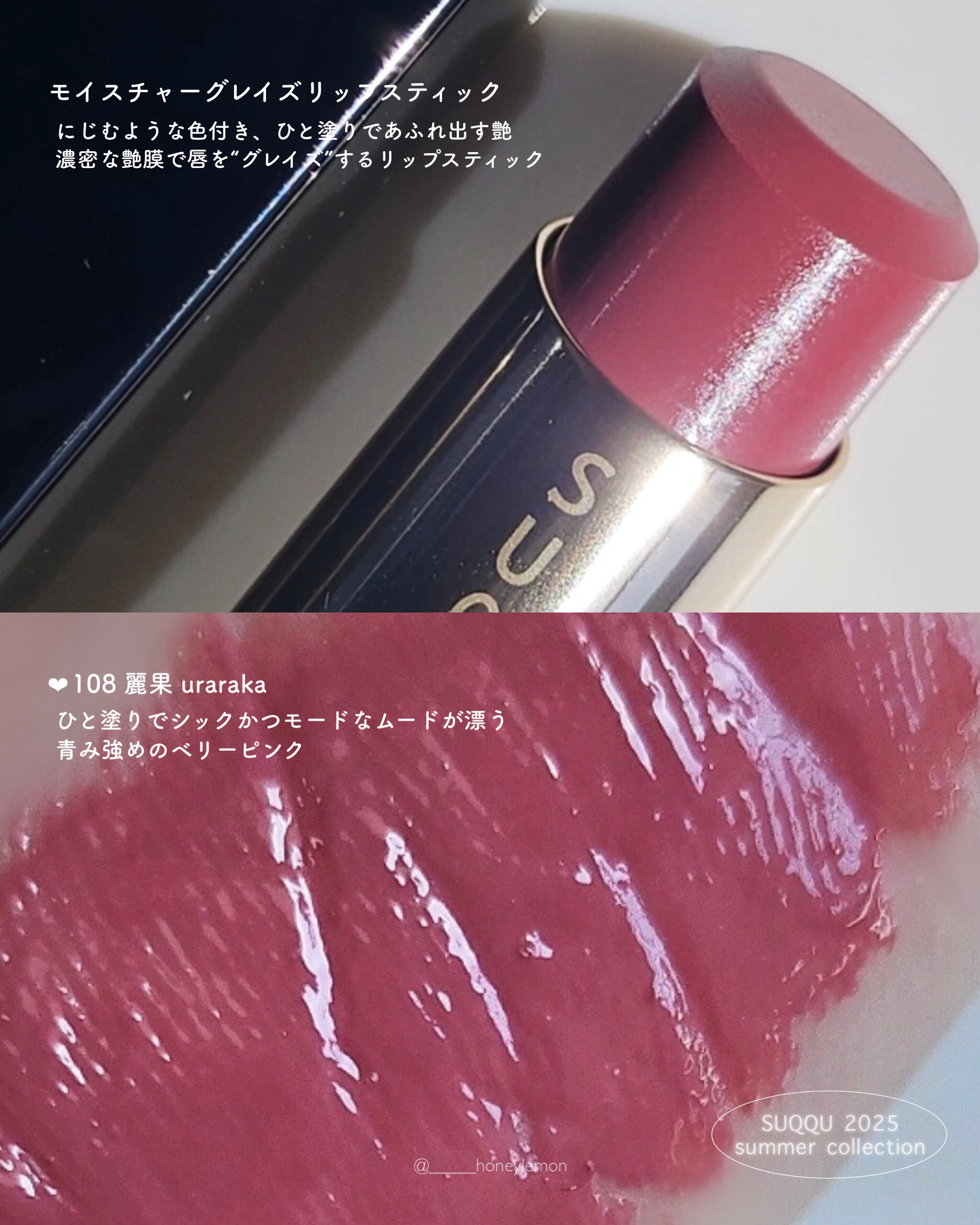 \青みのベリーピンクが今の気分🫐🍓/▶︎SUQQUモイスチャーグレイズリップスティック108麗果-URARAKAもう1色!購入したのはブルベ歓喜な青みピンクの「108麗果」✨ほんのーりくすみを感じる青みのピンクで、パキッとしすぎてない発色がよ...