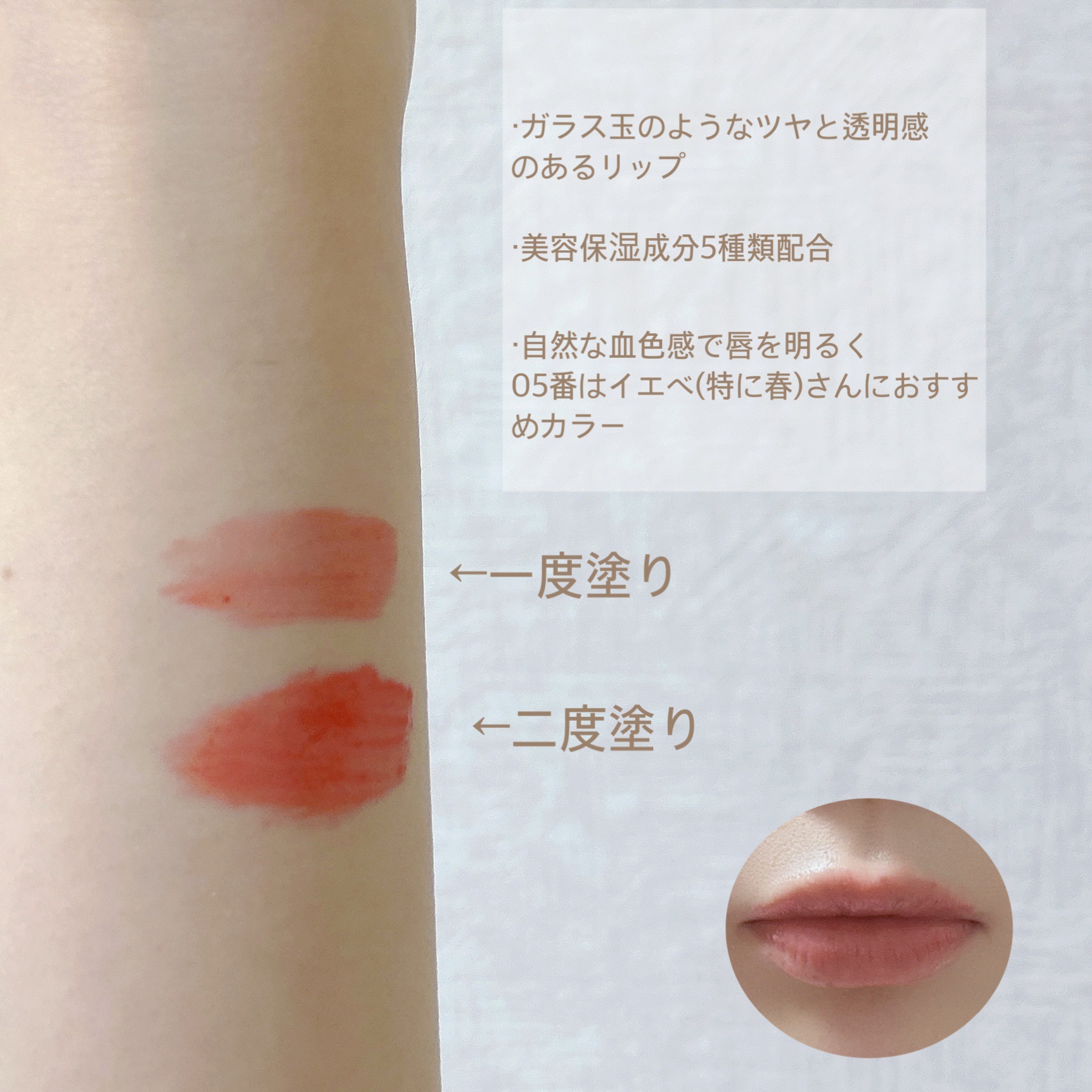 - ちゅるりんツヤ×シアー✨ ガラス玉みたいなティントリップ ガラス玉のようなちゅるりんとしたツヤ🫧 透明感のある美発色がティント効果で長持ち 「色持ちもシアー感も両方叶えたい!」そんな方にオススメ♡ なめらかな塗り心地でムラなく唇にフィット💋 唇の縦じわが目立ちにくく、ぷるんとしたボリュームのある仕上がりです。 ※メイクアップ効果による 美容保湿成分5種配合。 (アラントイン、セラミドNP、ナイアシンアミド、レチノール、ツボクサエキス) しっとりとしたうるおいが持続します。