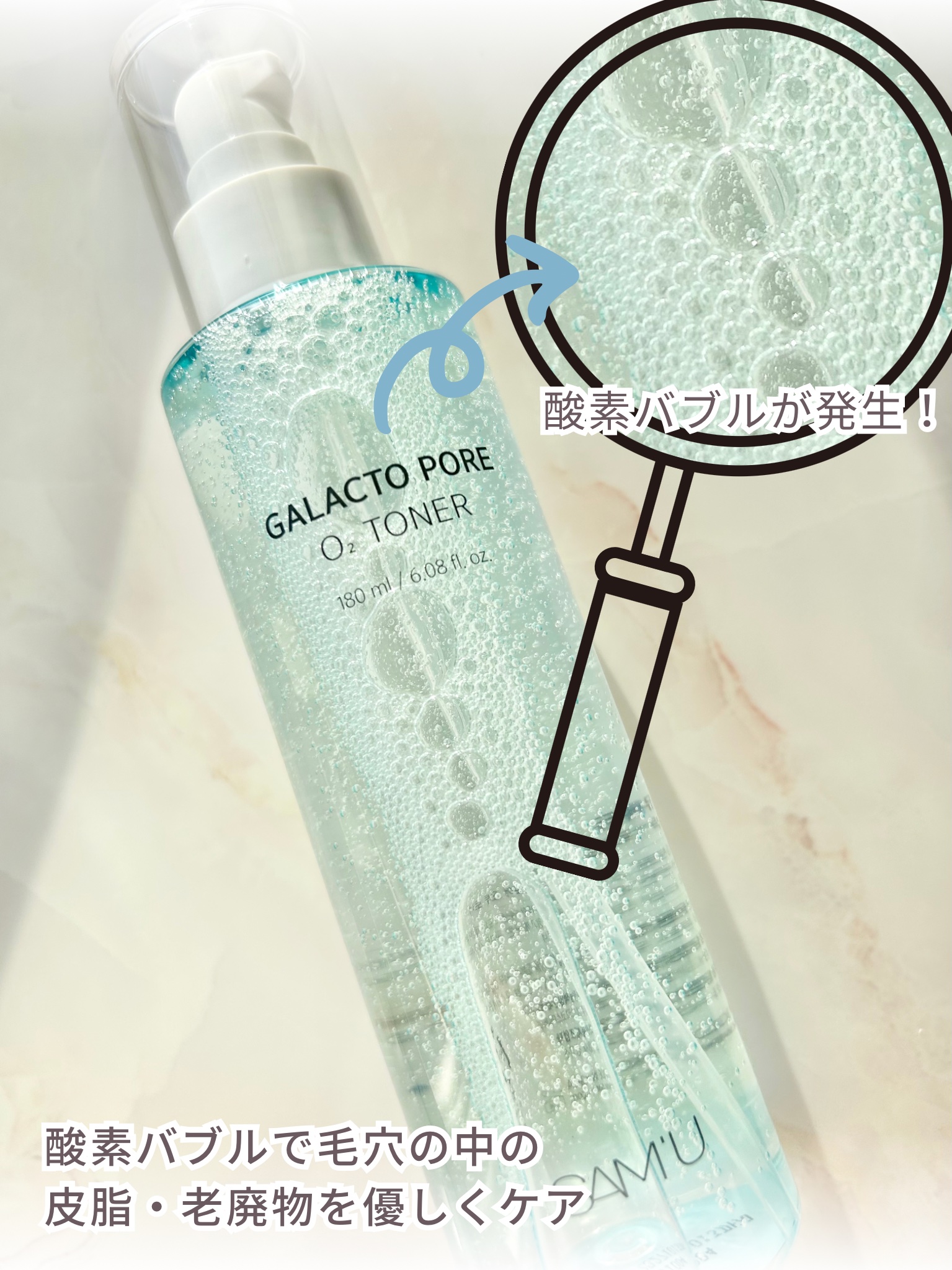 - ガラクトシリーズより新しく登場したガラクトポアオーツー(O2)トナー。 新感覚の酸素を含んだバブルエッセンスが毛穴奥の老廃物や過剰な皮脂で塞がれている毛穴をクリアにして肌のキメを整えます。 また、トナーに含まれた酸素は肌に活力を与え、より効果的に老廃物の排出を促すことで肌のデトックス効果を促します。 ガラクト酵母成分により敏感なお肌でも刺激を与えずに毛穴ケアが可能です。 しっとりべたつきのないテクスチャーでお肌に負担なく朝晩使用でき、さらに毛穴開きを防ぐため肌表面に潤いを与えます。 皮膚低刺激テスト完了済により敏感肌の方もご使用いただけます。 <特長成分> 酸素 : 酸素バブルで毛穴に詰まった老廃物を効果的に除去されるようサポート。(皮脂、角質除去) ガラクトミセス発酵ろ過物 : 肌にやさしい天然酵母により、低刺激に角質除去サポート。(角質除去) ウィッチヘーゼル : 毛穴の引き締めや皮脂分泌を調節ケアに効果的。( 整肌成分 ) PHA : 敏感肌でも使用できる角質ケア成分配合。(角質除去) <テクスチャー&香り> - テクスチャー しっとり伸びやすく肌になじみやすいテクスチャー - 香り シトラスハーブ系