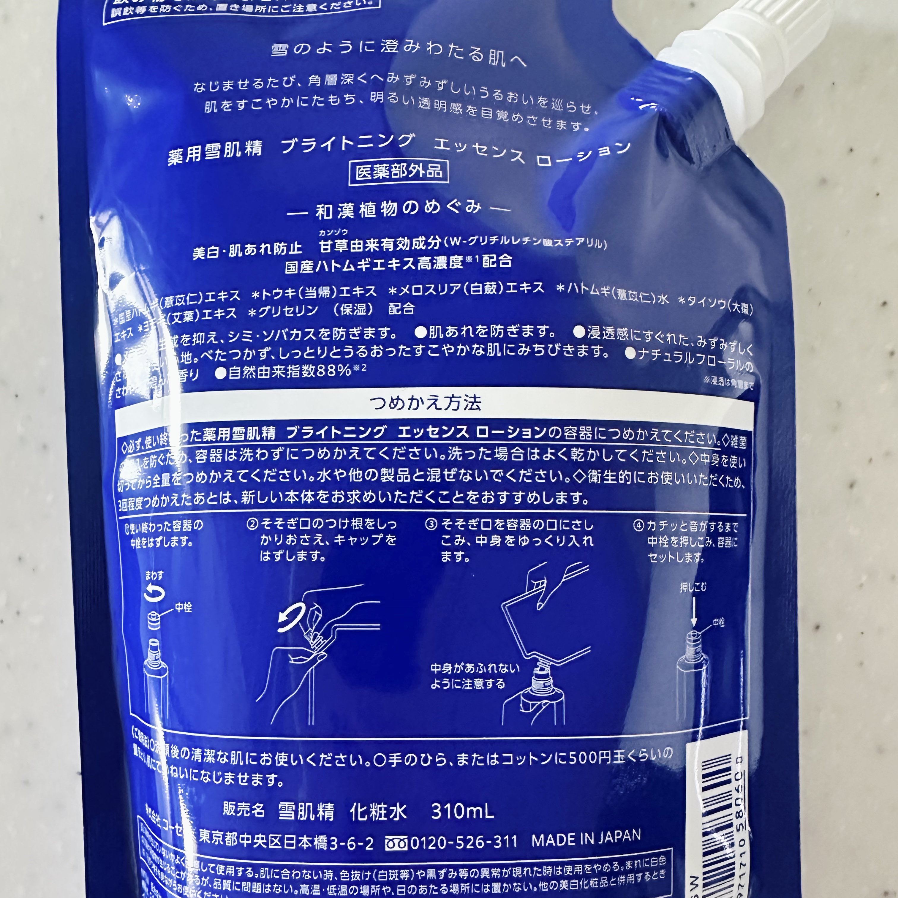- 【医薬部外品】 みずみずしい透明素肌へと導く薬用美白化粧水。 美白・肌あれ防止の甘草由来有効成分(W-グリチルレチン酸ステアリル(※16))配合。 国産ハトムギエキス(保湿)を高濃度(※17)に配合し、肌本来の透明感を引き出します。 なじませるたび、角層深くへみずみずしいうるおいを巡らせ、肌をすこやかにたもち、明るい透明感を目覚めさせます。 ・メラニンの生成を抑え、シミ・ソバカスを防ぎます。 ・肌あれを防ぎます。 ・にきびを防ぎます。 ・日やけ、雪やけ後のほてりを防ぎます。 ・かみそりまけを防ぎます。 (※16)グリチルレチン酸ステアリルSW (※17)ブランド内比 <つめかえ用キット (310ml+24ml+10g):セット内容> ・薬用雪肌精 ブライトニング エッセンス ローション (つめかえ用レフィル) 310ml ・薬用雪肌精 ブライトニング エマルジョン 24ml ・薬用雪肌精 ブライトニング クリーム 10g ※セット商品の成分につきましては各商品ページでご確認ください。 <キット 2 (200ml+10g)(限定):セット内容> ・薬用雪肌精 ブライトニング エッセンス ローション 200ml ・薬用雪肌精 ブライトニング クリーム 10g ※セット商品の成分につきましては各商品ページでご確認ください。 <キット(200ml+24ml)(限定):セット内容> ・薬用雪肌精 ブライトニング エッセンス ローション 200ml ・薬用雪肌精 ブライトニング エマルジョン 24ml ※セット商品の成分につきましては各商品ページでご確認ください。