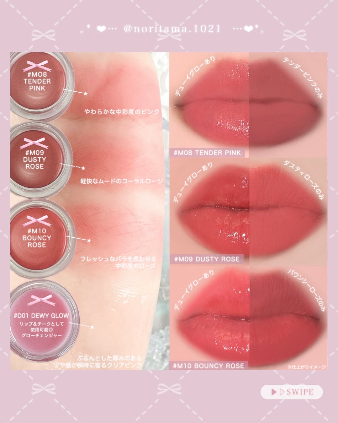 - <D01 デューイグロー> オクチルドデカノール、ジイソステアリルマレート、ビス-ベヘニル/イソステアリル/フィトステリルジメリノール酸ジメリノレイン酸、エチルセルロース、マイクロクリスタリンワックス、合成ワックス、フェノキシエタノール、カプリリルグリコール、シメチコン、エチルヘキシルグリセリン、香料、酸化チタン、赤色202号、精製水、赤色104号(1)、1,2-ヘキサンジオール、ヒアルロン酸ナトリウム、加水分解ヒアルロン酸トリモニウム、アセチル化ヒアルロン酸ナトリウム、加水分解ヒアルロン酸、ヒアルロン酸、加水分解ヒアルロン酸ナトリウム、ヒアルロン酸ナトリウムクロスポリマー、ヒアルロン酸カリウム <H01 トーンアップバーム> カプリル酸/カプリン酸トリグリセリド、オクチルドデカノール、マイカ、ポリグリセリル-2トリイソステアリン酸、ビスジグリセリルポリアシルアジペート-2、酸化チタン、シリカ、C13-15アルカン、合成ワックス、ポリグリセリル-3ポリリシノレイン酸、VP/ヘキサデセンコポリマー、マイクロクリスタリンワックス、合成ミツロウ、ソルビタンイソステアレート、ジステアリルジモニウムヘクトライト、カプリル酸/カプリン酸グリセリズ、カプリリルグリコール、ステアリン酸、香料、BHT <M01 コーラル> イメティコン、ダイメチコンクロスポリマー、トリベヘニン、ビニールダイメティコン/メティコンシルセスキオクセインクロスポリマー、ダイアイソステアリルマレート、ポリグリセリル-2トライアイソステアレート、セティルピージ/ピーピージ-10/1ダイメティコン、トリメチルシロキシシリケート、ポリグリセリル-4アイソステアレート、ココ-カプリレート/カプリレート、1,2-ヘキサンジオール、アイソドデケイン、ポリグリセリル-3ポリリシノリエート、チタンジオキシド、ダイステアーダエモニウムヘクトライト、黄色4号、ソルビタンアイソステアレート、赤色104(1)、ポリヒドロキシステアリックアシッド、シリカシリレート、黄色5号、赤色202号、レシチン、イソプロピルミリステイト、アイソステアリックアシッド、エチルヘキシルパルミテート、香料、ペンタエリスリチルテトラ-ダイ-t-ブチルヒドロキシヒドロキシシンナメート、黒色酸化鉄 <M02 ロージコーラル> ダイメティコン、ダイメチコンクロスポリマー、トリベヘニン、ビニールダイメティコン/メティコンシルセスキオクセインクロスポリマー、ダイアイソステアリルマレート、ポリグリセリル-2トライアイソステアレート、セティルピージ/ピーピージ-10/1ダイメティコン、トリメチルシロキシシリケート、ポリグリセリル-4アイソステアレート、ココ-カプリレート/カプリレート、1,2-ヘキサンジオール、チタンジオキシド、アイソドデケイン、ポリグリセリル-3ポリリシノリエート、ダイステアーダエモニウムヘクトライト、黄色5号、ソルビタンアイソステアレート、ポリヒドロキシステアリックアシッド、黄色4号、シリカシリレート、赤色202号、レシチン、赤色酸化鉄、イソプロピルミリステイト、アイソステアリックアシッド、エチルヘキシルパルミテート、香料、黒色酸化鉄、ペンタエリスリチルテトラ-ダイ-t-ブチルヒドロキシヒドロキシシンナメート、黄色酸化鉄、青色1号 <M03 フォグピンク> ダイメティコン、ダイメチコンクロスポリマー、トリベヘニン、ビニールダイメティコン/メティコンシルセスキオクセインクロスポリマー、ダイアイソステアリルマレート、ポリグリセリル-2トライアイソステアレート、セティルピージ/ピーピージ-10/1ダイメティコン、トリメチルシロキシシリケート、ポリグリセリル-4アイソステアレート、チタンジオキシド、ココ-カプリレート/カプリレート、1,2-ヘキサンジオール、アイソドデケイン、ポリグリセリル-3ポリリシノリエート、ダイステアーダエモニウムヘクトライト、ソルビタンアイソステアレート、ポリヒドロキシステアリックアシッド、黄色5号、シリカシリレート、赤色202号、レシチン、イソプロピルミリステイト、アイソステアリックアシッド、エチルヘキシルパルミテート、香料、黒色酸化鉄、ペンタエリスリチルテトラ-ダイ-t-ブチルヒドロキシヒドロキシシンナメート、赤色104号(1)、黄色4号、青色1号 <M04 ピーチピンク> ダイメティコン、ダイメチコンクロスポリマー、トリベヘニン、ビニールダイメティコン/メティコンシルセスキオクセインクロスポリマー、ダイアイソステアリルマレート、ポリグリセリル-2トライアイソステアレート、セティルピージ/ピーピージ-10/1ダイメティコン、トリメチルシロキシシリケート、ポリグリセリル-4アイソステアレート、ココ-カプリレート/カプリレート、チタンジオキシド、1,2-ヘキサンジオール、アイソドデケイン、ポリグリセリル-3ポリリシノリエート、ダイステアーダエモニウムヘクトライト、ソルビタンアイソステアレート、黄色5号、ポリヒドロキシステアリックアシッド、シリカシリレート、