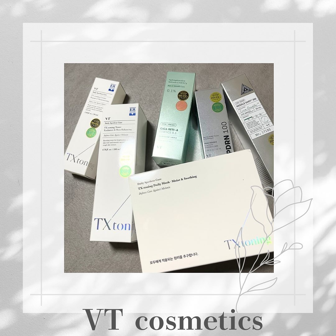 VT史上初!メガ割最大お得セットが登場✨ どんな成分とも使える色素沈着ケア【TXトーニングライン】をメインにリードルショットの有無、エッセンスを悩み別に選べるセット「TX自慢すっぴんセット」が発売されます。 「レチノール成分」配合で夜の使用をおすすめ! 目立ち始めた毛穴、ぽっかり開いた毛穴、たるんで広がる毛穴にお悩みの方に。 TXトーニングライン最後の仕上げ、潤う保湿膜でしっかり美容成分を閉じこめます。
