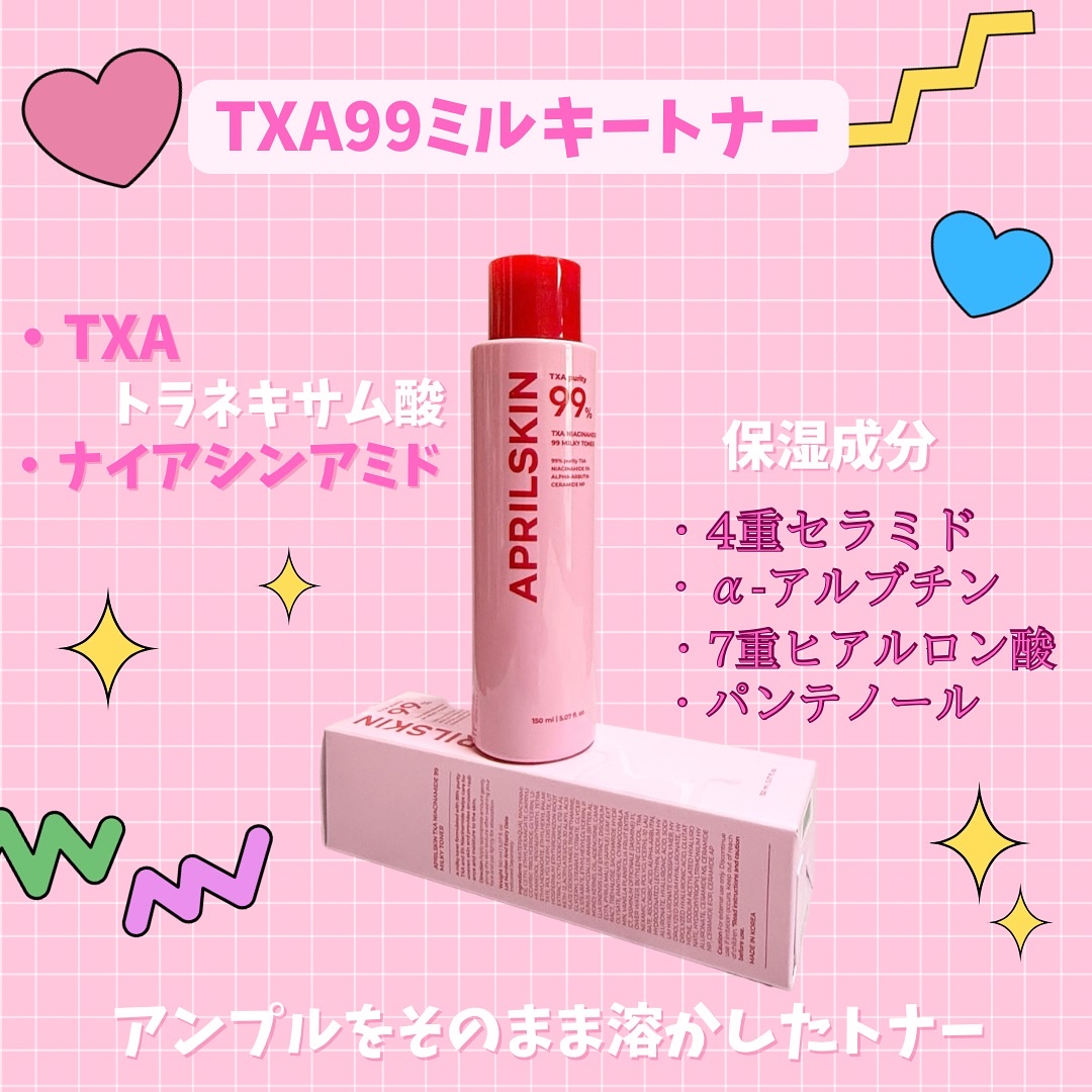 可愛いピンクのスキンケア💓▫️APRILSKIN・TXA99ディープクレンザー・TXAトーニングショット99セラム・TXA99ミルキートナートラネキサム酸とナイアシンアミドを配合したスキンケアシリーズの3アイテム。セット使いで明るくいきいきと...