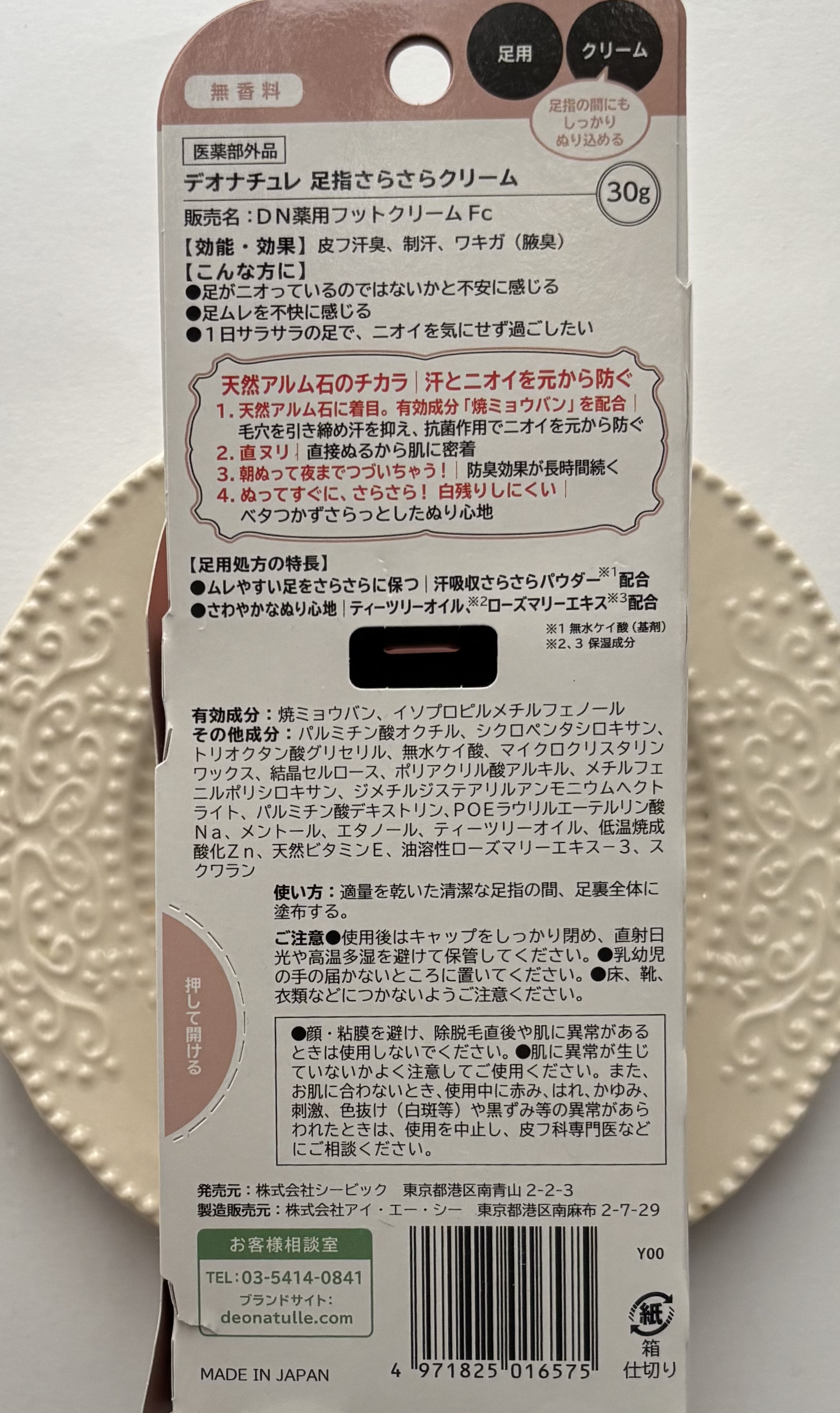 - \11年間ず~っと売上No.1*直ヌリ制汗デオドラントブランド/ 『防臭力のデオナチュレ』シリーズから、足特有のムレ・ニオイを防ぐ足用処方「薬用デオナチュレ足指さらさらクリーム」 ◆◆靴、脱ぐの⁈とドキッとすること、ありませんか?◆◆ 足は1日コップ約1杯分の汗をかき、ムレて、ニオイやすい だから、デオナチュレの足用でケア! ◆◆ユーザーから選ばれる理由◆◆ 1.天然アルム石に着目。有効成分「焼ミョウバン」を配合し、汗・ニオイを元から防ぐ! 足汗吸収さらさらパウダー**やティーツリーハーブ・ローズマリーエキス***を配合 2.ニオイの発生源に“直ヌリ”で、朝ぬって夜まで続いちゃう! 3.クリームなのに、ベタつかず・白残りしにくい ==注意== ●顔・粘膜を避け、除脱毛直後や肌に異常があるときは使用しないでください。●肌に異常が生じていないかよく注意してご使用ください。また、お肌に合わないとき、使用中に赤み、はれ、かゆみ、刺激、色抜け(白班等)や黒ずみ等の異常があらわれたときは、使用を中止し、皮フ科専門医などにご相談ください。●使用後はキャップをしっかり閉め、直射日光や高温多湿を避けて保管してください。●乳幼児の手の届かないところに置いてください。●床、靴、衣類などにつかないようご注意ください。 販売名:DN薬用フットクリームFc *インテージSRI+直ヌリ制汗剤市場(形状:ロールオン・スティック・クリーム・ジェル・パウダー) 2013年5月~2024年4月 デオナチュレシリーズ 累計販売金額 **基剤:無水ケイ酸 ***保湿成分