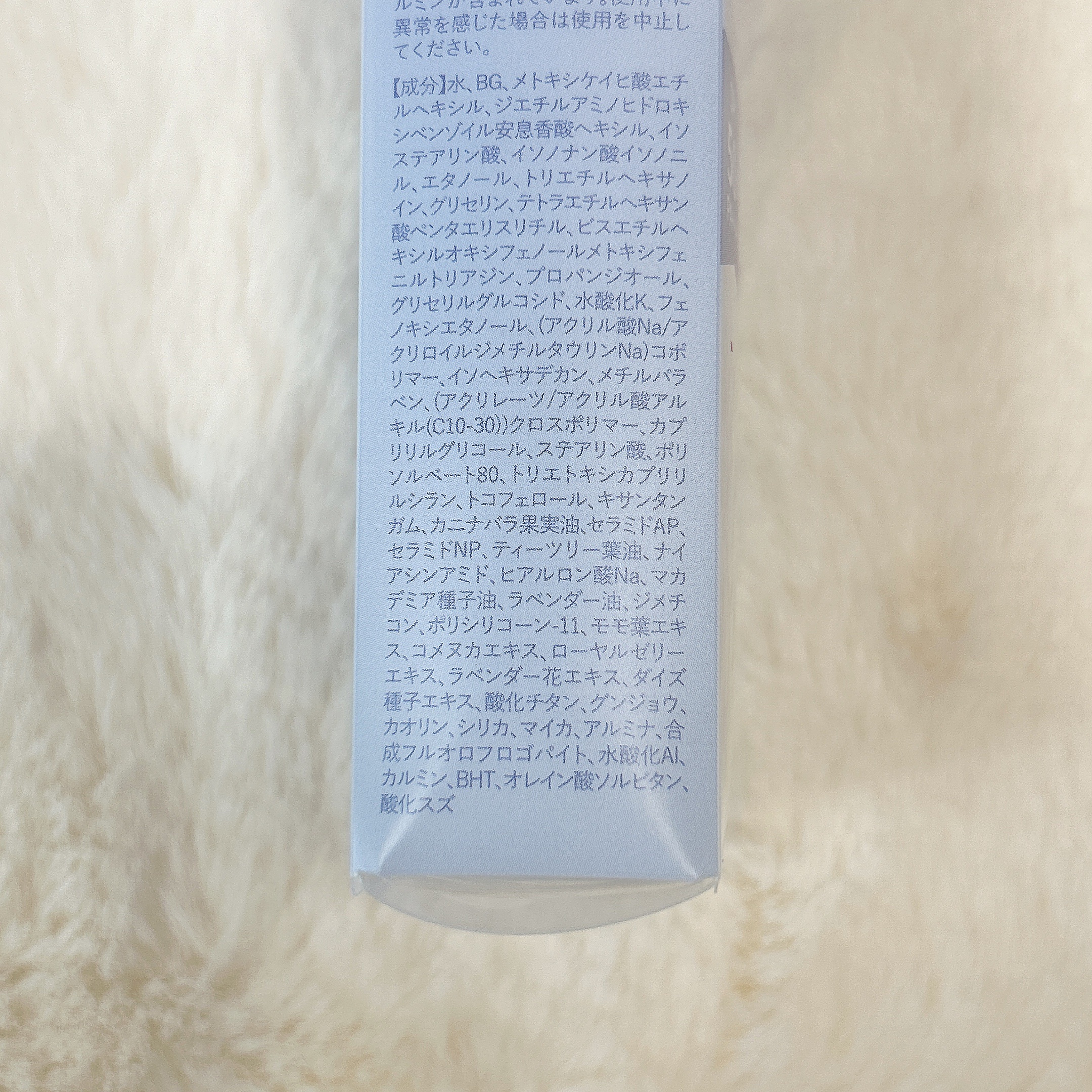 - <ラベンダー> 水、BG、メトキシケイヒ酸エチルヘキシル、ジエチルアミノヒドロキシベンゾイル安息香酸ヘキシル、イソステアリン酸、イソノナン酸イソノニル、エタノール、トリエチルヘキサノイン、グリセリン、テトラエチルヘキサン酸ペンタエリスリチル、ビスエチルヘキシルオキシフェノールメトキシフェニルトリアジン、プロパンジオール、グリセリルグルコシド、水酸化K、フェノキシエタノール、(アクリル酸Na/アクリロイルジメチルタウリンNa)コポリマー、イソヘキサデカン、メチルパラベン、(アクリレーツ/アクリル酸アルキル(C10-30))クロスポリマー、カプリリルグリコール、ステアリン酸、ポリソルベート80、トリエトキシカプリリルシラン、トコフェロール、キサンタンガム、カニナバラ果実油、セラミドAP、セラミドNP、ティーツリー葉油、ナイアシンアミド、ヒアルロン酸Na、マカデミア種子油、ラベンダー油、ジメチコン、ポリシリコーン-11、モモ葉エキス、コメヌカエキス、ローヤルゼリーエキス、ラベンダー花エキス、ダイズ種子エキス、酸化チタン、酸化鉄、グンジョウ、カオリン、シリカ、マイカ、アルミナ、合成フルオロフロゴパイト、水酸化Al、カルミン、BHT、オレイン酸ソルビタン、酸化スズ <ミント> 水、BG、メトキシケイヒ酸エチルヘキシル、ジエチルアミノヒドロキシベンゾイル安息香酸ヘキシル、イソステアリン酸、イソノナン酸イソノニル、エタノール、トリエチルヘキサノイン、グリセリン、テトラエチルヘキサン酸ペンタエリスリチル、ビスエチルヘキシルオキシフェノールメトキシフェニルトリアジン、プロパンジオール、グリセリルグルコシド、水酸化K、フェノキシエタノール、(アクリル酸Na/アクリロイルジメチルタウリンNa)コポリマー、イソヘキサデカン、メチルパラベン、(アクリレーツ/アクリル酸アルキル(C10-30))クロスポリマー、カプリリルグリコール、ステアリン酸、ポリソルベート80、トリエトキシカプリリルシラン、トコフェロール、キサンタンガム、カニナバラ果実油、セラミドAP、セラミドNP、ティーツリー葉油、ナイアシンアミド、ヒアルロン酸Na、マカデミア種子油、ラベンダー油、ジメチコン、ポリシリコーン-11、モモ葉エキス、コメヌカエキス、ローヤルゼリーエキス、ラベンダー花エキス、ダイズ種子エキス、酸化チタン、酸化鉄、グンジョウ、カオリン、シリカ、マイカ、アルミナ、合成フルオロフロゴパイト、水酸化Al、カルミン、BHT、オレイン酸ソルビタン、酸化スズ <レモン> 水、BG、メトキシケイヒ酸エチルヘキシル、ジエチルアミノヒドロキシベンゾイル安息香酸ヘキシル、イソステアリン酸、イソノナン酸イソノニル、エタノール、トリエチルヘキサノイン、グリセリン、テトラエチルヘキサン酸ペンタエリスリチル、ビスエチルヘキシルオキシフェノールメトキシフェニルトリアジン、プロパンジオール、グリセリルグルコシド、水酸化K、フェノキシエタノール、(アクリル酸Na/アクリロイルジメチルタウリンNa)コポリマー、イソヘキサデカン、メチルパラベン、(アクリレーツ/アクリル酸アルキル(C10-30))クロスポリマー、カプリリルグリコール、ステアリン酸、ポリソルベート80、トリエトキシカプリリルシラン、トコフェロール、キサンタンガム、カニナバラ果実油、セラミドAP、セラミドNP、ティーツリー葉油、ナイアシンアミド、ヒアルロン酸Na、マカデミア種子油、ラベンダー油、ジメチコン、ポリシリコーン-11、モモ葉エキス、コメヌカエキス、ローヤルゼリーエキス、ラベンダー花エキス、ダイズ種子エキス、酸化チタン、酸化鉄、グンジョウ、カオリン、シリカ、マイカ、アルミナ、合成フルオロフロゴパイト、水酸化Al、カルミン、BHT、オレイン酸ソルビタン、酸化スズ <ブルー> 水、BG、メトキシケイヒ酸エチルヘキシル、ジエチルアミノヒドロキシベンゾイル安息香酸ヘキシル、イソステアリン酸、イソノナン酸イソノニル、エタノール、トリエチルヘキサノイン、グリセリン、テトラエチルヘキサン酸ペンタエリスリチル、ビスエチルヘキシルオキシフェノールメトキシフェニルトリアジン、プロパンジオール、グリセリルグルコシド、水酸化K、フェノキシエタノール、(アクリル酸Na/アクリロイルジメチルタウリンNa)コポリマー、イソヘキサデカン、メチルパラベン、(アクリレーツ/アクリル酸アルキル(C10-30))クロスポリマー、カプリリルグリコール、ステアリン酸、ポリソルベート80、トリエトキシカプリリルシラン、トコフェロール、キサンタンガム、カニナバラ果実油、セラミドAP、セラミドNP、ティーツリー葉油、ナイアシンアミド、ヒアルロン酸Na、マカデミア種子油、ラベンダー油、ジメチコン、ポリシリコーン-11、モモ葉エキス、コメヌカエキス、ローヤルゼリーエキス、ラベンダー花エキス、ダイズ種子エキス、酸化チタン、グンジョウ、カオリン、シリカ、マイカ、アルミナ、合成フルオロフロゴパイト、水