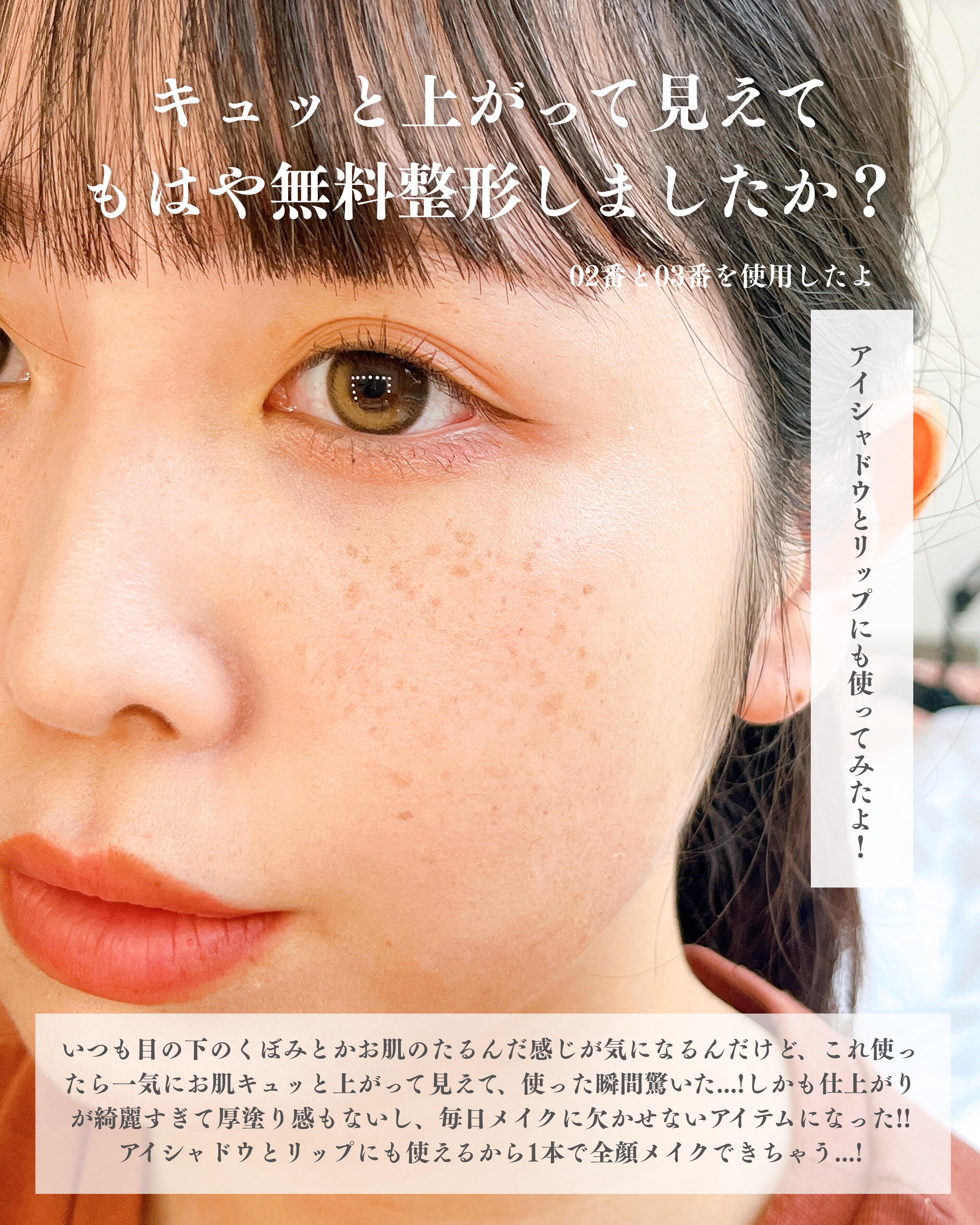 - マルチに使える!さっとひと塗りで、血色感と立体感をプラス。 ふんわりチークと自然なマットハイライト、シェーディングで、血色感と陰影をプラス。ひと塗りで、愛され美人なメイクに。 1本多役、3分間で立体感&血色感あふれる仕上がり ハイライトカラーと血色感カラーのダブルヘッドで、お肌の凹凸や悩みをカバーしながら、血色感や立体感をプラス!3分で叶える、ふんわり全顔メイク。 ハイライトカラー:気になる顔の凹凸部分や、頬のくぼみをカバー。ふっくらハリのある印象をつくります。 血色感カラー:チーク、リップ、アイシャドウとして使える万能カラー。フントーンメイクでじゅわっと血色感あふれるトレンド顔に。 72%保湿成分を配合、スーッとお肌にとろける極上のつけ心地 保湿成分*たっぷり配合したサラッと軽やかのクリームテクスチャー。肌に溶け込むように密着して、何度も重ねても厚塗り感ゼ口。高発色かつ簡単に毛穴などを力バーできて、初心者でもプ口級の仕上がりに。 *ヒアルロン酸Na、メドウフォーム種子油、スクワラン 8時間*、うるおいと血色感が続く うるおいを閉じ込めるダブルロック処方を採用、乾燥からお肌を守りながら、朝の仕上がりを長時間キープ。 *効能評価試験済み 陰影カラーで、自然な立体感を サーモンベージュのコンシーラー: クマやくすみを飛ばし、透明感あふれる明るい目元に。 ダスティグレージュのシェーディング: どんな肌色にも馴染みやすく、自然な陰影で彫りの深い美人顔に。