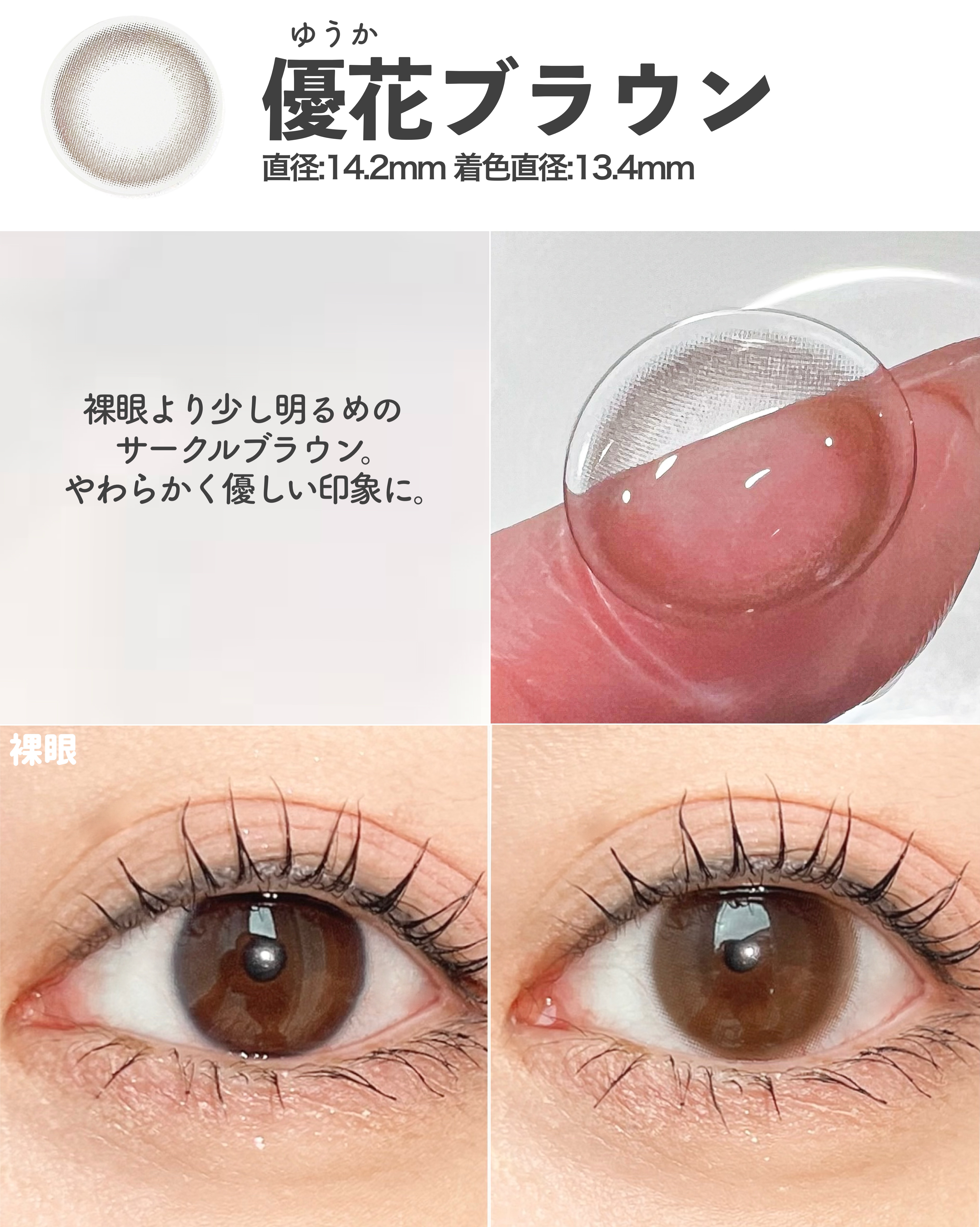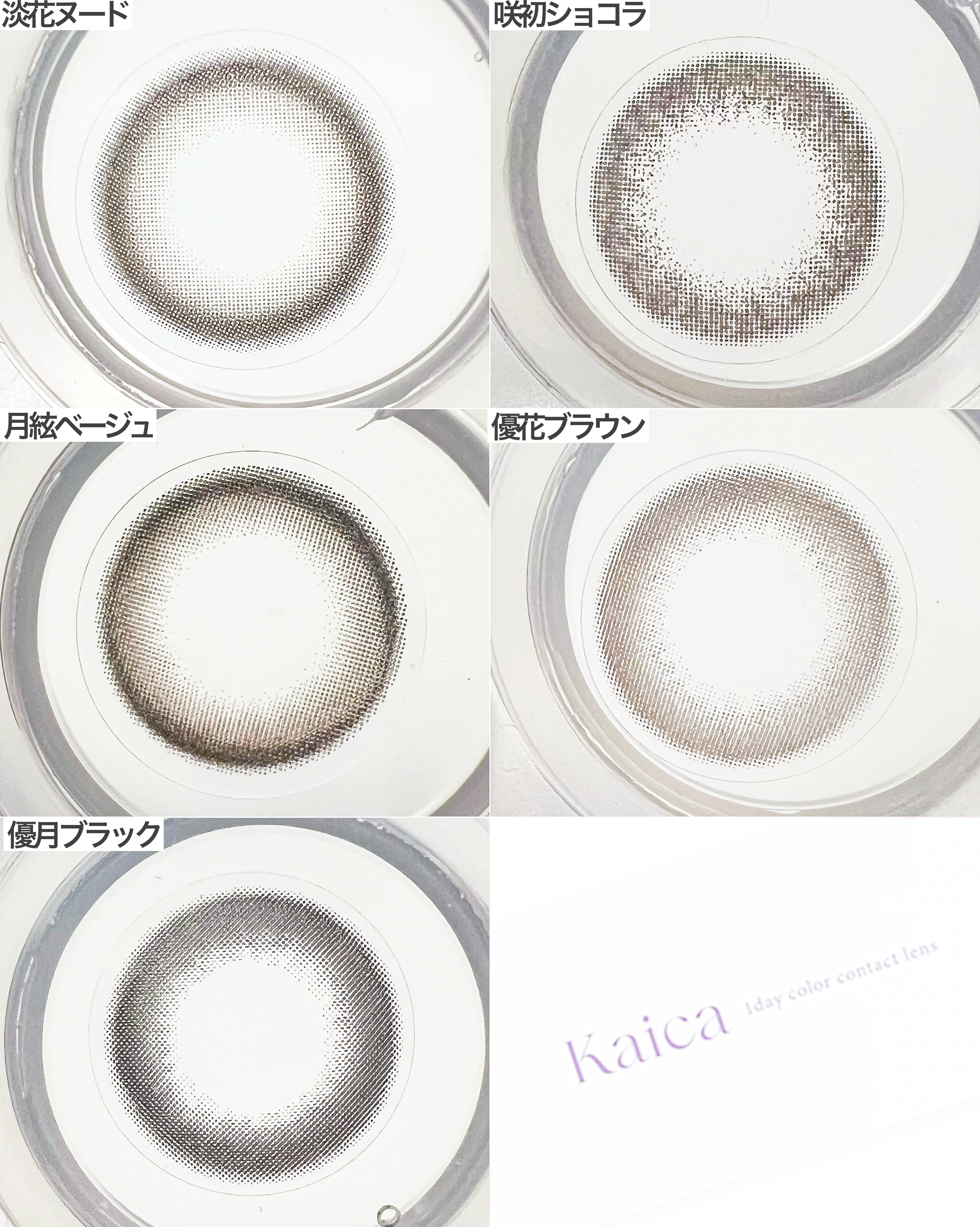 - 『Kaica』のレンズは全て「人口っぽさ」をできるだけなくし、間近で見てもカラコンをしていることがバレにくいデザイン設計。 まるでオーロラのように美しい彩りのヴェールを瞳にまとったかのような仕上がりになるのが特徴です。 裸眼の色に左右されることなく、黒目さんでも茶目さんでも、色が浮くことなくキレイに色が溶け込むように馴染むため、裸眼を活かしながら透明感を瞳に与えることができます。 2025年4月発売 <月絃ベージュ> 今っぽトレンドのトーンアップベージュ。愛らしさをプラスしてくれる、ちゅるん系レンズ <咲初ショコラ> 瞳をきらっと魅せる王道ダークブラウン。どんなシーンでも迷わず使える、実力派レンズ。 <淡花ヌード> 儚げでミュートな淡色ブラウン。とことん裸眼に馴染む、ナチュラルを追及したレンズ。 <透花ヴェール> こだわりの透明感を叶える幻想的なヘーゼルブラウン。どんな瞳も儚く魅せる、色素薄い系レンズ。 <優花ブラウン> 瞳のトーンアップを演出する柔らかいライトブラウン。自然に瞳を印象づける、サークルレンズ。 <優月ブラック> 瞳に透明感を与える優しげなブラック。自然に瞳を印象づける、サークルレンズ。 カラーコンタクトレンズの不適正使用による眼障害の危険性等などがあります。 ●コンタクトレンズは高度管理医療機器です。不十分な洗浄・消毒など不適切なケアや、長時間・交換期間を超えた装用により、アレルギー性結膜炎、角膜感染症、角膜潰瘍等の重篤な眼障害が発生する危険性があります ●ご使用前に取扱説明書を確認してください 使用上の留意事項 ●眼科医院等を受診してからお求めください ●眼に異常を感じたら直ちにレンズ使用を中止し、お近くの眼科等で診察を受けてください ●医師の指示にしたがってご使用ください ●コンタクトレンズを装用する場合、自覚症状がなくても、眼科医院等での定期検査を受けてください ●レンズに不具合がある場合は使用しないでください
