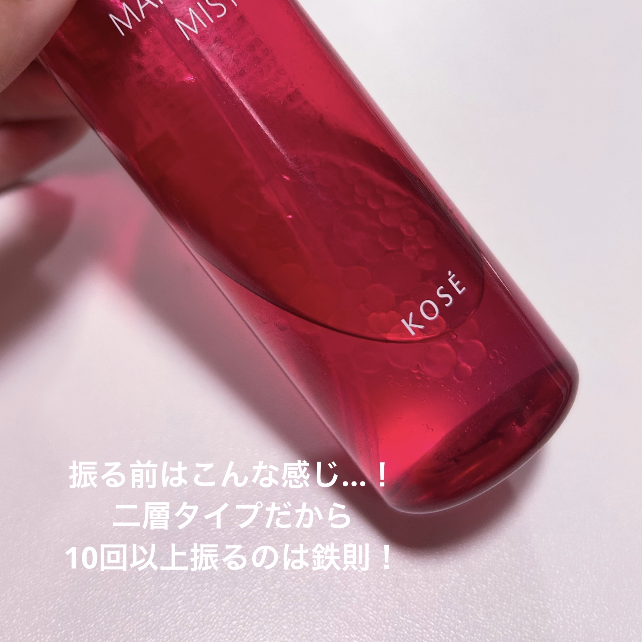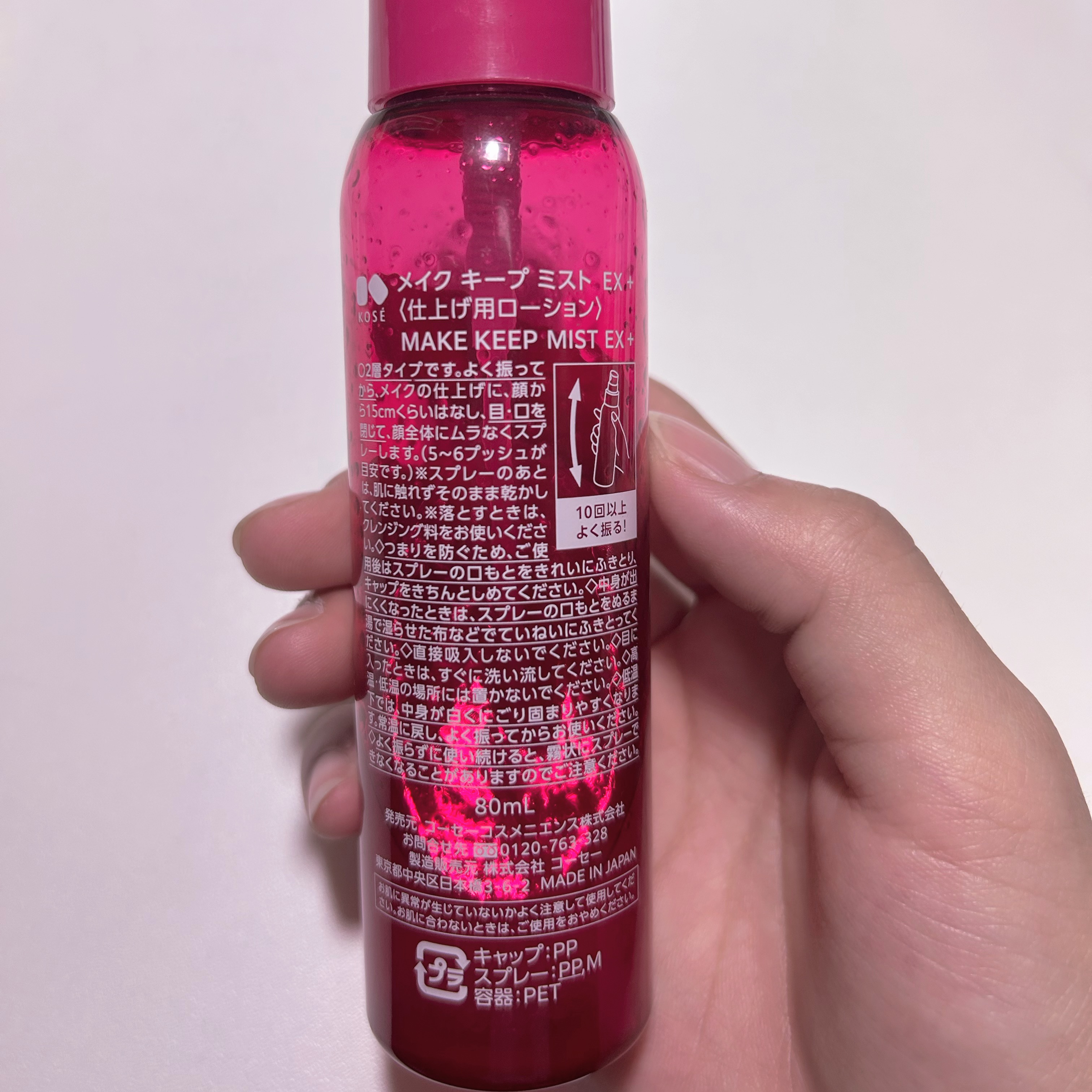 - メイク キープ ミスト EX + 長時間、化粧持ちデータ取得済み! ※当社調べ。個人差があります。 ●メイクの仕上げにシュッと吹きかけるだけで、蒸し暑い環境でも化粧くずれしにくくなるメイクキープミストです。 ●メイクよれ防止効果がプラスとなり、メイクキープ効果が衝撃パワーアップ! コーセーオリジナルの「スーパーメイクコート成分」を新配合。 表情の動きにもよれにくく高い柔軟性をもつため、 表情の変化によるメイクよれを防止。 美しい仕上がりをキープします。 ●スーパーウォータープルーフヘパワーアップ! 汗・水・涙にも強く、撥水効果を発揮します。 撥水性の高い膜が、 隙間なく均一に肌へ密着。 汗・ 水 ・ 涙をしっかりはじき、メイクくずれを防ぎます。 ●高い皮脂プルーフ効果で、 テカリ&毛穴落ち防止効果がパワーアップ! 皮脂テカリ・くずれ防止成分が皮脂をはじくと同時にテカリを防止。 テカリだけでなく、 メイクの毛穴落ちまで防ぎます。 ●高温多湿試験済み※! 蒸し暑い環境でもテカリやベタつきを防ぎ、 美しい仕上がりをキープします。 ※化粧もちに関して (コーセー調べ。 効果には個人差があります。) ●ふんわり細やかなミストが均一な1枚の膜を形成! つけたての美しいメイクを長時間キープ。 メイクをしっかり固定しながら、顔の動きに合わせて伸縮する膜を肌表面に形成。 時間が経ってもメイクがよれにくく、 美しい仕上がりが長時間持続します。 ●新配合のシカ成分をはじめとする数種の保湿成分を贅沢に配合! 肌にうるおいをあたえ、 乾燥を防ぎます。 マスク着用によるメイクのよれや、マスクへのメイク移りを防ぎます。 大気中の微粒子(ちり・ほこり・PM2.5など) からお肌をまもります。 ●アレルギーテスト済み ●ノンコメドジェニックテスト済み ※すべてのかたにアレルギーが起きない、コメド (ニキビのもと)ができないというわけではありません。 ジューシーフローラルの香り 無着色 ※スーパーメイクコート成分は(ジメチコン/ビニルトリメチルシロキシケイ酸)クロスポリマー、汗・皮脂プルーフ成分はトリメチルシロキシケイ酸、皮脂テカリ・くずれ防止成分は(ジメチコン/ビニルジメチコン)クロスポリマー、シカ成分はツボクサ葉エキス、ヒアルロン酸は加水分解ヒアルロン酸、コラーゲンは加水分解コラーゲンです。 <ご注意> 低温下では中身が白く固まりやすくなりますが、 常温に戻すために湯せんや電子レンジなどを使って高い温度で温めると品質が変化してしまいます。 さらには容器が変形・破損することで、やけどや怪我の恐れがあります。 大変危険ですので、湯せんや電子レンジなどを使って加熱することは絶対にお避けください。