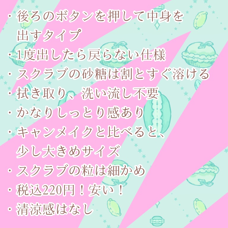 | リップスクラブランキング第1位 | 甘いフレーバーの匂いに誘われ、 ついつい唇を舐めてしまいたくなるスクラブ | 詳細を見る | |