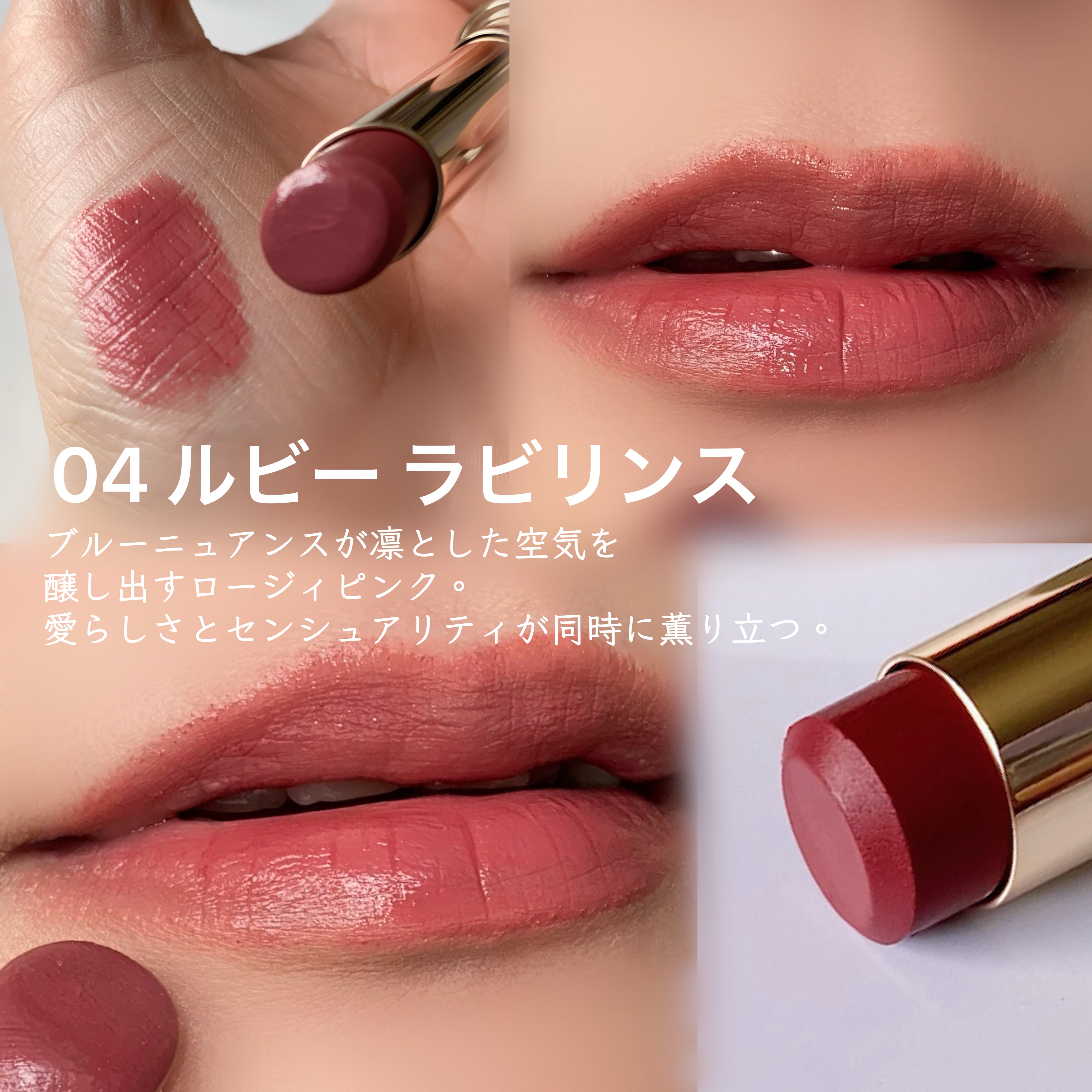 - <01 マイチャイ> テトライソステアリン酸ジペンタエリスリチル、オクチルドデカノール、水添ポリイソブテン、ビスアルキル(C16-18)グリセリルウンデシルジメチコン、ヘキサヒドロキシステアリン酸ジペンタエリスリチル、ジカプリン酸ネオペンチルグリコール、ラウロイルグルタミン酸ジ(フィトステリル/オクチルドデシル)、リンゴ酸ジイソステアリル、パラフィン、イソノナン酸イソトリデシル、合成ワックス、マイクロクリスタリンワックス、ラウロイルグルタミン酸ジ(オクチルドデシル/フィトステリル/ベヘニル)、ホホバ種子油、水添マイクロクリスタリンワックス、トコフェロール、(エチレン/プロピレン)コポリマー、ポリエチレン、ヒアルロン酸Na、(+/-)(チタン/酸化チタン)焼結物、シリカ、セルロース、マイカ、ラウロイルアスパラギン酸Na、ラウロイルリシン、塩化亜鉛、酸化チタン、酸化鉄、水酸化Al、トリイソステアリン酸イソプロピルチタン、トリエトキシカプリリルシラン、合成フルオロフロゴパイト、黄4、青1、赤201、赤202 <02 レイディアントラセット> テトライソステアリン酸ジペンタエリスリチル、オクチルドデカノール、水添ポリイソブテン、ジカプリン酸ネオペンチルグリコール、ビスアルキル(C16-18)グリセリルウンデシルジメチコン、ヘキサヒドロキシステアリン酸ジペンタエリスリチル、リンゴ酸ジイソステアリル、ラウロイルグルタミン酸ジ(フィトステリル/オクチルドデシル)、パラフィン、イソノナン酸イソトリデシル、合成ワックス、マイクロクリスタリンワックス、ラウロイルグルタミン酸ジ(オクチルドデシル/フィトステリル/ベヘニル)、ホホバ種子油、水添マイクロクリスタリンワックス、トコフェロール、(エチレン/プロピレン)コポリマー、ポリエチレン、ヒドロキシステアリン酸エチルヘキシル、ヒアルロン酸Na、(+/-)(チタン/酸化チタン)焼結物、セルロース、ラウロイルアスパラギン酸Na、塩化亜鉛、酸化チタン、酸化鉄、水酸化Al、トリイソステアリン酸イソプロピルチタン、トリエトキシカプリリルシラン、合成フルオロフロゴパイト、黄5、青1、赤201、赤202 <03 シャイハート> テトライソステアリン酸ジペンタエリスリチル、オクチルドデカノール、水添ポリイソブテン、ビスアルキル(C16-18)グリセリルウンデシルジメチコン、ヘキサヒドロキシステアリン酸ジペンタエリスリチル、ジカプリン酸ネオペンチルグリコール、ラウロイルグルタミン酸ジ(フィトステリル/オクチルドデシル)、リンゴ酸ジイソステアリル、パラフィン、イソノナン酸イソトリデシル、合成ワックス、マイクロクリスタリンワックス、ラウロイルグルタミン酸ジ(オクチルドデシル/フィトステリル/ベヘニル)、ホホバ種子油、水添マイクロクリスタリンワックス、トコフェロール、(エチレン/プロピレン)コポリマー、ポリエチレン、ヒアルロン酸Na、(+/-)(チタン/酸化チタン)焼結物、シリカ、セルロース、マイカ、ラウロイルアスパラギン酸Na、ラウロイルリシン、塩化亜鉛、酸化チタン、酸化鉄、水酸化Al、トリイソステアリン酸イソプロピルチタン、トリエトキシカプリリルシラン、合成フルオロフロゴパイト、黄4、青1、赤201、赤202 <04 ルビー ラビリンス> テトライソステアリン酸ジペンタエリスリチル、オクチルドデカノール、水添ポリイソブテン、ビスアルキル(C16-18)グリセリルウンデシルジメチコン、ヘキサヒドロキシステアリン酸ジペンタエリスリチル、ジカプリン酸ネオペンチルグリコール、ラウロイルグルタミン酸ジ(フィトステリル/オクチルドデシル)、リンゴ酸ジイソステアリル、パラフィン、イソノナン酸イソトリデシル、合成ワックス、マイクロクリスタリンワックス、ラウロイルグルタミン酸ジ(オクチルドデシル/フィトステリル/ベヘニル)、ホホバ種子油、水添マイクロクリスタリンワックス、トコフェロール、(エチレン/プロピレン)コポリマー、ポリエチレン、ヒアルロン酸Na、(+/-)(チタン/酸化チタン)焼結物、シリカ、セルロース、マイカ、ラウロイルアスパラギン酸Na、ラウロイルリシン、塩化亜鉛、酸化チタン、酸化鉄、水酸化Al、トリイソステアリン酸イソプロピルチタン、トリエトキシカプリリルシラン、合成フルオロフロゴパイト、黄4、青1、赤201、赤202 <05 ムーンリット モーブ> テトライソステアリン酸ジペンタエリスリチル、オクチルドデカノール、水添ポリイソブテン、ビスアルキル(C16-18)グリセリルウンデシルジメチコン、ヘキサヒドロキシステアリン酸ジペンタエリスリチル、ジカプリン酸ネオペンチルグリコール、ラウロイルグルタミン酸ジ(フィトステリル/オクチルドデシル)、リンゴ酸ジイソステアリル、パラフィン、イソノナン酸イソトリデシル、合成ワックス、マイクロクリスタリンワックス、ラウロイルグルタミン酸ジ(オクチルドデシル/フィトステリル/ベヘニル)、ホホバ種子油、水添マイクロクリスタリンワックス、トコフェロール、(エチレン/プロピレ