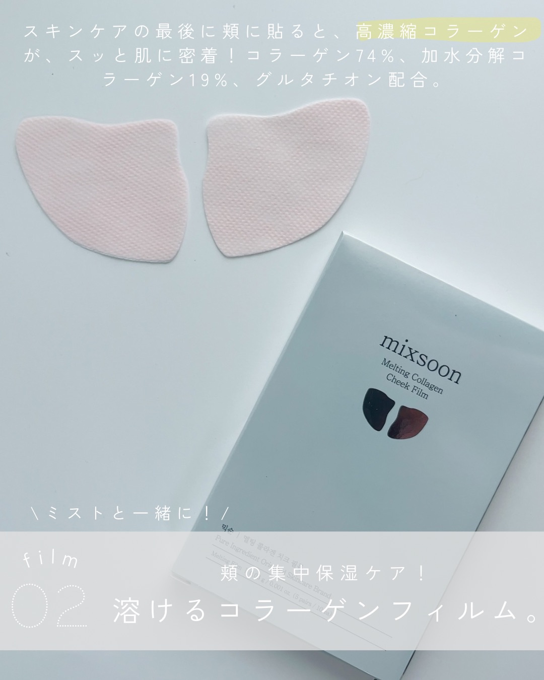 ミクスン#メルティングコラーゲンチークフィルム#大豆バランシングアンプルミストコラーゲンフィルム×コラーゲンミストを一緒に使ってみました。ミストで濡らした頬に乗せるだけで素早く溶けて隙間なくフィットします。気になるチーク部分を簡単にケアす...