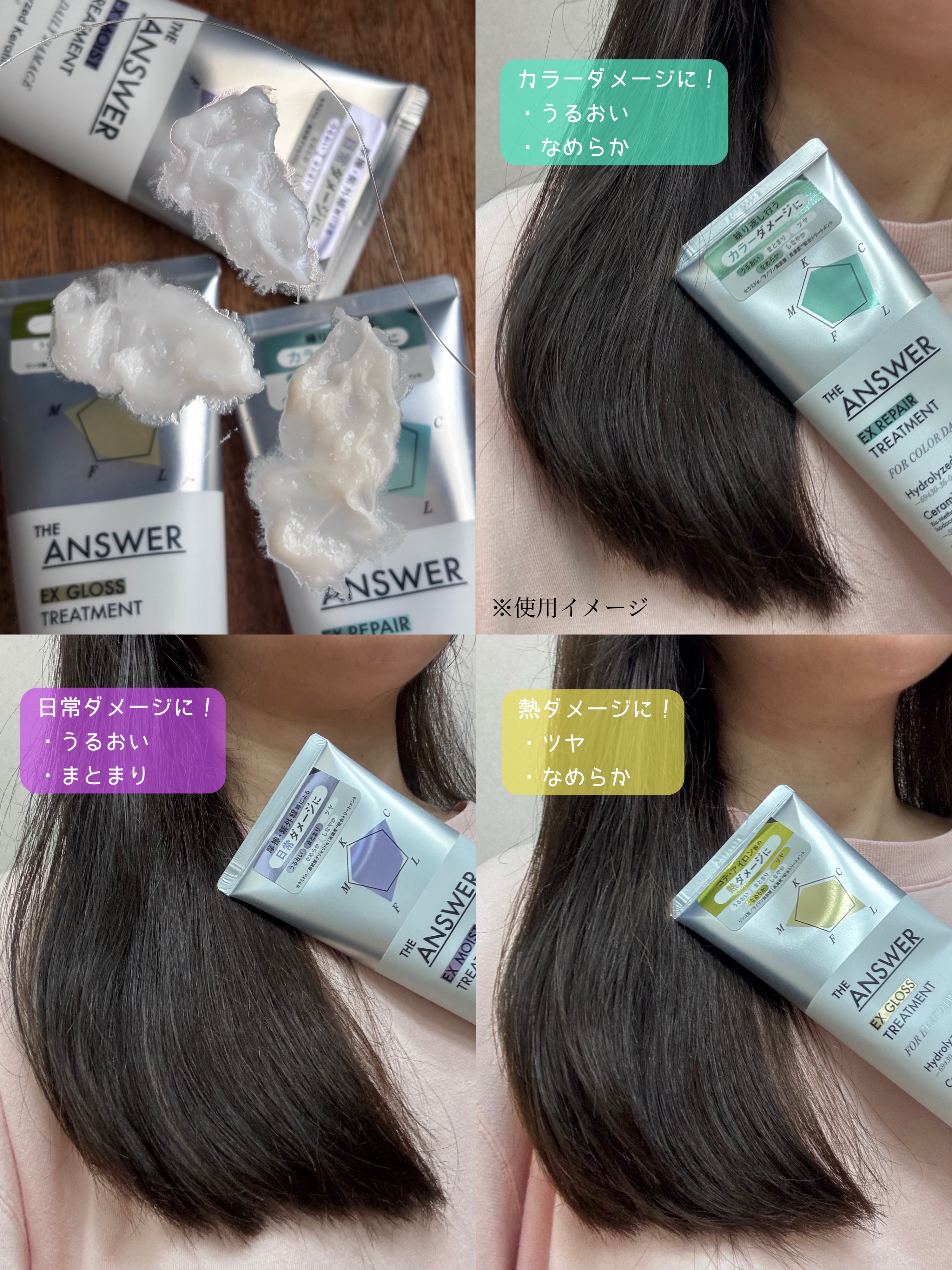 美髪5大必須成分配合のTHE ANSWERのシャントリ ✨ シャンプー内に構築したラメラ層にケア成分を蓄えるラメラプラットフォーム技術採用✨ シャンプーは塗り洗いを推奨してるの❣️ 充分に濡らした髪にシャンプーを塗り広げて、それから泡立てて洗う🫧 ダメージ要因別に美髪5大必須成分(補修)の配合量を調節✨ 💚EX REPAIR TREATMENT カラーダメージに 💛EX GLOSS TREATMENT 熱ダメージに 💜EX MOIST TREATMENT 日常ダメージに