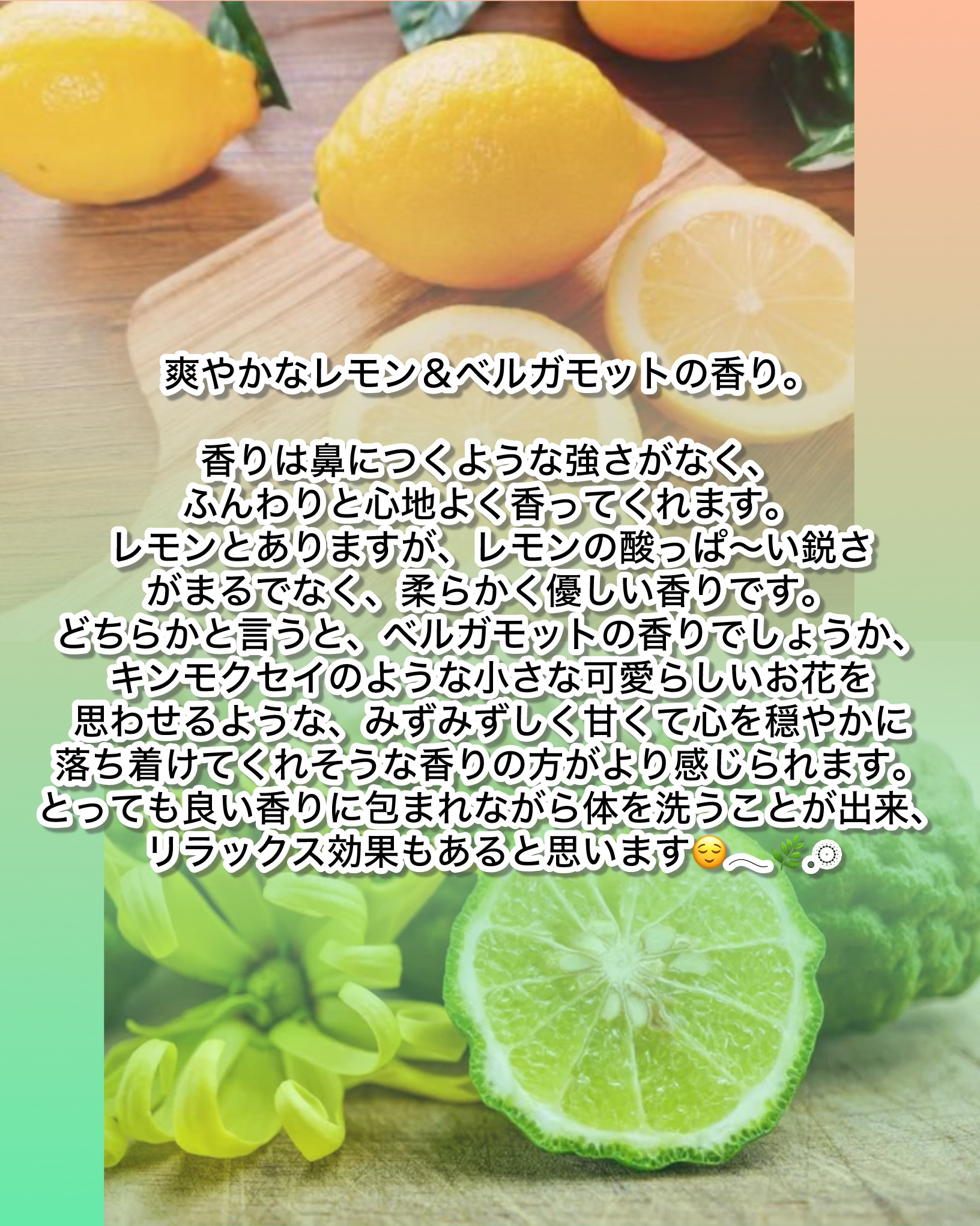 - 石鹸をベースに、天然由来の洗浄成分と保湿成分のバランスよく配合したボディソープ。 泡立ちと泡切れが良く、スッキリとした洗い心地と適度にうるおいを感じる洗い上がりです。 レモン&ベルガモットの香り。