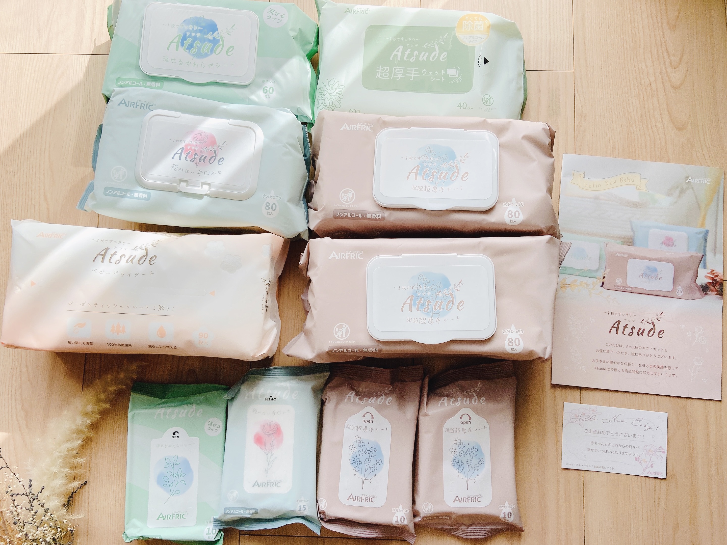 AIRFRIC様のAtsude子育てを応援する出産祝いセットをお試しさせて頂きました!こちらはたくさんの子育て中に使えるグッズが12点も入っている出産祝いにオススメのセットです。・超超超厚手シート×2個・超超超厚手シートおでかけ用×2個・乾か...