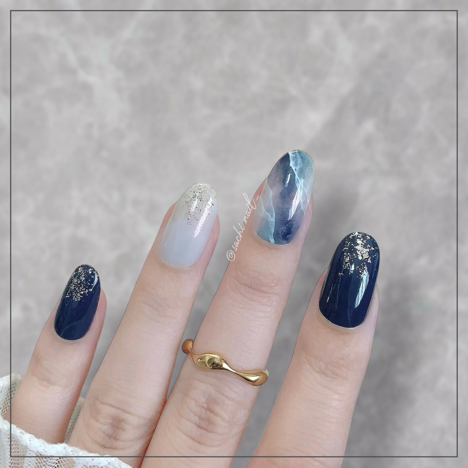 ワンカラーでも指ごとに色を変えるだけでオシャレに見えます💕 画像のようにゴールドラインとストーンを少し足すだけで華やかさがアップ🥰 何度かご紹介したことのあるスポンジで作るグラデーションです✨ スポンジを使うことで境目が綺麗に馴染んでくれます💕 アルミホイルの上でブラウンとトップコートを1:1くらいで混ぜたものを、トップコートのハケに取って3箇所に塗るだけ👌 事前に混ぜたものを塗ることで、爪の上でぼかすより簡単に出来ます💕 ベースカラーが乾く前に点置きしてぼかすことで綺麗にぼかせます✨ スピードが大事なので、使うポリッシュのキャップは全て開けておきましょう😊 天然石のラインはガタガタの方がより天然石っぽく見えるので、ラインを描くのが苦手な方でも大丈夫🙆♀️ 難しそうに見えて、やってみると意外と簡単に出来ます♡