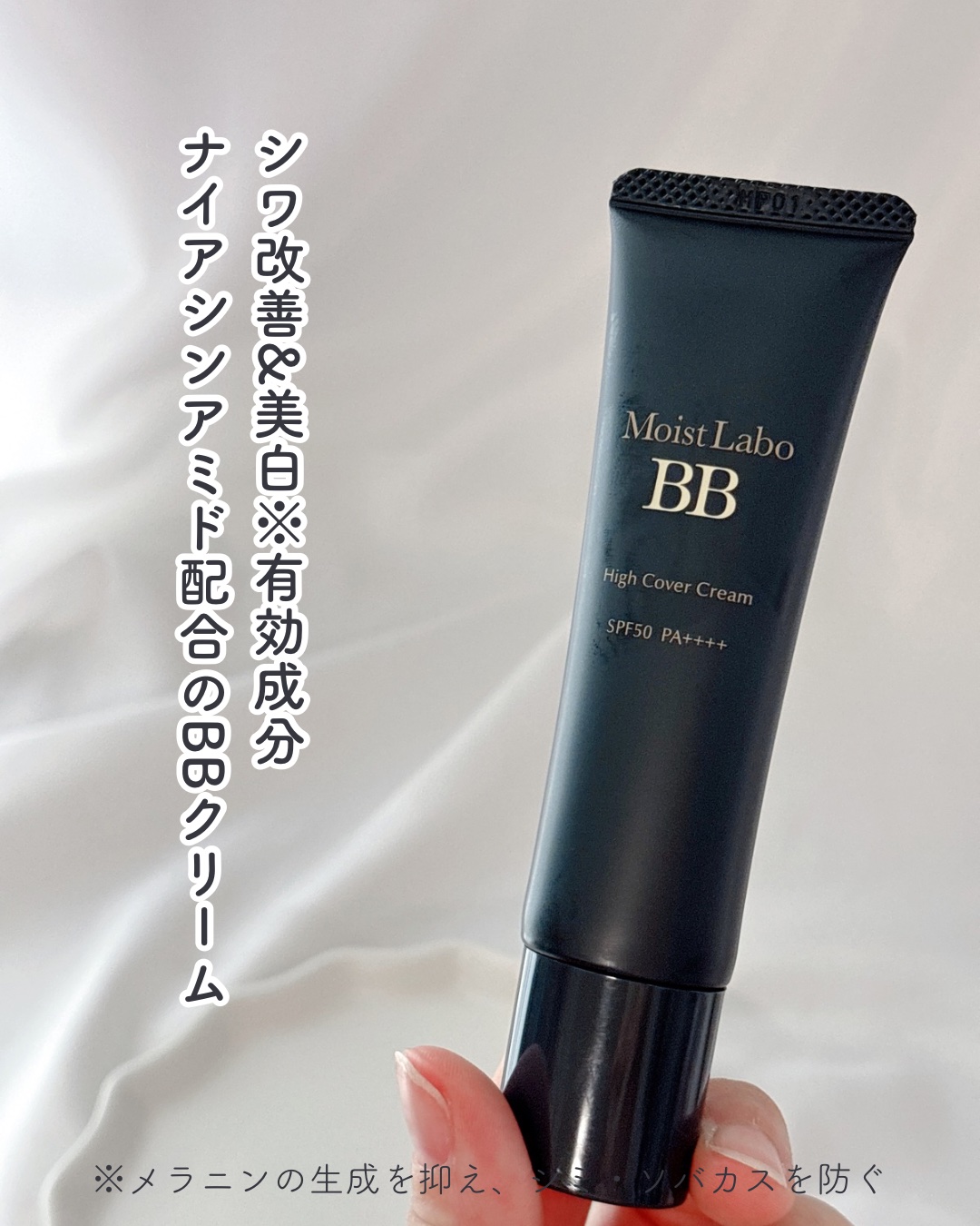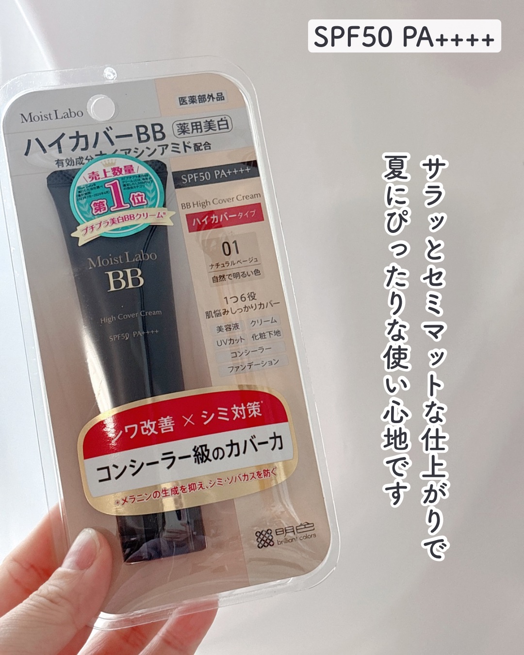 - 【医薬部外品】 「モイストラボ ハイカバー薬用美白BBクリーム」は薄付きなのにコンシーラー級のカバー力でしっかりとシミなどの肌悩みを隠しながら、同時にナイアシンアミド配合でつけている間中シワを改善し、美白対策もできる画期的なBBクリームです。 当社独自のモイスチャーマグネットHC配合でうるおい成分が密着し続け、リペアプロテクトCR配合でバリア効果も発揮。 1本6役(美容液・クリーム・UVカット・化粧下地・コンシーラー・ファンデーション)なので時短メイクなのに美しい仕上がりが叶います。 汗・水に強いウォータープルーフタイプでSPF50・PA++++なので春夏のメイクにも最適です。 〇薄膜で均一に仕上がり、厚塗り感なくシミ・くすみ・毛穴をしっかりカバー 〇密着カバーしながら、シワ改善と美白が同時に叶う 〇サラッとセミマット肌で崩れにくい 〇美白ケアしながらうるおう 〇コンシーラーいらずで1本でベースメイク完了 〇1本で6つの効果(美容液・クリーム・UVカット・化粧下地・コンシーラー・ファンデーション) 〇肌を守るバリア効果 〇汗・水に強いウォータープルーフタイプ 〇SPF50 PA++++