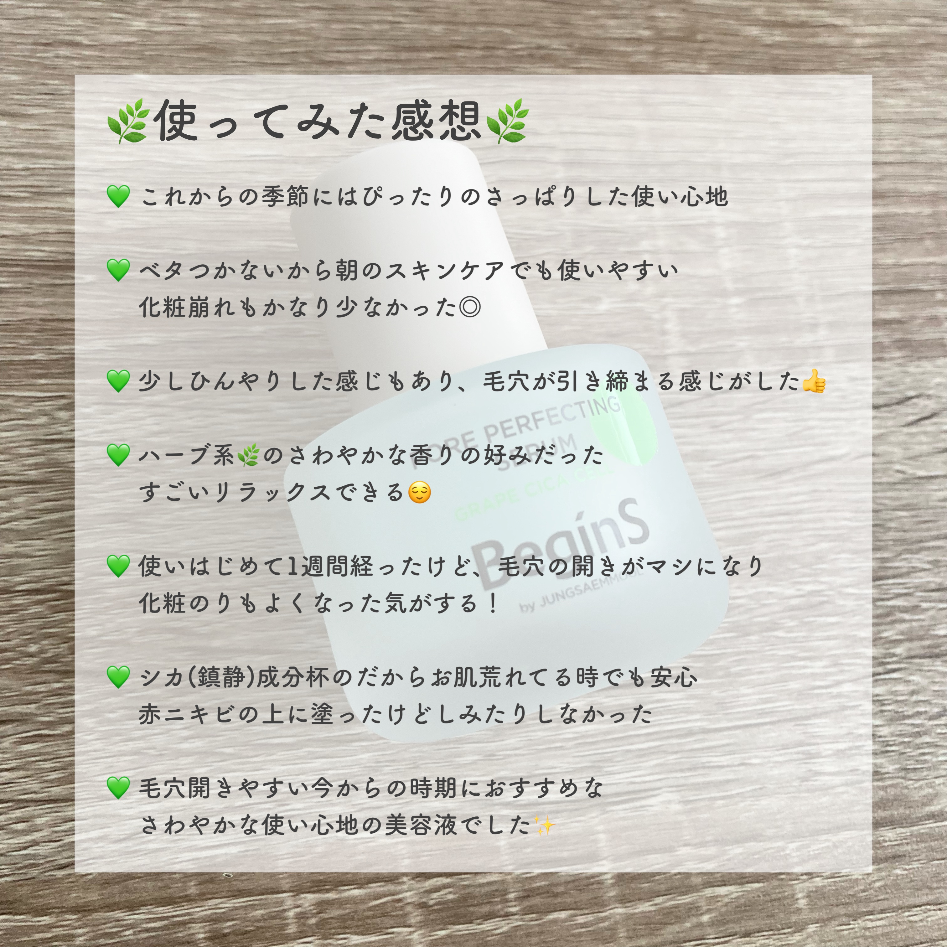たるみ肌の横長の毛穴、皮脂で長くなった横毛穴など、様々な毛穴の悩みの原因を取り除くことで、複合的な毛穴の形やサイズを改善へ導いてくれるセラム💛✨ 毛穴の開きを予防してくれるビギンスならではの毛穴ケア核心成分であるグレープシカセル成分*を配合したセラム🫶💕 さっぱりと肌に馴染むウォータースムージングテクスチャーで、ベタつかないの💓