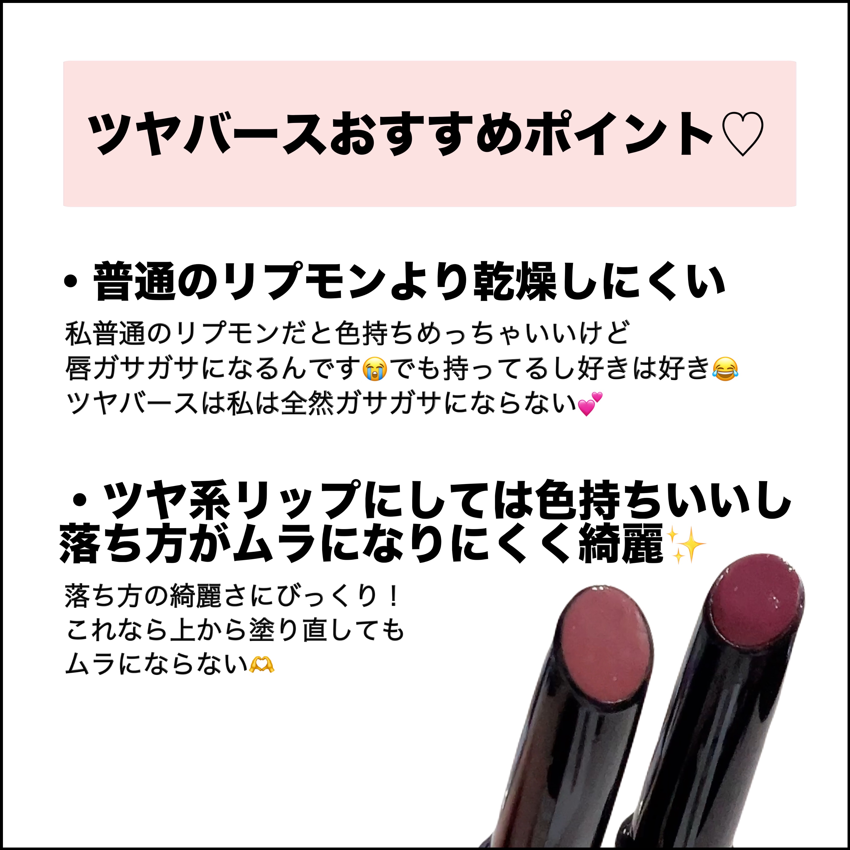 しっとりシアーな発色のツヤリップ❤︎ 保湿力も高く色持ちも良い◎ タフィーベリーはナチュラルなピンクでデイリー使いにピッタリ❤︎ どちらかと言うとブルベ向けの色味! 塗り心地は滑らかでとろける感じ◎ シアーだけど発色も良くて、保湿力が高いので塗り直しても私は皮剥けしなかったです😊