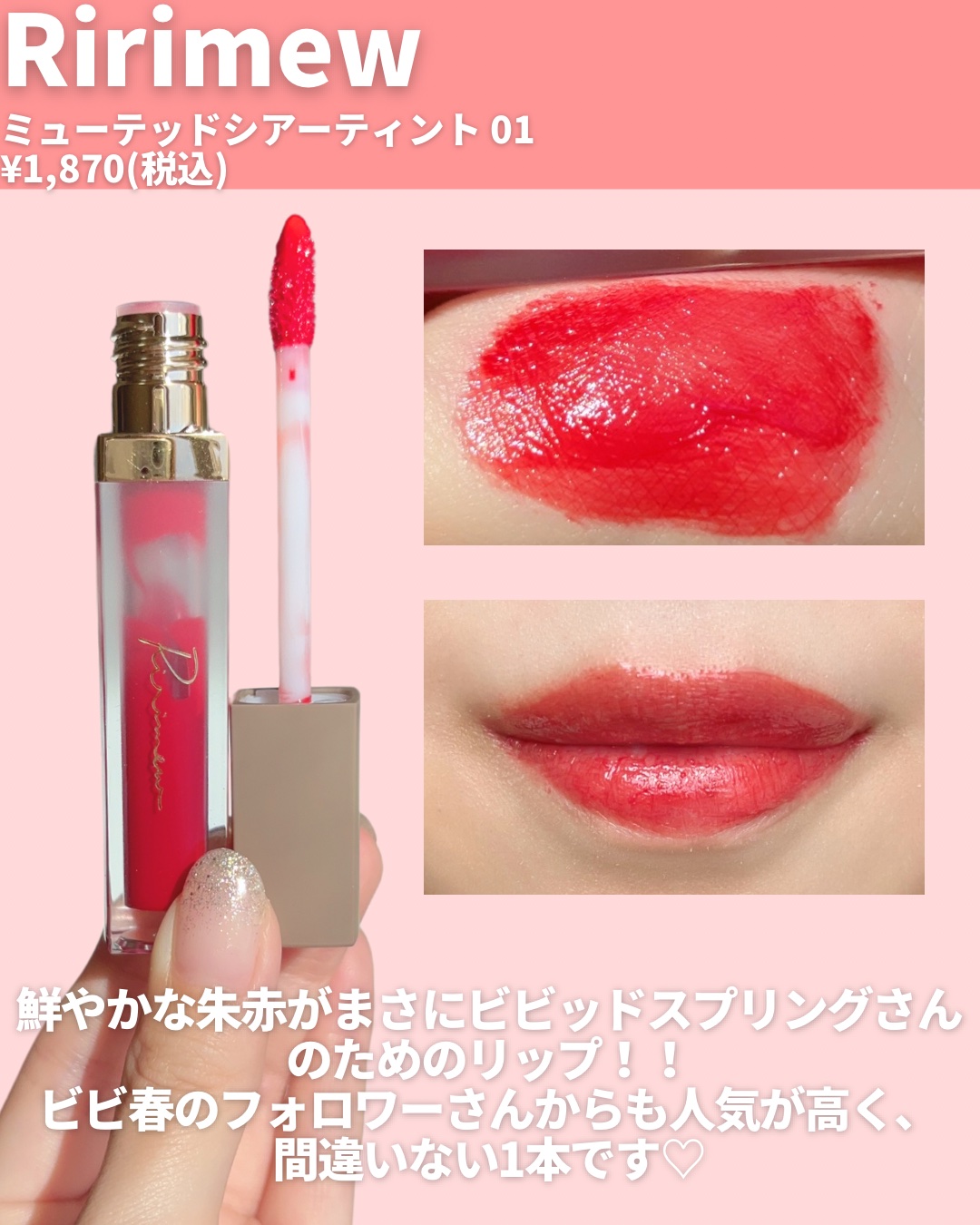 @iroai_aico#Ririmew#ミューテッドシアーティント01パピーレッド発色抜群のティントリップ💄落ちにくく綺麗に色残りしてくれるので落ちないリップがお好きな方に⭐︎鮮やかなあたたかみの01番は#ビビッドスプリングの方に激推し🫶#ブ...