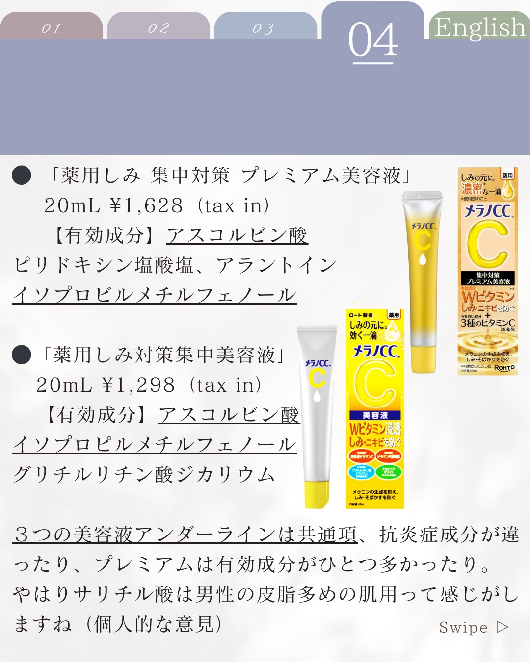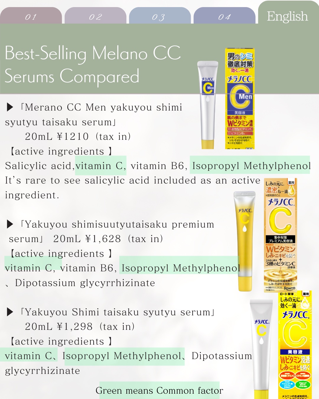 メラノCCの美容液は3種類ありますがみんな有効成分が異なるんでんすよね。サリチル酸ではないのですが他のものは…