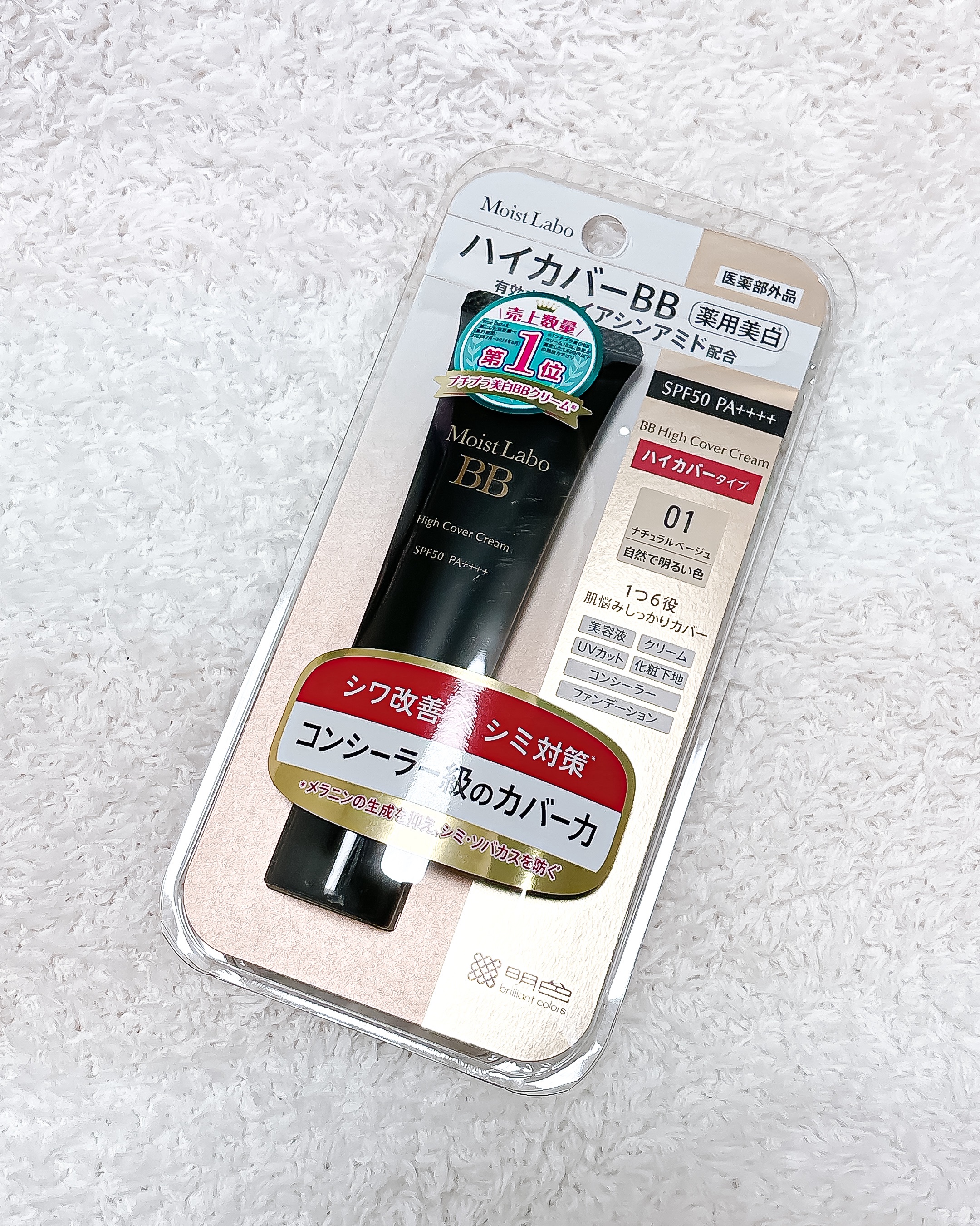 - 【医薬部外品】 「モイストラボ ハイカバー薬用美白BBクリーム」は薄付きなのにコンシーラー級のカバー力でしっかりとシミなどの肌悩みを隠しながら、同時にナイアシンアミド配合でつけている間中シワを改善し、美白対策もできる画期的なBBクリームです。 当社独自のモイスチャーマグネットHC配合でうるおい成分が密着し続け、リペアプロテクトCR配合でバリア効果も発揮。 1本6役(美容液・クリーム・UVカット・化粧下地・コンシーラー・ファンデーション)なので時短メイクなのに美しい仕上がりが叶います。 汗・水に強いウォータープルーフタイプでSPF50・PA++++なので春夏のメイクにも最適です。 〇薄膜で均一に仕上がり、厚塗り感なくシミ・くすみ・毛穴をしっかりカバー 〇密着カバーしながら、シワ改善と美白が同時に叶う 〇サラッとセミマット肌で崩れにくい 〇美白ケアしながらうるおう 〇コンシーラーいらずで1本でベースメイク完了 〇1本で6つの効果(美容液・クリーム・UVカット・化粧下地・コンシーラー・ファンデーション) 〇肌を守るバリア効果 〇汗・水に強いウォータープルーフタイプ 〇SPF50 PA++++