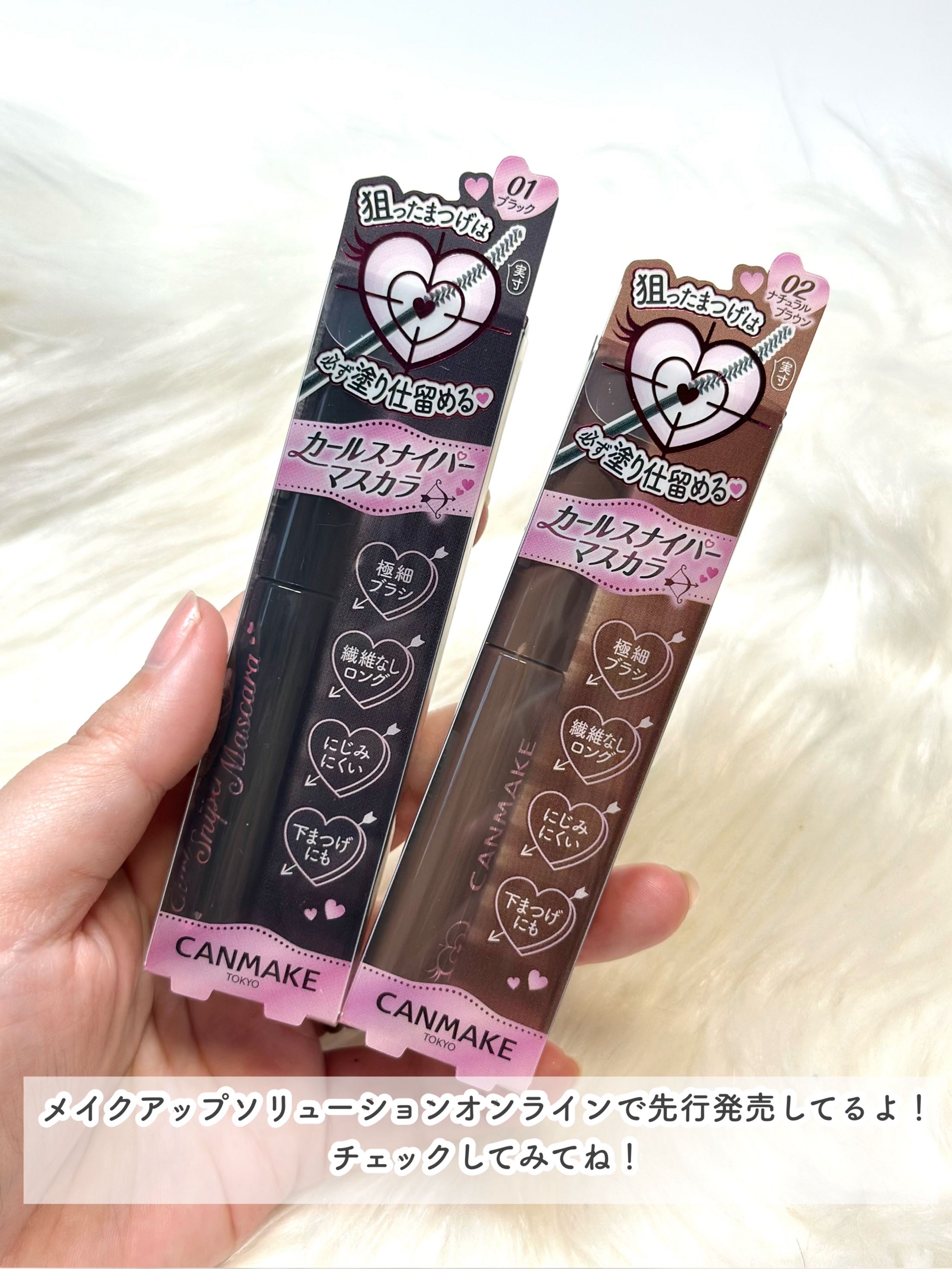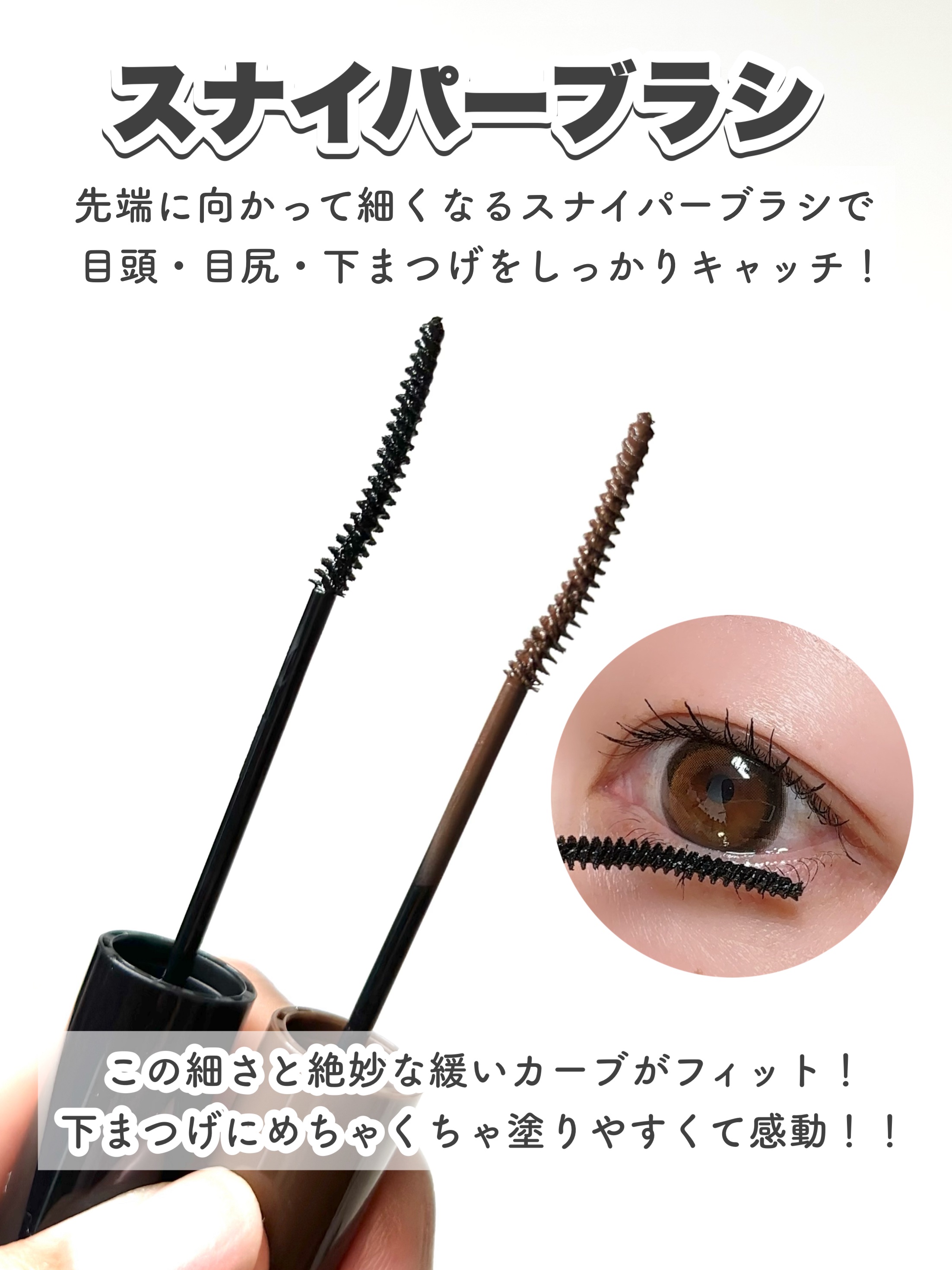 - 狙ったまつげ、しっかり塗り仕留める! スナイパーのような極細ブラシマスカラ どんなまつげも逃がさない! まつげの形にフィットするように緩やかなカーブをつけた極細スナイパーブラシで まつげの根元から塗りやすいので、初心者さんにもオススメ✨ なめらかな使用感を維持しながら、 カールアップ&カールキープしきれいなセパレートまつげに仕上げます。 🌟繊維なしでも、しっかりロングに♪ 🌟皮脂に強く、にじみにくい! 🌟ウォータープルーフで水・涙・汗に強い