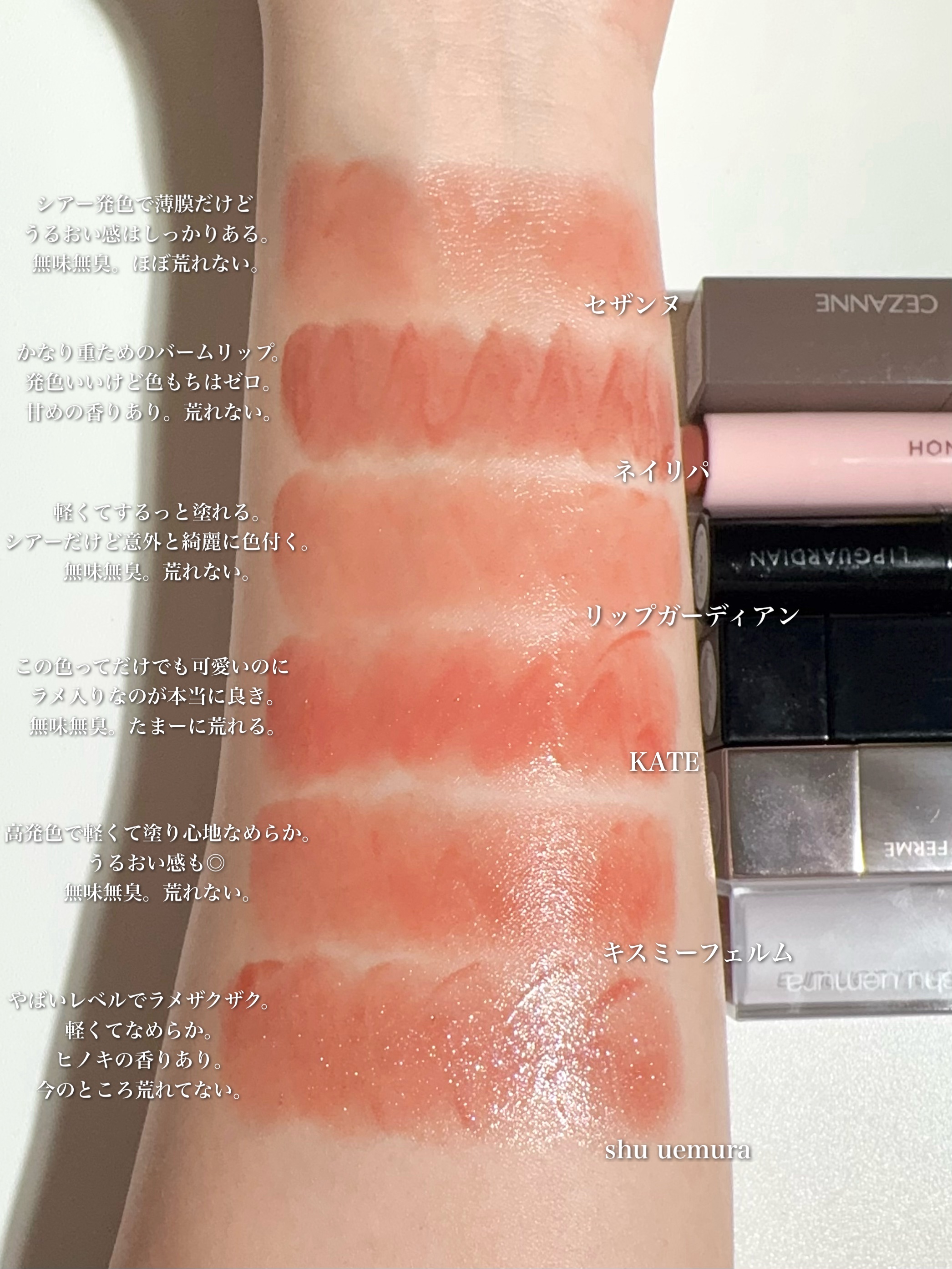 ねっちょりボリューム感あるテクスチャーだけど、ベタつきなく使いやすい。 ティントじゃない普通のグロスだから色もちは良くない。 発色ナチュラルだからこれだけでもいいけど、他のリップと合わせても可愛い!!