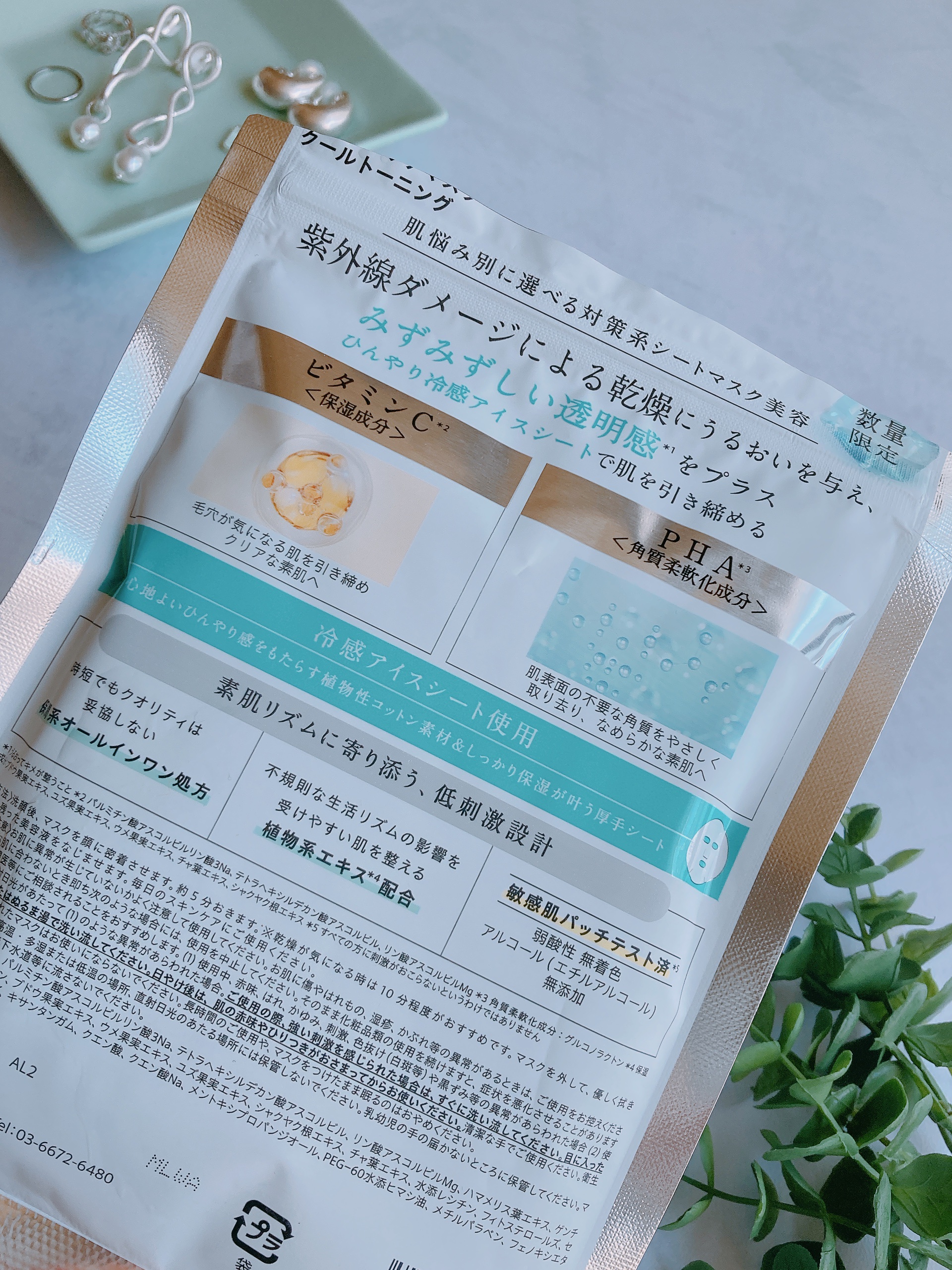 - <1枚入り> 水、グリセリン、DPG、パルミチン酸アスコルビルリン酸3Na、テトラヘキシルデカン酸アスコルビル、リン酸アスコルビルMg、ハマ メリス葉エキス、ゲンチアナ根エキス、グルコノラクトン、ブドウ果実エキス、ウメ果実エキス、ユズ果実エキス、シャクヤク根エキ ス、チャ葉エキス、水添レシチン、フィトステロールズ、セラミドNP、グリチルリチン酸2K、キサンタンガム、クエン酸、クエン酸Na、メ ントキシプロパンジオール、PEG-60水添ヒマシ油、メチルパラベン、フェノキシエタノール、香料 <7枚入り> 水、グリセリン、DPG、パルミチン酸アスコルビルリン酸3Na、テトラヘキシルデカン酸アスコルビル、リン酸アスコルビルMg、ハマ メリス葉エキス、ゲンチアナ根エキス、グルコノラクトン、ブドウ果実エキス、ウメ果実エキス、ユズ果実エキス、シャクヤク根エキ ス、チャ葉エキス、水添レシチン、フィトステロールズ、セラミドNP、グリチルリチン酸2K、キサンタンガム、クエン酸、クエン酸Na、メ ントキシプロパンジオール、PEG-60水添ヒマシ油、メチルパラベン、フェノキシエタノール、香料 <【旧】7枚> 水、グリセリン、DPG、パルミチン酸アスコルビルリン酸3Na、テトラヘキシルデカン酸アスコルビル、リン酸アスコルビルMg、ハマ メリス葉エキス、ゲンチアナ根エキス、グルコノラクトン、ブドウ果実エキス、ウメ果実エキス、ユズ果実エキス、シャクヤク根エキ ス、チャ葉エキス、水添レシチン、フィトステロールズ、セラミドNP、グリチルリチン酸2K、キサンタンガム、クエン酸、クエン酸Na、メ ントキシプロパンジオール、PEG-60水添ヒマシ油、メチルパラベン、フェノキシエタノール、香料