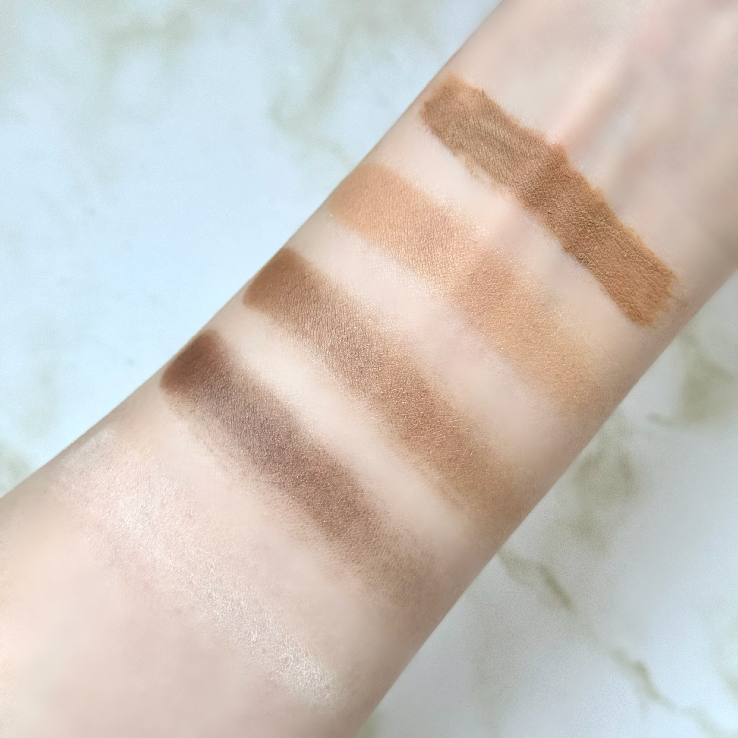アイシャドウは一見難しそう…と思ったけど、右2色はベーシックなカラーで使いやすい! 左上のパープルは色が強く出すぎずキラキラが乗る感じだったので、イエベの私でも問題なく使えたよ🙆♀️︎ ハイライターは見た目よりも肌馴染みがよく、近づくとちらちらラメが見える仕上がりだった✨️