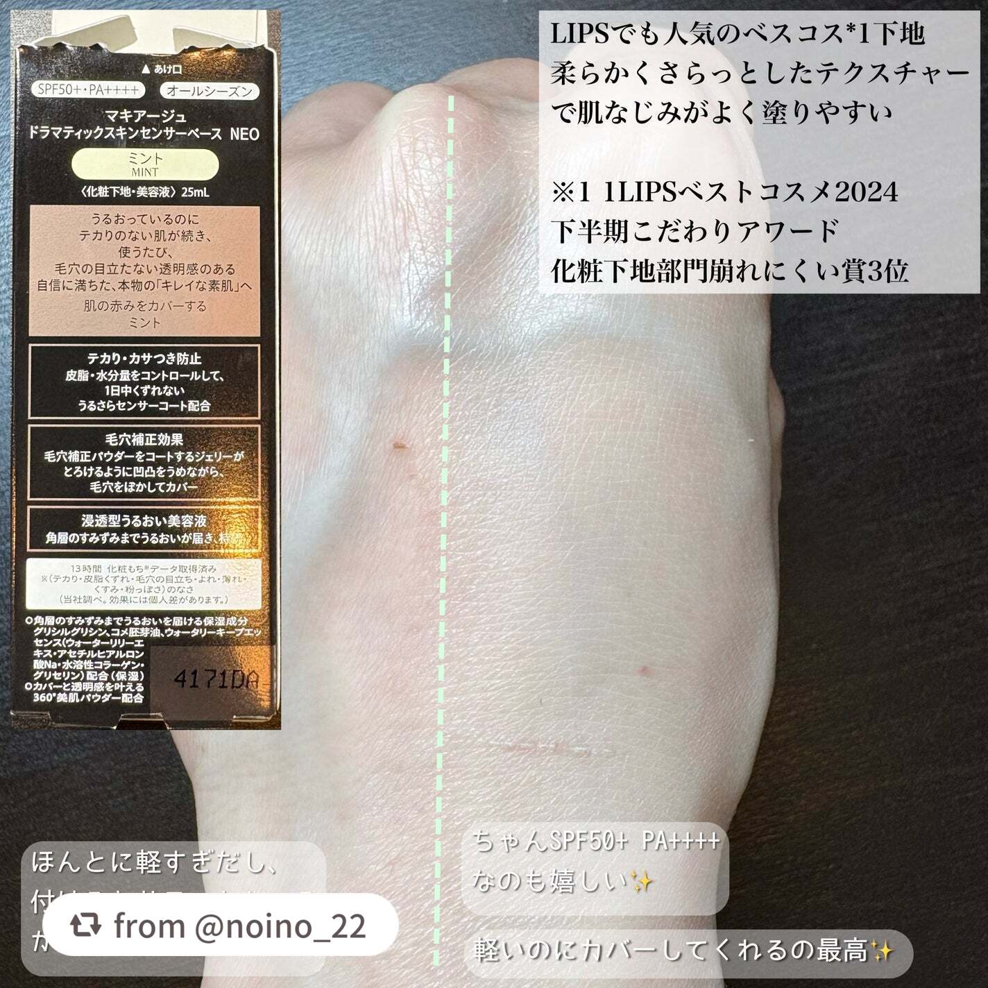 - ドラマティックスキンセンサーベース NEO<化粧下地・美容液> 売上 No.1化粧下地*のドラマティックスキンセンサーベース EX UV+のくずれ防止効果、毛穴カバー効果をさらに強化し、 新たにスキンケア機能まで搭載した毛穴レスくずれ防止下地です。 SPF50+・PA++++で、強力な紫外線から肌を守ります。 ◆POINT1 テカリ・カサつきダブルで防ぐ最強くずれ防止効果 新たに肌全体を覆う「うるさらセンサーコート」を搭載。湿度に応じて、コートという面状で水分の通しやすさを調整することが可能となったため、どんな時でも快適な肌状態をキープする力が向上! べたつく環境では、うるさらセンサーコートが水分透過性を高めるため、さらさらキープ 乾燥する環境では、うるさらセンサーコートが水分透過性を下げるため、うるおいキープ ◆POINT2 塗った瞬間「キレイな素肌」な毛穴補正効果 毛穴補正パウダーに加え、新配合・オイル生まれのポアレスジェリーがとろけるように凹凸をうめながら毛穴をぼかしてカバーし、透明感のある仕上がりに。 ◆POINT3 使うたび うるおうスキンケア効果 浸透型うるおい美容液が、角層のすみずみまでうるおいを届け、持続。使うたび、うるおって毛穴が目立たない本物の「キレイな素肌」へ。 *インテージSRI+, 化粧下地市場(期間2022/1~2022/12), 品種別金額シェア ※ミントは企業限定発売。取扱企業は、ウエルシアグループ、スギ薬局、ツルハグループ(ツルハドラッグ・くすりの福太郎・ドラッグストアウェルネス・ドラッグストアウォンツ・くすりのレデイ・杏林堂スーパードラッグストア・B&D ドラッグストア・ドラッグイレブン)、トモズです。 店舗によってお取り扱いがない場合がございます。