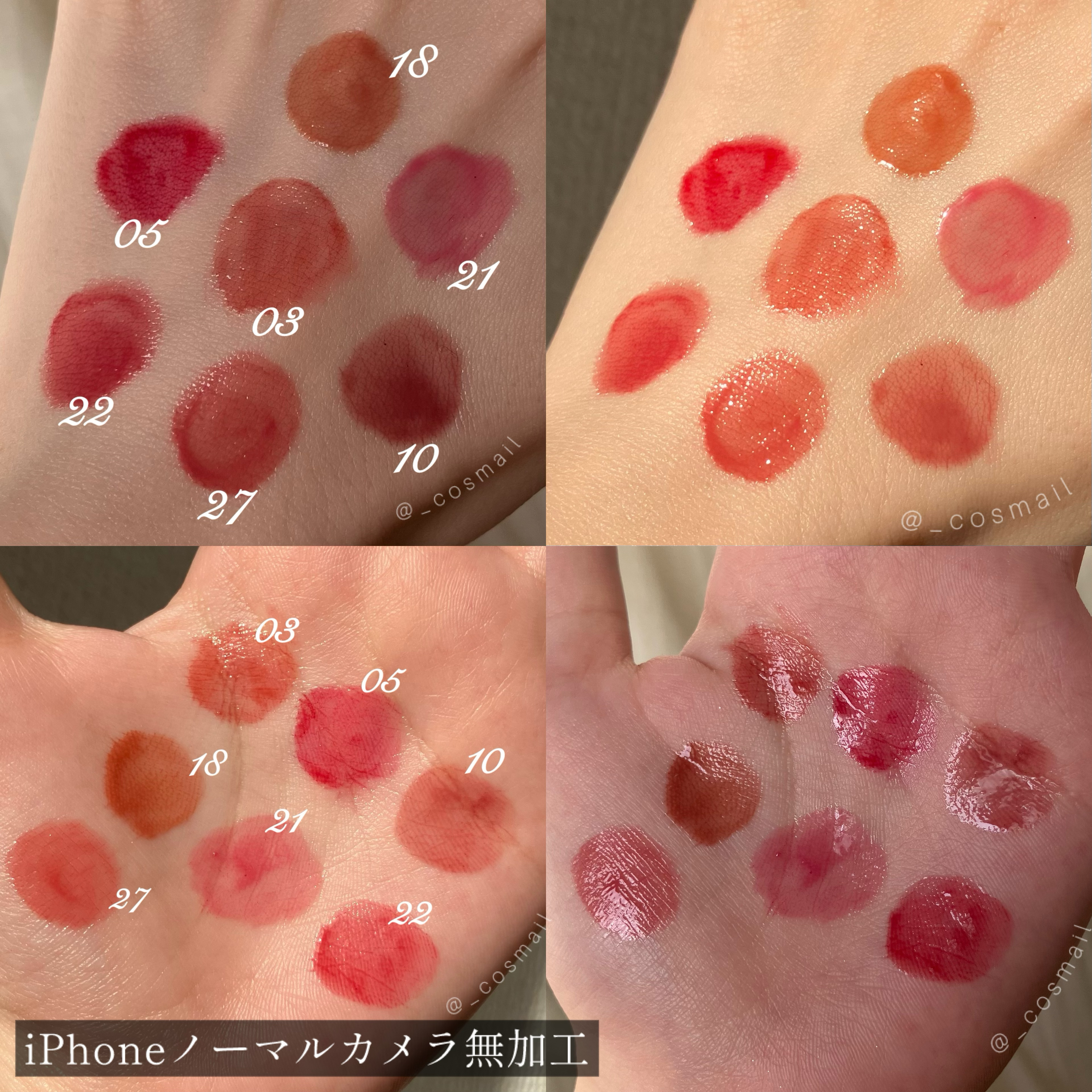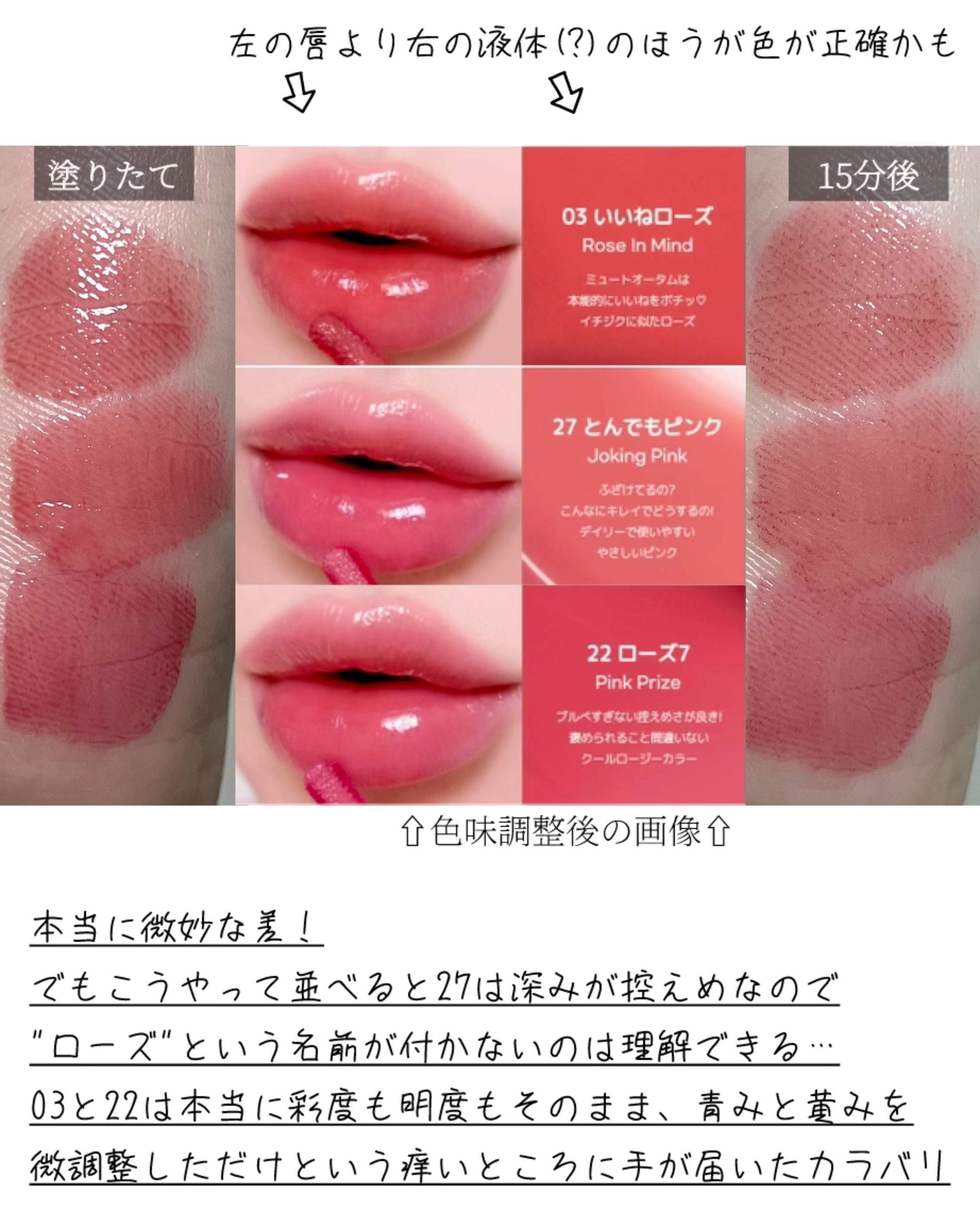 - <01 BEST BEIGE MENU(推し杏子ベージュ)> 水、ジフェニルジメチコン、リンゴ酸ジイソステアリル、ビスジグリセリルボリアシルアジペート-2、水添ポリイソブテン、ダイマー ジリノール酸ダイマージリノレイルビス(ベヘニル/イソステアリル/フィトステリル)、ジグリセリン、セチルPEG/PPG-10/1ジメチコン、DPG、水添ポリ (C6-14 オレフィン)、ポリソルベート60、イソステアリン酸ソルビタン、ダイマージリノール酸ジイソステアリン酸ポリ グリセリル-3、ペンチレングリコール、(アクリル酸ヒドロキシエチル/アクリロイルジメチルタウリンNa)コポリマー、トリ(カプリル酸/ カプリン酸)グリセリル、スクワラン、セテアレス-20、(エチレン/プロピレン)コポリマー、フェノキシエタノール、グリセリン、ポリグリ セリン-3、香料、エチルヘキシルグリセリン、ハマメリス葉エキス、オニユリエキス、BG、酸化チタン、黄5、赤227、赤104(1)、青1 <02 CORAL INFLUENCER(イエベ必須コーラル)> 水、ジフェニルジメチコン、リンゴ酸ジイソステアリル、ビスジグリセリルボリアシルアジペート-2、水添ポリイソブテン、ダイマー ジリノール酸ダイマージリノレイルビス(ベヘニル/イソステアリル/フィトステリル)、ジグリセリン、セチルPEG/PPG-10/1ジメチコン、DPG、水添ポリ (C6-14 オレフィン)、ポリソルベート60、イソステアリン酸ソルビタン、ダイマージリノール酸ジイソステアリン酸ポリ グリセリル-3、ペンチレングリコール、(アクリル酸ヒドロキシエチル/アクリロイルジメチルタウリンNa)コポリマー、トリ(カプリル酸/ カプリン酸)グリセリル、スクワラン、セテアレス-20、(エチレン/プロピレン)コポリマー、フェノキシエタノール、グリセリン、ポリグリ セリン-3、香料、エチルヘキシルグリセリン、ハマメリス葉エキス、オニユリエキス、BG、酸化チタン、黄5、赤227、赤104(1)、青1 <03 ROSE IN MIND(いいねローズ)> 水、ジフェニルジメチコン、リンゴ酸ジイソステアリル、ビスジグリセリルポリアシルアジペート-2、水添ポリイソブテン、ダイマージリノール酸ダイマージリノレイルビス(ベヘニル/イソステアリル/フィトステリル)、ジグリセリン、DPG、セチルPEG/PPG-10/1ジメチコン、水添ポリデセン、ポリソルベート60、イソステアリン酸ソルビタン、ダイマージリノール酸ジイソステアリン酸ポリグリセリル-3、ペンチレングリコール、(アクリル酸ヒドロキシエチル/アクリロイルジメチルタウリンNa)コポリマー、トリ(カプリル酸/カプリン酸)グリセリル、スクワラン、セテアレス-20、(エチレン/プロピレン)コポリマー、フェノキシエタノール、グリセリン、香料、エチルヘキシルグリセリン、ハマメリス葉エキス、オニユリエキス、BG、テトラ(ジ-t-ブチルヒドロキシヒドロケイヒ酸)ペンタエリスリチル、酸化チタン、黄5、赤104(1)、赤227、青1 <04 PINK YOUTH(ベイビー天使)> 水、ジフェニルジメチコン、リンゴ酸ジイソステアリル、ビスジグリセリルボリアシルアジペート-2、水添ポリイソブテン、ダイマー ジリノール酸ダイマージリノレイルビス(ベヘニル/イソステアリル/フィトステリル)、ジグリセリン、セチルPEG/PPG-10/1ジメチコン、DPG、水添ポリ (C6-14オレフィン)、ポリソルベート60、イソステアリン酸ソルビタン、ダイマージリノール酸ジイソステアリン酸ポリ グリセリル-3、ペンチレングリコール、(アクリル酸ヒドロキシエチル/アクリロイルジメチルタウリンNa)コポリマー、トリ(カプリル酸/ カプリン酸)グリセリル、スクワラン、セテアレス-20、(エチレン/プロピレン)コポリマー、フェノキシエタノール、ポリグリセリン-3、香料、エチルヘキシルグリセリン、グリセリン、水酸化Al、ポリアクリル酸アンモニウム、BG、ハマメリス葉エキス、オニユリエキス、酸化チタン、赤227、黄4、赤104 (1) 黄5、青1 <05 CHERRY SO WHAT(どうしたのチェリー)> 水、ジフェニルジメチコン、リンゴ酸ジイソステアリル、ビスジグリセリルポリアシルアジペート-2、水添ポリイソブテン、ダイマージリノール酸ダイマージリノレイルビス(ベヘニル/イソステアリル/フィトステリル)、ジグリセリン、セチルPEG/PPG-10/1ジメチコン、DPG、水添ポリ(C6-14オレフィン)、ポリソルベート60、イソステアリン酸ソルビタン、ダイマージリノール酸ジイソステアリン酸ポリグリセリル-3、ペンチレングリコール、(アクリル酸ヒドロキシエチル/アクリロイルジメチルタウリンNa)コポリマー、トリ(カプリル酸/カプリン酸)グリセリル、スクワラン、セテアレス-20、(エチレン/プロピレン)コポリマー、フェノキシエタノール、ポリグリセリン-3、香料、エチルヘキシルグリセリン、グリセリン、ハマメリス葉エキス、オニユリエキス、BG、赤227、黄4、赤104(1)、黄5、青1 <06 PLUM UPDATE(プロフ写プラム)> 水、ジフェニルジメチコン、リンゴ酸ジイソステアリル、ビスジグリセリルポリアシルアジペート-2、水添ポリイソブテン、ダイマー ジリノール酸ダイマージリノレイルビス(ベヘニル/イソステアリル/フィトステリル)、