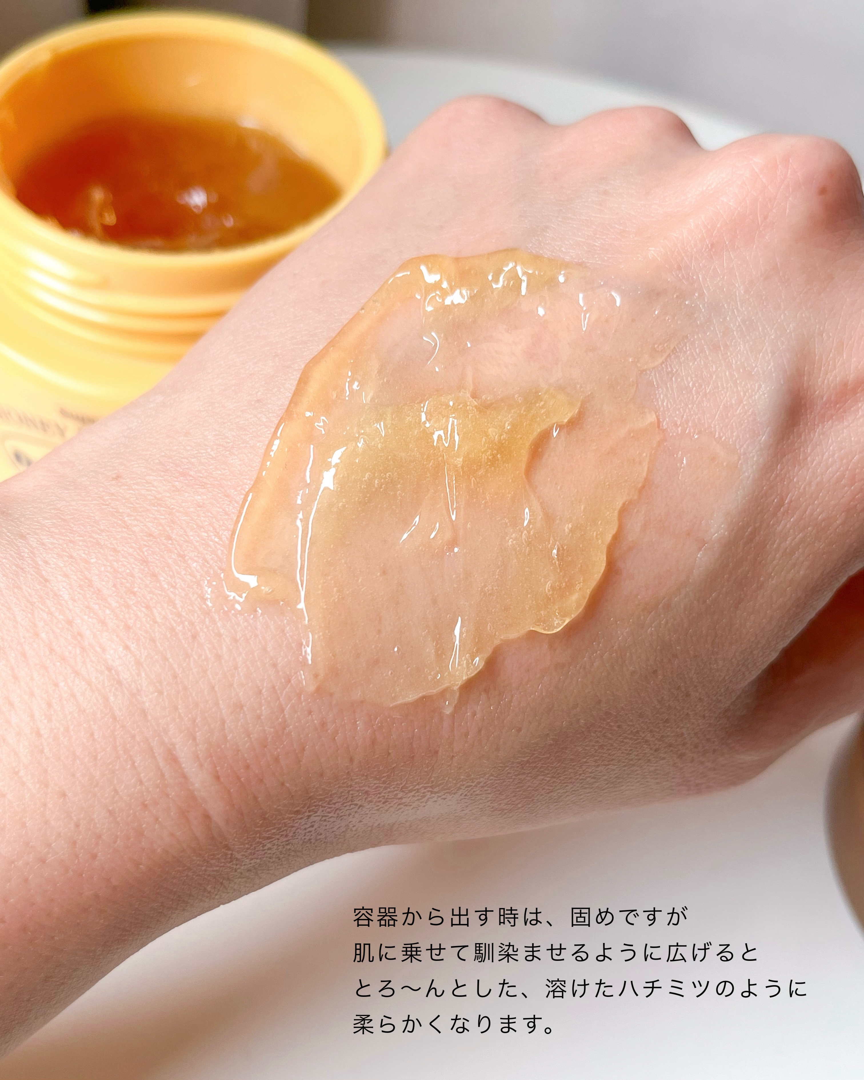 この蜂蜜パックはテクスチャーがすごい! 激硬になるまで煮詰めたジャムみたいなテクスチャーでこれ顔に伸ばせるの!?レベル! 肌の上に乗せてクルクルすると乳化されてどんどん柔らかくなってとろけていく🍯 しかもだんだん温かくなってくる〜 この蜂蜜バームパックには保湿、透明感、ハリ、キメを整える効果が✨