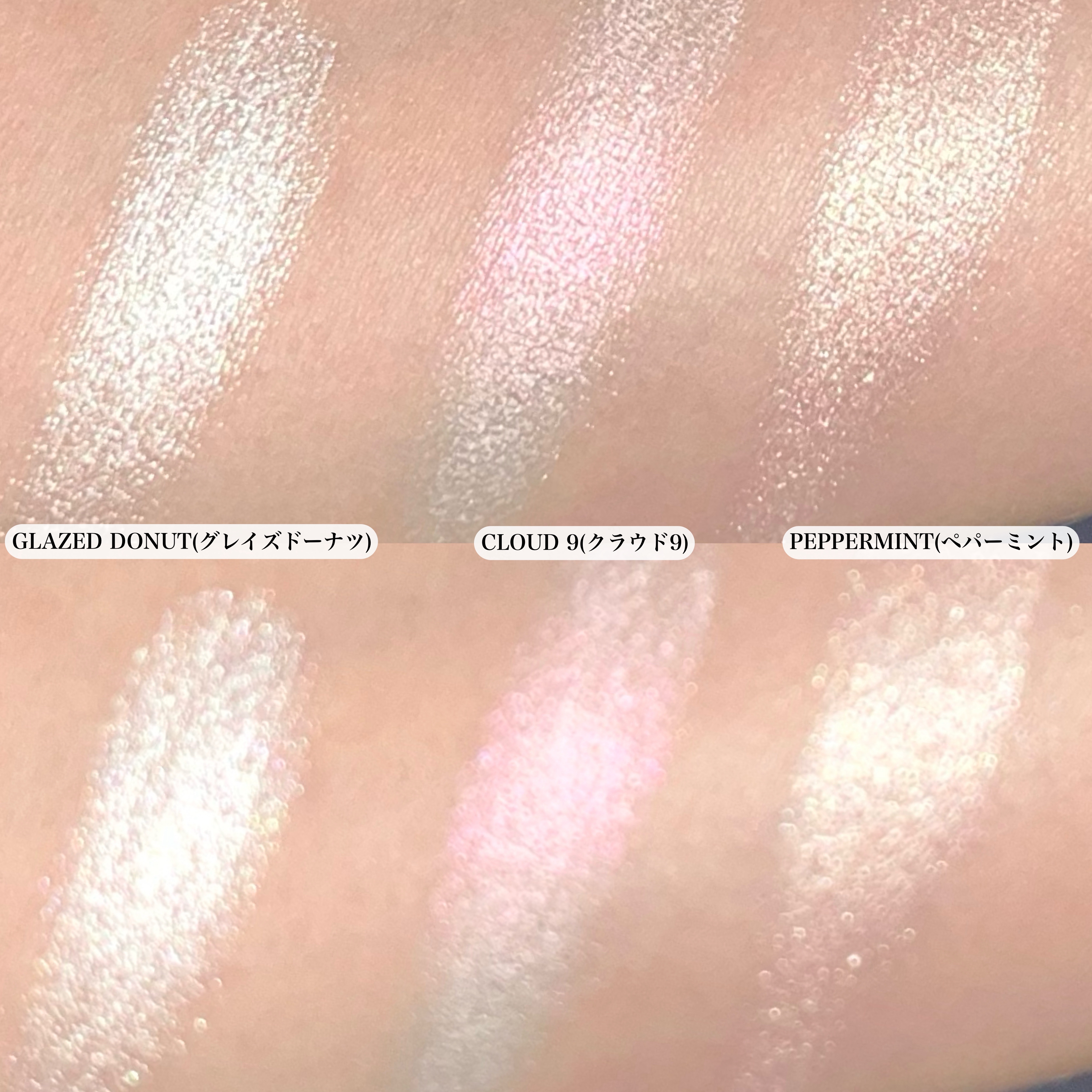 - 【Cloud9】イソドデカン、酸化チタン、マイカ、ジヘプタン酸ネオペンチルグリコール、ステアリン酸亜鉛、タルク、パルミチン酸エチルヘキシル、フェノキシエタノール、エタノール 【Glazed Donut】イソドデカン、マイカ、タルク、酸化チタン、ジヘプタン酸ネオペンチルグリコール、ステアリン酸亜鉛、パルミチン酸エチルヘキシル、フェノキシエタノール、酸化鉄、エタノール、酸化スズ【Pillow Talk】イソドデカン、タルク、マイカ、酸化チタン、ジヘプタン酸ネオペンチルグリコール、ステアリン酸亜鉛、パルミチン酸エチルヘキシル、フェノキシエタノール、酸化鉄、エタノール、赤201、酸化スズ【Star Island】イソドデカン、マイカ、タルク、酸化チタン、ジヘプタン酸ネオペンチルグリコール、ステアリン酸亜鉛、パルミチン酸エチルヘキシル、酸化鉄、フェノキシエタノール、カオリン、石英、エタノール【Peppermint】イソドデカン、マイカ、酸化チタン、ジヘプタン酸ネオペンチルグリコール、タルク、ステアリン酸亜鉛、パルミチン酸エチルヘキシル、酸化鉄、フェノキシエタノール、カオリン、石英、エタノール【Sugar Cookie】イソドデカン、マイカ、酸化チタン、ジヘプタン酸ネオペンチルグリコール、タルク、ステアリン酸亜鉛、パルミチン酸エチルヘキシル、酸化鉄、フェノキシエタノール、石英、カオリン、エタノール【Space Baby】 イソドデカン、マイカ、酸化チタン、ジヘプタン酸ネオペンチルグリコール、ステアリン酸亜鉛、タルク、パルミチン酸エチルヘキシル、フェノキシエタノール、エタノール 【Out of This World】 イソドデカン、酸化チタン、マイカ、ジヘプタン酸ネオペンチルグリコール、ステアリン酸亜鉛、パルミチン酸エチルヘキシル、タルク、フェノキシエタノール、酸化スズ、エタノール 【Rodeo Drive】 イソドデカン、マイカ、タルク、酸化チタン、ステアリン酸亜鉛、ジヘプタン酸ネオペンチルグリコール、パルミチン酸エチルヘキシル、酸化鉄、フェノキシエタノール、酸化スズ、エタノール、赤202【Bali】イソドデカン、タルク、マイカ、酸化チタン、ジヘプタン酸ネオペンチルグリコール、ステアリン酸亜鉛、パルミチン酸エチルヘキシル、フェノキシエタノール、酸化鉄、酸化スズ、エタノール 【Blissful】イソドデカン、マイカ、タルク、ステアリン酸亜鉛、酸化チタン、ジヘプタン酸ネオペンチルグリコール、パルミチン酸エチルヘキシル、酸化鉄、フェノキシエタノール、エタノール