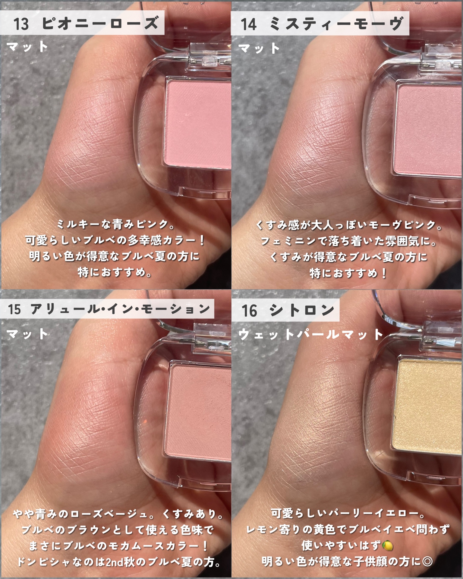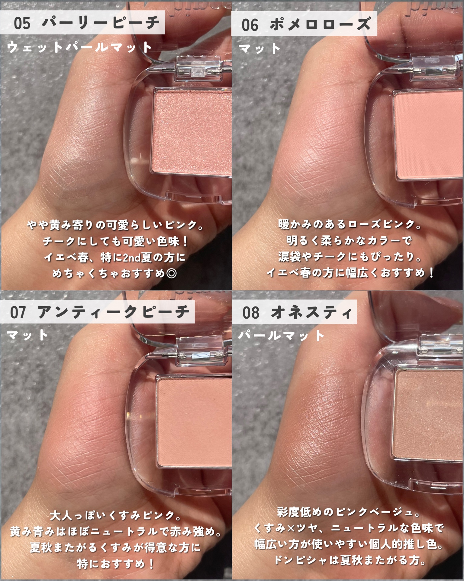 粉質がすごく良くなって、しっとり感とツヤ感が強くなりました! 04が個人的大ヒットで🥹💯 他のチークと混ぜて使うと、ツヤっぽくほわーっとした色付きになって最高! チーク要らない派の方に是非試してみて欲しいカラーです🫶🏻