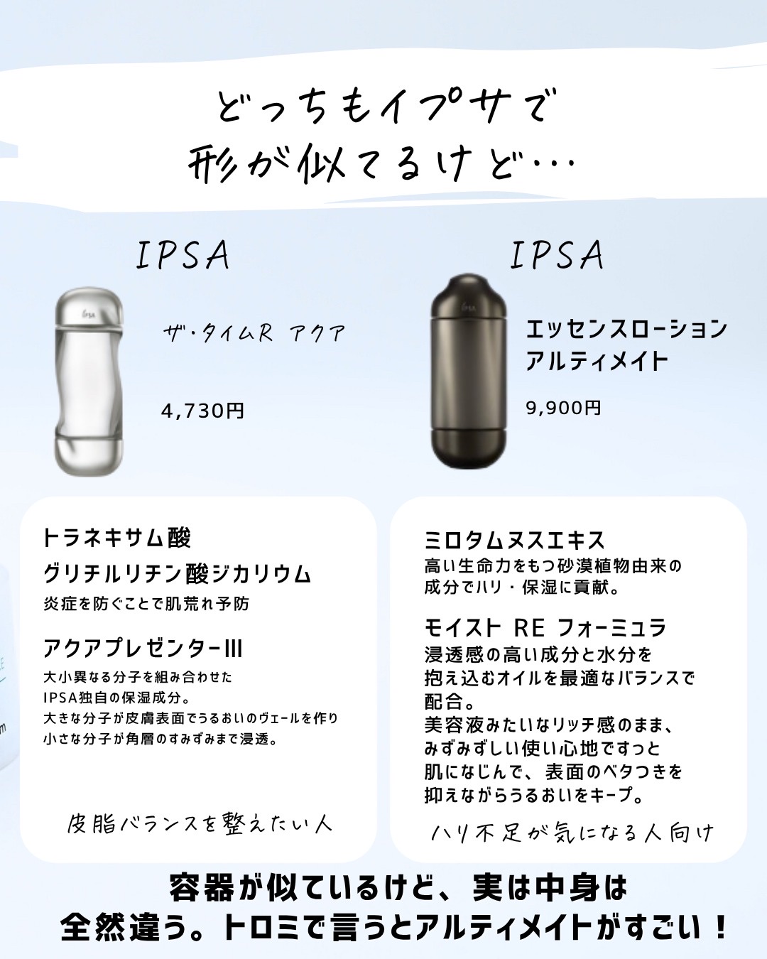 特定の有効成分を試してみたい。美容成分を試したい。そんな時は代用してもいいけど、それって似てるのかな?って思うときが正直ある。 同じ成分があっても実は濃度が違ったり、処方技術が違ったり。技術が違うと使用感も剤型も変わることがあることは知ったうえで使うといいかも。 せっかくプチプラ化粧品を買うならそれはそれで楽しんでほしいから是非念頭にいれてほしいな!!