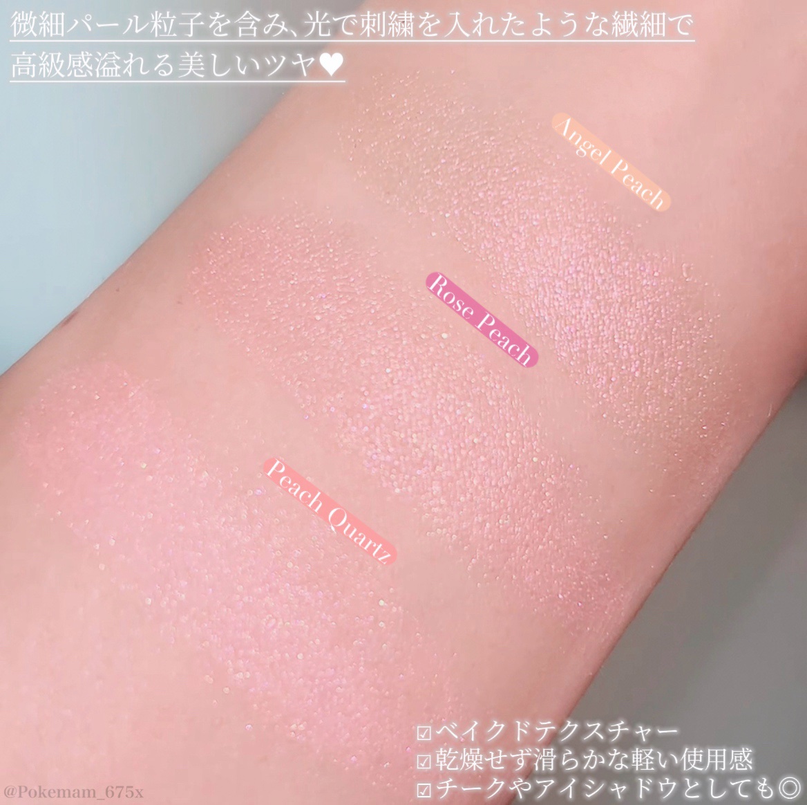 Glint(グリント)人気のハイライターから新色で可愛らしいピーチカラーが3種登場🍑💕ローズピーチはゴールドラメがチラチラして華やか✨エンジェルピーチは偏光感が強くて存在感ある💓ピーチクォーツは肌馴染みがよく3種の中で1番ピーチっぽいカラー🍑...