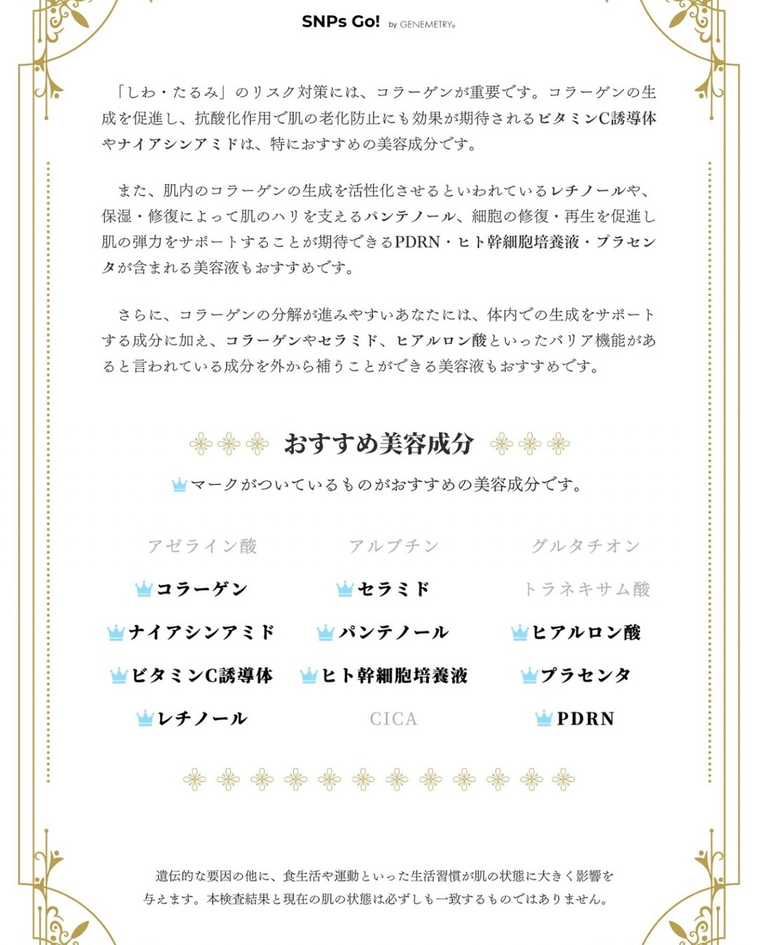 .SerumNavi遺伝的肌タイプ診断SerumNavi(セラムナビ)は、遺伝的に肌に必要な美容成分を提案する新しい遺伝子検査サービス🧬しみ、しわに関係する2種類の遺伝子を検査し、以下の4タイプに分類してくれるよ🔍・ノーリスク型・しわリスク型...