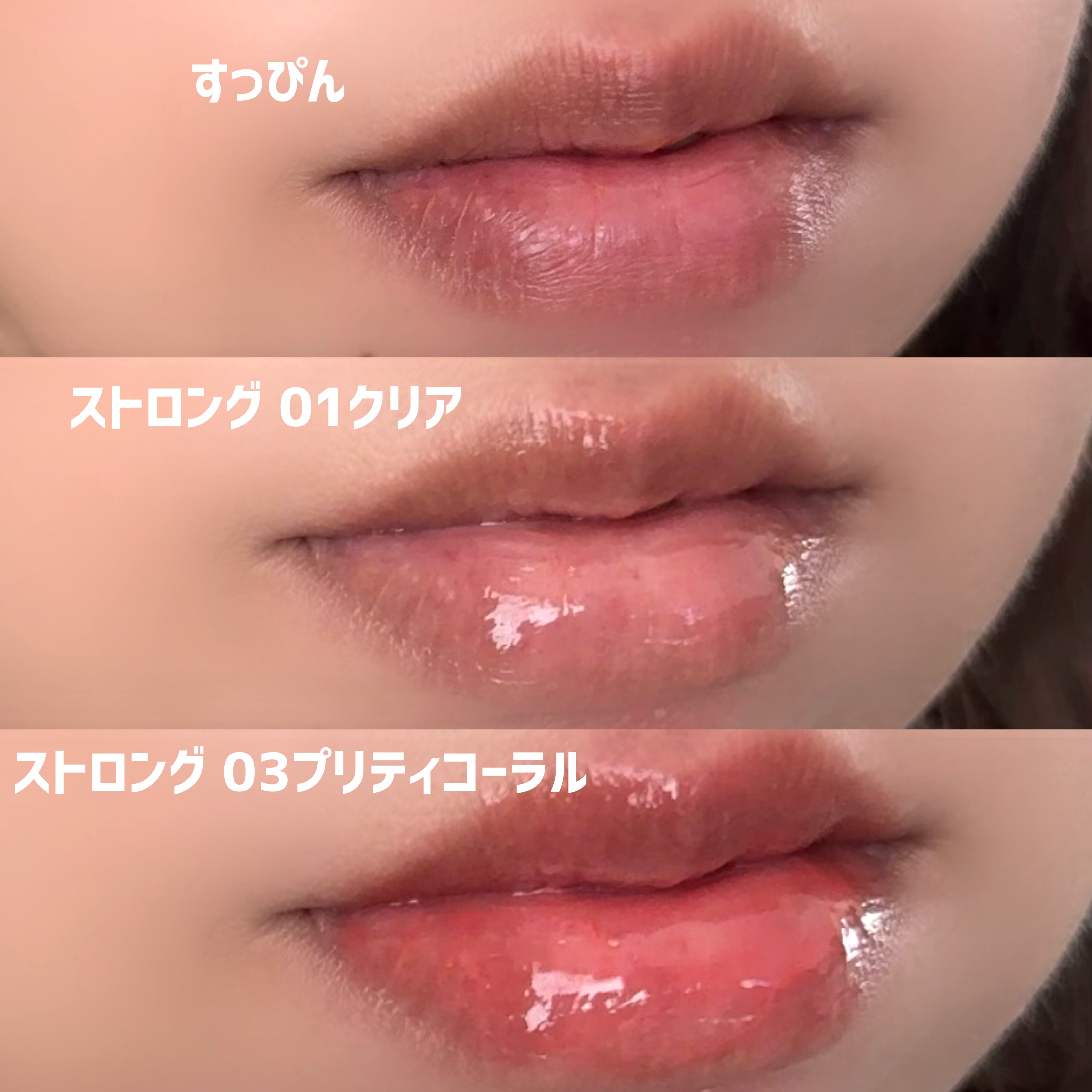 - <ベーシック 01 クリア> 水添ポリイソブテン、リンゴ酸ジイソステアリル、トリ(カプリル酸/カプリン酸)グリセリル、ヒドロキシステアリン酸エチルヘキシル、オクチルドデカノール、ジメチルシリル化シリカ、バニリルブチル、1,2-ヘキサンジオール、マイクロクリスタリンワックス、トリ脂肪酸(C10-18)グリセリル、乳酸メンチル、ヒアルロン酸Na、トリオレイン、香料、ジオレイン酸グリセリル <ストロング 01 クリア> 水添ポリイソブテン、リンゴ酸ジイソステアリル、トリ(カプリル酸/カプリン酸)グリセリル、ヒドロキシステアリン酸エチルヘキシル、オクチルドデカノール、バニリルブチル、ジメチルシリル化シリカ、1,2-ヘキサンジオール、マイクロクリスタリンワックス、乳酸メンチル、トリ脂肪酸(C10-18)グリセリル、ヒアルロン酸Na、トリオレイン、香料、ジオレイン酸グリセリル <ストロング 02 ラバブルピンク> 水添ポリイソブテン、リンゴ酸ジイソステアリル、ヒドロキシステアリン酸エチルヘキシル、トリ(カプリル酸/カプリン酸)グリセリル、オクチルドデカノール、バニリルブチル、ジメチルシリル化シリカ、乳酸メンチル、マイクロクリスタリンワックス、1,2-ヘキサンジオール、トリ脂肪酸(C10-18)グリセリル、ヒアルロン酸Na、トリオレイン、香料、ジオレイン酸グリセリル、酸化チタン、赤202、黄4、赤104(1)、黄5 <ストロング 03 プリティコーラル> 水添ポリイソブテン、リンゴ酸ジイソステアリル、ヒドロキシステアリン酸エチルヘキシル、トリ(カプリル酸/カプリン酸)グリセリル、オクチルドデカノール、バニリルブチル、ジメチルシリル化シリカ、マイクロクリスタリンワックス、1,2-ヘキサンジオール、乳酸メンチル、トリ脂肪酸(C10-18)グリセリル、ヒアルロン酸Na、トリオレイン、香料、ジオレイン酸グリセリル、酸化チタン、黄5、赤202、酸化鉄、黄4