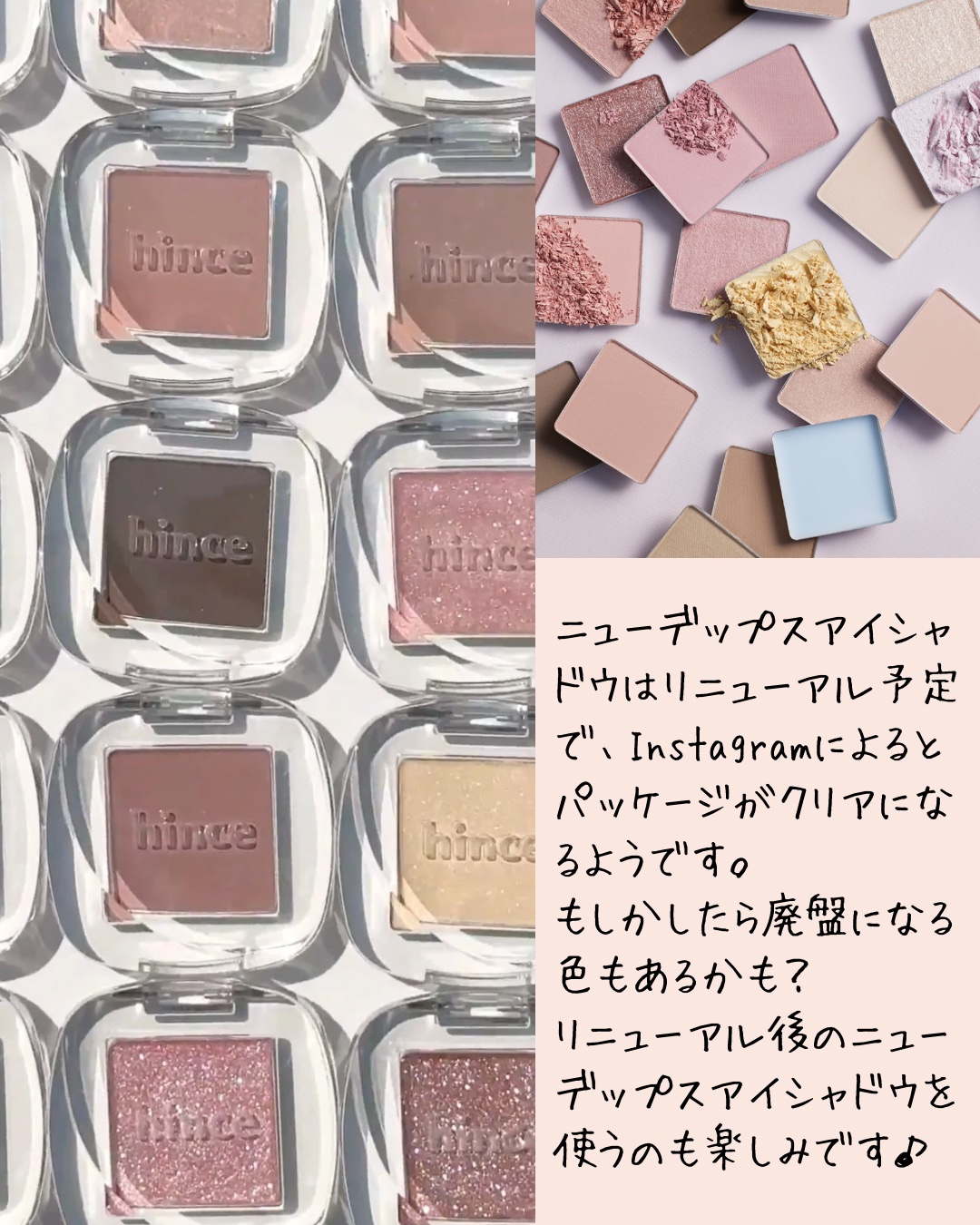 hinceの回しもんかってくらいハマってしまった…笑 まず粉質はサラサラ。サラサラでもしっかり密着・発色。 ニューデップスアイシャドウはこのシリーズ内でも発色やカラー、仕上がりの違いでタイプが4つに分かれてるんだけど私が買ったALLURE IN MOTIONはベルベッドマット。 確かにふわっと肌に馴染むし、使用感も軽い!🤔 単色でもカラーが絶妙だからおしゃれだし雑に指腹で塗ってもかわいい。 単色塗りでもおしゃれ見えだけど上からちょんってラメを重ねても雰囲気変わって楽しめるよ✨