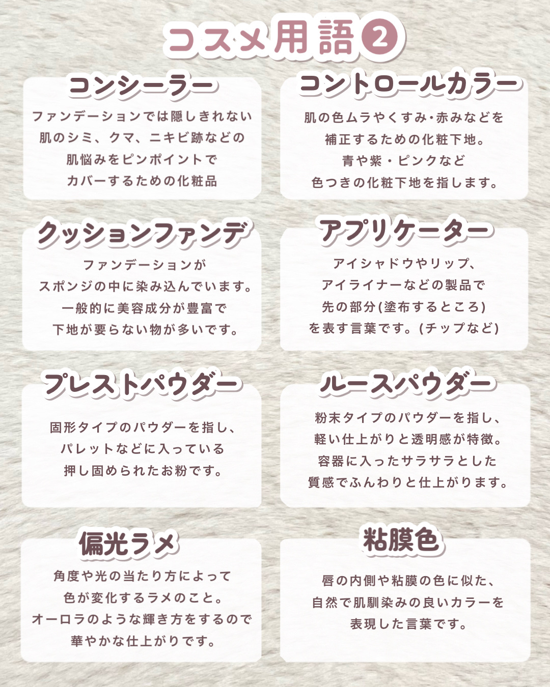 聞いたことがある単語もあったのですが、まだまだ知らないことばかりだなと実感しました…(> <。) これを覚えられたらコスメ好きな友達との会話がもっと楽しくなりそうなので頑張って覚えます!