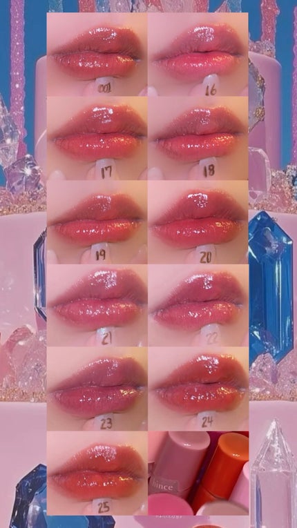 - <R001 ベア> 水、ジフェニルジメチコン、オクチルドデカノール、ビスジグリセリルポリアシルアジペート-2、リンゴ酸ジイソステアリル、トリメチルシロキシフェニルジメチコン、水添ポリイソブテン、ジグリセリン、ポリソルベート60、BG、セチルPEG/PPG-10/1ジメチコン、1,2-ヘキサンジオール、ペンチレングリコール、(アクリル酸ヒドロキシエチル/アクリロイルジメチルタウリンNa)コポリマー、セテアレス-20、スクワラン、フェノキシエタノール、酸化チタン、香料、エチルヘキシルグリセリン、黄5、赤227、イソステアリン酸ソルビタン、水酸化Al、ポリアクリル酸アンモニウム、酢酸トコフェロール、黄4、青1、ヒアルロン酸Na、(アルギニン/リシン)ポリペプチド、加水分解ヒアルロン酸、トコフェロール、アセチルヒアルロン酸Na、ソルビン酸 <R002 ロウローズ> 水、ジフェニルジメチコン、オクチルドデカノール、ビスジグリセリルポリアシルアジペート-2、リンゴ酸ジイソステアリル、トリメチルシロキシフェニルジメチコン、水添ポリイソブテン、ジグリセリン、ポリソルベート60、BG、セチルPEG/PPG-10/1ジメチコン、1,2-ヘキサンジオール、ペンチレングリコール、(アクリル酸ヒドロキシエチル/アクリロイルジメチルタウリンNa)コポリマー、セテアレス-20、スクワラン、フェノキシエタノール、酸化チタン、香料、エチルヘキシルグリセリン、黄5、赤227、イソステアリン酸ソルビタン、酢酸トコフェロール、水酸化Al、ポリアクリル酸アンモニウム、ヒアルロン酸Na、青1、加水分解ヒアルロン酸、(アルギニン/リシン)ポリペプチド、トコフェロール、アセチルヒアルロン酸Na、ソルビン酸 <R003 ロウプリコット> 水、ジフェニルジメチコン、オクチルドデカノール、ビスジグリセリルポリアシルアジペート-2、リンゴ酸ジイソステアリル、トリメチルシロキシフェニルジメチコン、水添ポリイソブテン、ジグリセリン、ポリソルベート60、BG、セチルPEG/PPG-10/1ジメチコン、1,2-ヘキサンジオール、ペンチレングリコール、(アクリル酸ヒドロキシエチル/アクリロイルジメチルタウリンNa)コポリマー、セテアレス-20、スクワラン、フェノキシエタノール、香料、エチルヘキシルグリセリン、酸化チタン、黄5、イソステアリン酸ソルビタン、赤227、酢酸トコフェロール、ヒアルロン酸Na、水酸化Al、ポリアクリル酸アンモニウム、加水分解ヒアルロン酸、青1、(アルギニン/リシン)ポリペプチド、トコフェロール、アセチルヒアルロン酸Na、ソルビン酸 <R004 フィーバー> 水、ジフェニルジメチコン、オクチルドデカノール、リンゴ酸ジイソステアリル、ビスジグリセリルポリアシルアジペート-2、トリメチルシロキシフェニルジメチコン、水添ポリイソブテン、ジグリセリン、ポリソルベート60、BG、セチルPEG/PPG-10/1ジメチコン、1,2-ヘキサンジオール、ペンチレングリコール、(アクリル酸ヒドロキシエチル/アクリロイルジメチルタウリンNa)コポリマー、セテアレス-20、スクワラン、フェノキシエタノール、香料、エチルヘキシルグリセリン、黄5、赤227、イソステアリン酸ソルビタン、酢酸トコフェロール、ヒアルロン酸Na、加水分解ヒアルロン酸、(アルギニン/リシン)ポリペプチド、トコフェロール、アセチルヒアルロン酸Na、ソルビン酸 <R005 ハイビスカス> 水、ジフェニルジメチコン、オクチルドデカノール、ビスジグリセリルポリアシルアジペート-2、リンゴ酸ジイソステアリル、トリメチルシロキシフェニルジメチコン、水添ポリイソブテン、ジグリセリン、ポリソルベート60、BG、セチルPEG/PPG-10/1ジメチコン、1,2-ヘキサンジオール、ペンチレングリコール、アクリル酸ヒドロキシエチル/アクリロイルジメチルタウリンNa)コポリマー、セテアレス-20、スクワラン、フェノキシエタノール、香料、エチルヘキシルグリセリン、赤227、黄5、イソステアリン酸ソルビタン、赤104(1)、酢酸トコフェロール、ヒアルロン酸Na、加水分解ヒアルロン酸、(アルギニン/リシン)ポリペプチド、トコフェロール、アセチルヒアルロン酸Na、ソルビン酸 <R006 ロウグレープ> 水、ジフェニルジメチコン、ビスジグリセリルポリアシルアジペート-2、リンゴ酸ジイソステアリル、オクチルドデカノール、トリメチルシロキシフェニルジメチコン、水添ポリイソブテン、ジグリセリン、ポリソルベート60、BG、セチルPEG/PPG-10/1ジメチコン、1,2-ヘキサンジオール、ペンチレングリコール、(アクリル酸ヒドロキシエチル/アクリロイルジメチルタウリンNa)コポリマー、セテアレス-20、スクワラン、酸化チタン、フェノキシエタノール、香料、エチルヘキシルグリセリン、黄5、赤227、イソステアリン酸ソルビタン、水酸化Al、ポリアクリル酸アンモニウム、酢酸トコフェロール、ヒアルロン酸Na、青1、加水分解ヒアルロン酸、(アルギニン/リシン)ポリペプチド、トコフェロール、アセチルヒアルロン酸Na、ソルビン酸 <R007 チル> 水、ジフェニルジメチコン、オクチルドデカノール、ビスジ