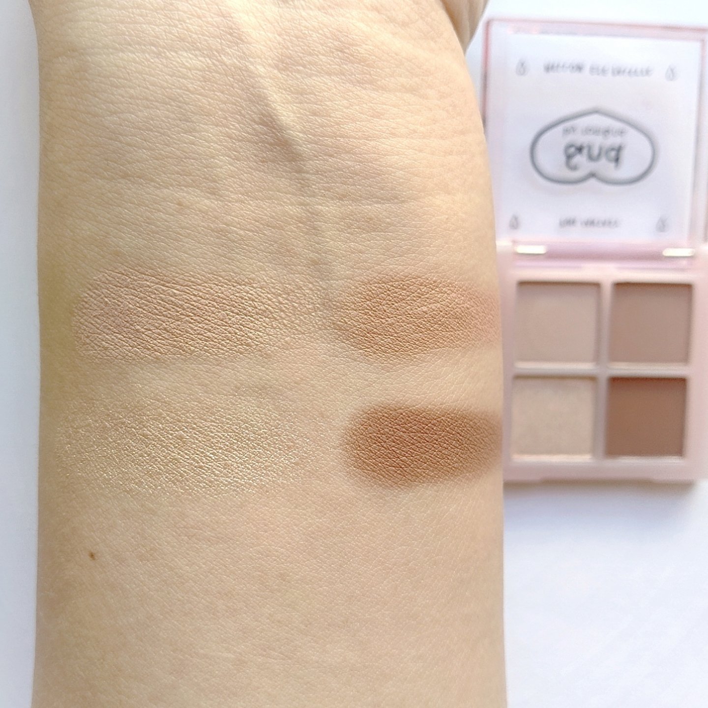 プチプラのクオリティじゃないっ!! 発売前からチェックしていたけれど、ここまで可愛いとは…😆 絶妙カラーで目もとのくすみを飛ばして*明るい印象に🩷 横割りグラデーションでメイクし、立体感をより出したかったので最後に1番左のカラーを上まぶたの真ん中と涙袋にのせています🙆 肌馴染みも良くて粉飛びも感じにくかったです💕 ブラウンの方も店頭に出てたら買おうかな💓