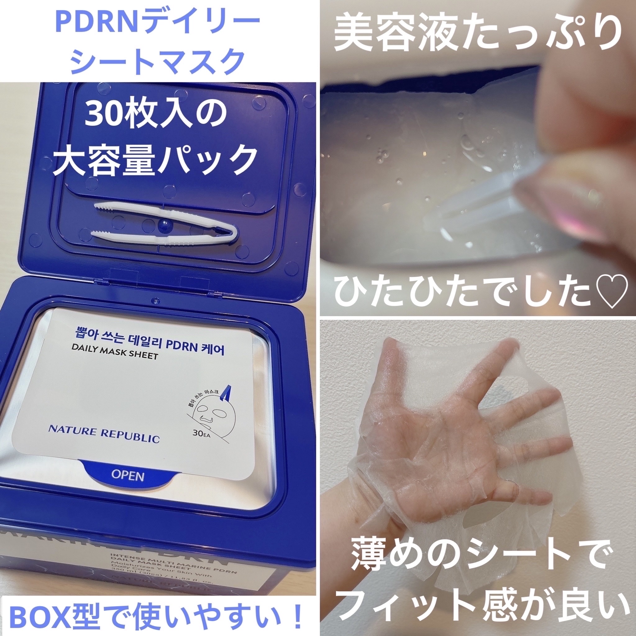 ネイチャーリパブリックPDRNデイリーシートマスク MARINEPDRN前回投稿したビタペアCPDRN水潤セラムはこのデイリーシートマスクを一緒に使用すること効果的なんだって♡エッセンスたっぷりでひったひた!うすいマスクだけどみずみずしくてひ...