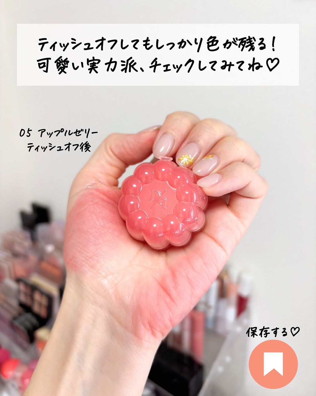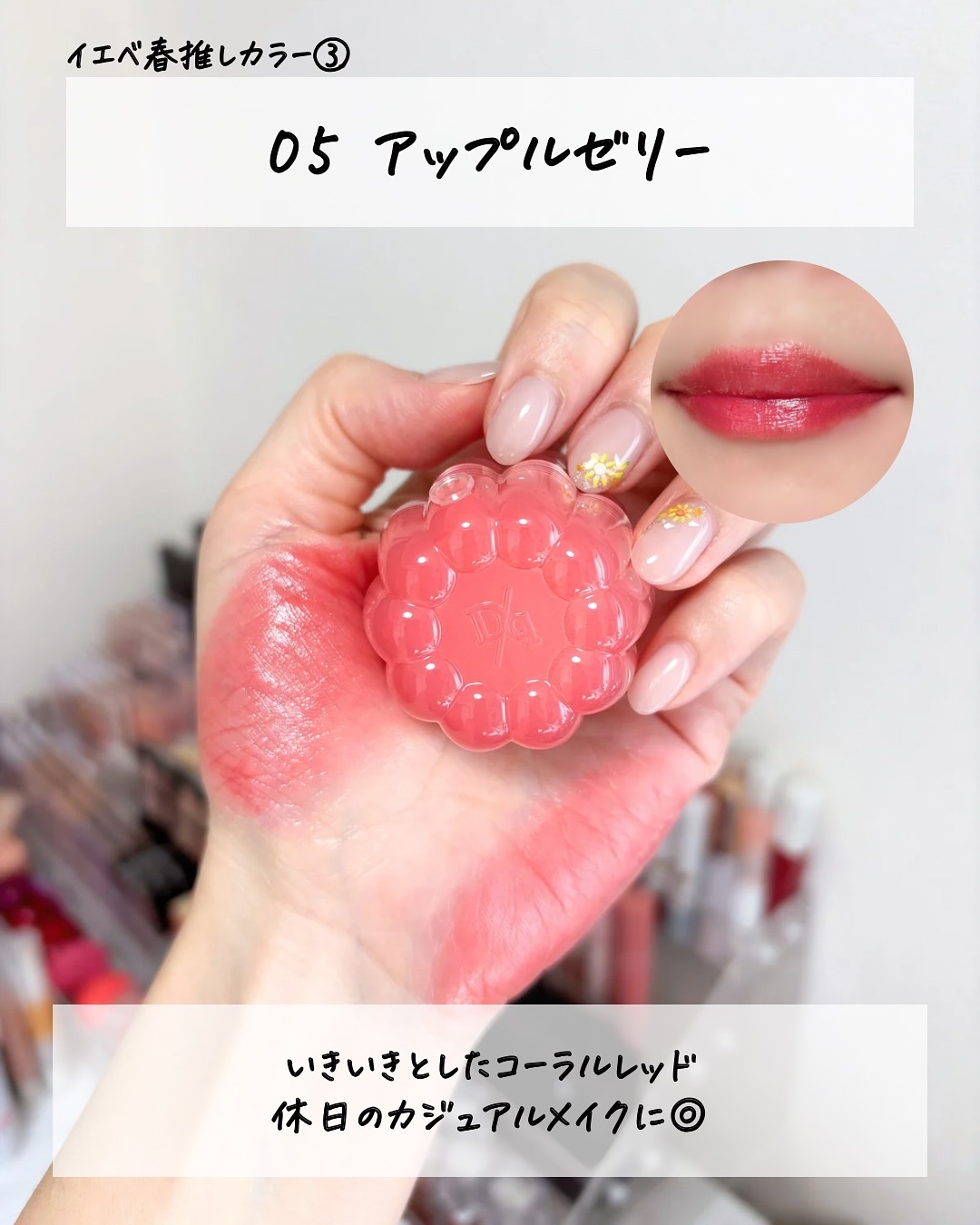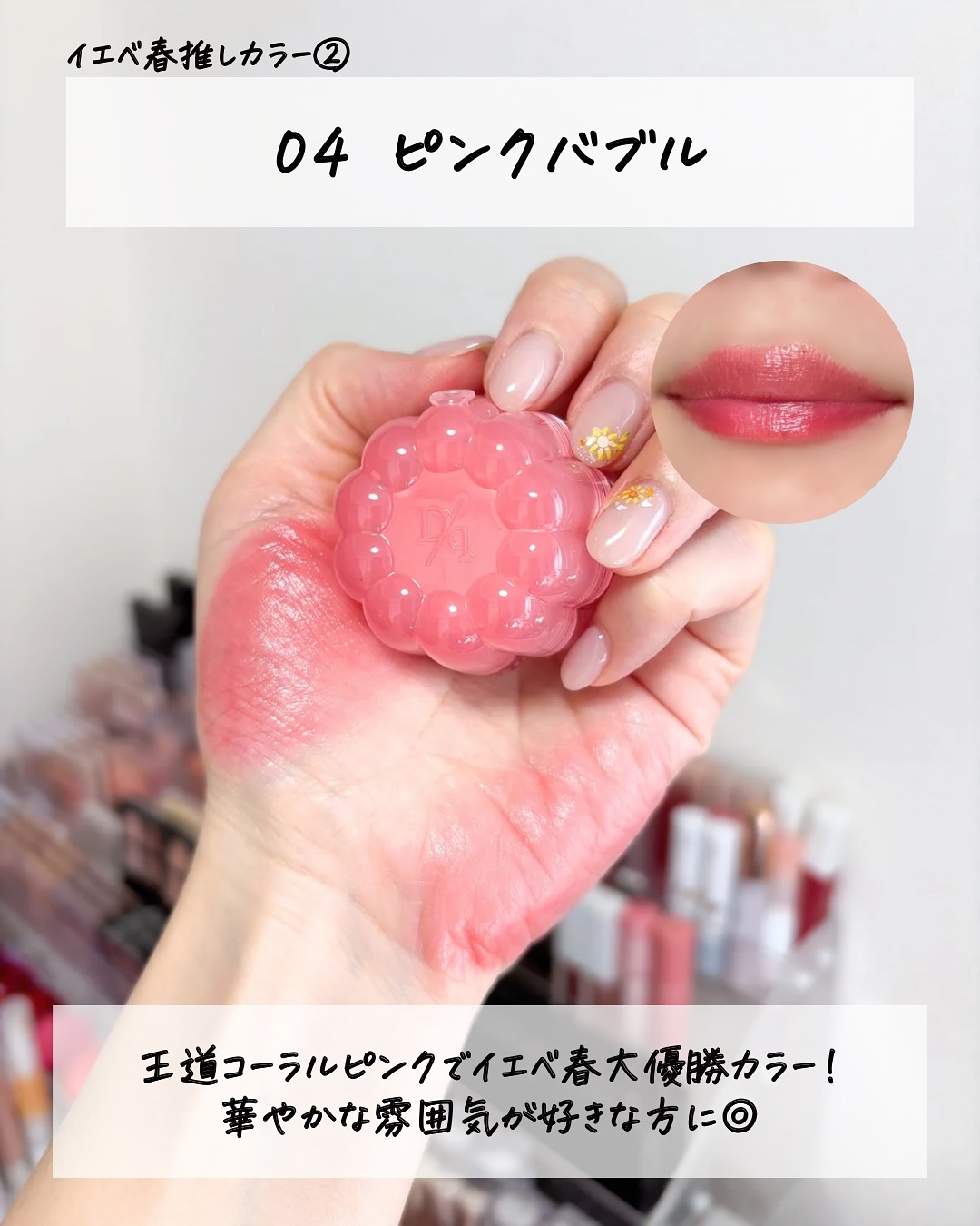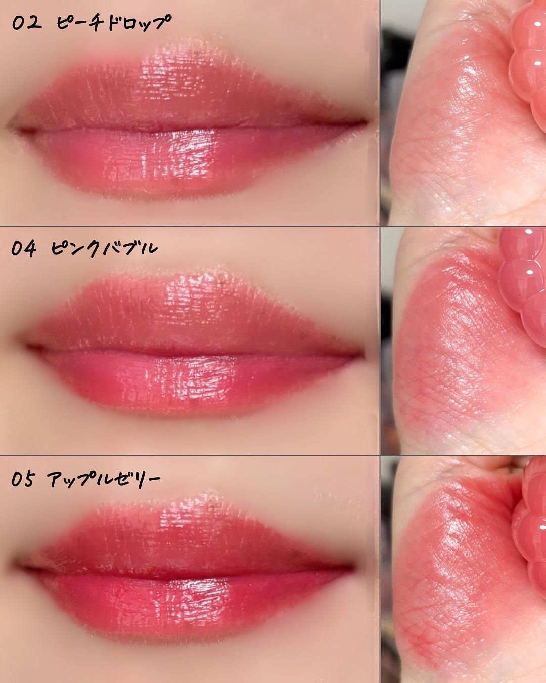 - <01 パパイヤクリーム> 水、ヘキサ(ヒドロキシステアリン酸/ステアリン酸/ロジン酸)ジペンタエリスリチル、トリエチルヘキサノイン、BG、グリセリン、オクチルドデカノール、ポリソルベート60、プロパンジオール、(PEG-240/デシルテトラデセス-20/HDI)コポリマー、1,2-ヘキサンジオール、セテアレス-20、フェノキシエタノール、エチルセルロース、カプリル酸グリセリル、(アクリル酸ヒドロキシエチル/アクリロイルジメチルタウリンNa)コポリマー、トリイソステアリン酸ポリグリセリル-2、リンゴ酸ジイソステアリル、酸化チタン、スクワラン、(アクリレーツ/アクリル酸アルキル(C10-30))クロスポリマー、トロメタミン、香料、エチルヘキシルグリセリン、黄4、赤104(1)、黄5、赤227、エチレンジアミンジコハク酸3Na、イソステアリン酸ソルビタン、ジイソステアリン酸ポリグリセリル-2、リナロール、ラウリン酸K、トコフェロール、青1 <02 ピーチドロップ> 水、ヘキサ(ヒドロキシステアリン酸/ステアリン酸/ロジン酸)ジペンタエリスリチル、トリエチルヘキサノイン、BG、グリセリン、オクチルドデカノール、ポリソルベート60、プロパンジオール、(PEG-240/デシルテトラデセス-20/HDI)コポリマー、1,2-ヘキサンジオール、セテアレス-20、フェノキシエタノール、リンゴ酸ジイソステアリル、酸化チタン、エチルセルロース、カプリル酸グリセリル、(アクリル酸ヒドロキシエチル/アクリロイルジメチルタウリンNa)コポリマー、トリイソステアリン酸ポリグリセリル-2、スクワラン、(アクリレーツ/アクリル酸アルキル(C10-30))クロスポリマー、トロメタミン、香料、エチルヘキシルグリセリン、黄5、赤104(1)、赤227、黄4、エチレンジアミンジコハク酸3Na、イソステアリン酸ソルビタン、ジイソステアリン酸ポリグリセリル-2、青1、リナロール、ラウリン酸K、トコフェロール <03 ハニーマンゴ> 水、ヘキサ(ヒドロキシステアリン酸/ステアリン酸/ロジン酸)ジペンタエリスリチル、トリエチルヘキサノイン、BG、グリセリン、オクチドデカノール、ポリソルベート60、プロパンジオール、(PEG-240/デシルテトラデセス-20/HDI)コポリマー、1,2-ヘキサンジオール、セテアレス-20、フェノキシエタノール、エチルセルロース、リンゴ酸ジイソステアリル、カプリル酸グリセリル、酸化チタン、(アクリル酸ヒドロキシエチル/アクリロイルジメチルタウリンNa)コポリマー、トリイソステアリン酸ポリグリセリル-2、スクワラン、(アクリレーツ/アクリル酸アルキル(C10-30))クロスポリマー、トロメタミン、香料、エチルヘキシルグリセリン、赤104(1)、黄5、赤227、黄4、エチレンジアミンジコハク酸3Na、イソステアリン酸ソルビタン、ジイソステアリン酸ポリグリセリル-2、リナロール、ラウリン酸K、トコフェロール、青1 <04 ピンクバブル> 水、ヘキサ(ヒドロキシステアリン酸/ステアリン酸/ロジン酸)ジペンタエリスリチル、トリエチルヘキサノイン、BG、グリセリン、オクチドデカノール、ポリソルベート60、プロパンジオール、(PEG-240/デシルテトラデセス-20/HDI)コポリマー、1,2-ヘキサンジオール、セテアレス-20、フェノキシエタノール、エチルセルロース、カプリル酸グリセリル、トリイソステアリン酸ポリグリセリル-2、(アクリル酸ヒドロキシエチル/アクリロイルジメチルタウリンNa)コポリマー、スクワラン、(アクリレーツ/アクリル酸アルキル(C10-30))クロスポリマー、リンゴ酸ジイソステアリル、酸化チタン、トロメタミン、香料、エチルヘキシルグリセリン、赤104(1)、酸化鉄、赤227、エチレンジアミンジコハク酸3Na、ジイソステアリン酸ポリグリセリル-2、黄4、イソステアリン酸ソルビタン、黄5、リナロール、ラウリン酸K、トコフェロール <05 アップルゼリー> 水、ヘキサ(ヒドロキシステアリン酸/ステアリン酸/ロジン酸)ジペンタエリスリチル、トリエチルヘキサノイン、BG、グリセリン、オクチドデカノール、ポリソルベート60、プロパンジオール、(PEG-240/デシルテトラデセス-20/HDI)コポリマー、1,2-ヘキサンジオール、セテアレス-20、フェノキシエタノール、トリイソステアリン酸ポリグリセリル-2、エチルセルロース、カプリル酸グリセリル、(アクリル酸ヒドロキシエチル/アクリロイルジメチルタウリンNa)コポリマー、スクワラン、(アクリレーツ/アクリル酸アルキル(C10-30))クロスポリマー、トロメタミン、香料、リンゴ酸ジイソステアリル、酸化チタン、エチルヘキシルグリセリン、赤227、黄5、赤104(1)、黄4、エチレンジアミンジコハク酸3Na、ジイソステアリン酸ポリグリセリル-2、イソステアリン酸ソルビタン、リナロール、ラウリン酸K、トコフェロール、青1 <06 クアバキャンディ> 水、ヘキサ(ヒドロキシステアリン酸/ステアリン酸/ロジン酸)ジペンタエリスリチル、トリエチルヘキサノイン、BG、グリセリン、オクチドデカノール、ポリソルベート60、プロパンジオール、(PEG-240/デシルテトラデセス-20/HDI)コポリマー、1,2-ヘキサンジオール、セテアレス-20、フェノ
